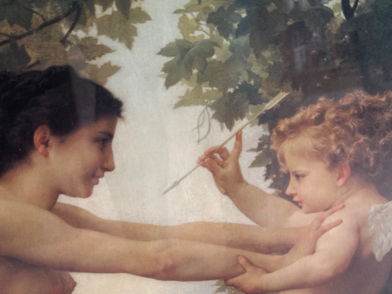 Framed Print – “Young Girl Defending Herself Against Eros” A framed museum reproduction print of “Jeune Fille Se Défendant Contre L’Amour” (Young Girl Defending Herself Against Eros) by William-Adolphe Bouguereau (French, 1825–1905). The artwork depicts a young woman playfully resisting Cupid’s arrow in a lush outdoor setting, one of Bouguereau’s celebrated neoclassical works blending mythological subject matter with delicate realism.
