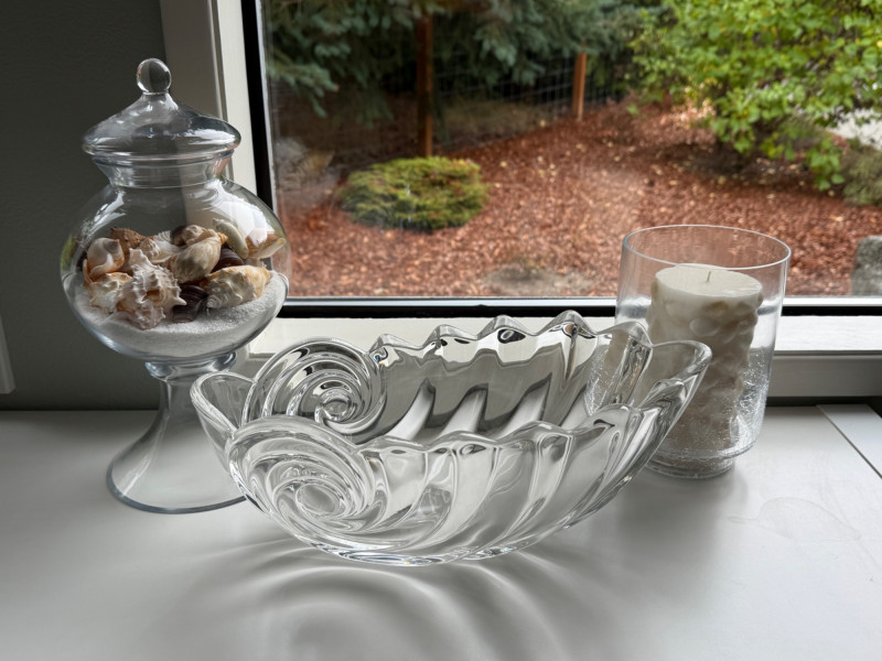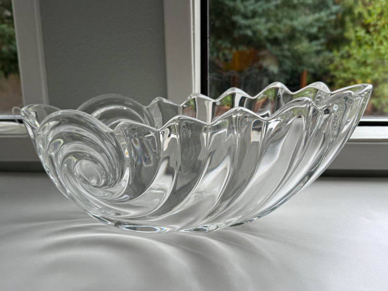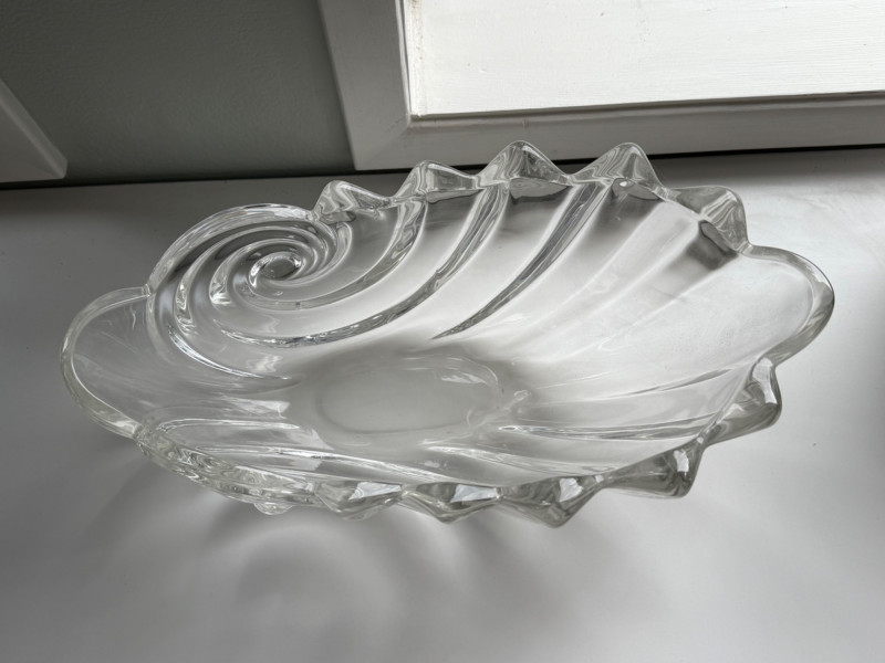 Likely Mikasa Crystal Nautilus Shell Bowl – clear crystal centerpiece bowl in nautilus shell form with spiral and scalloped design. Approx. 14 in. wide. Unmarked, but style is consistent with Mikasa.