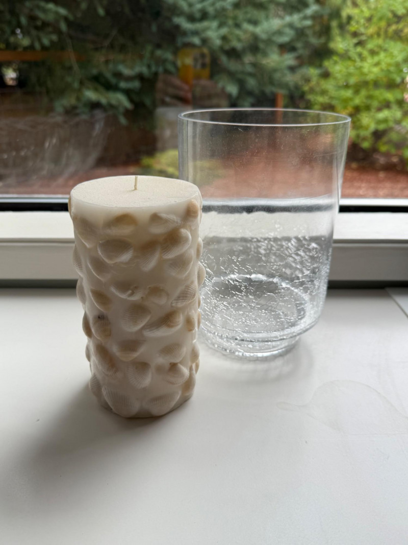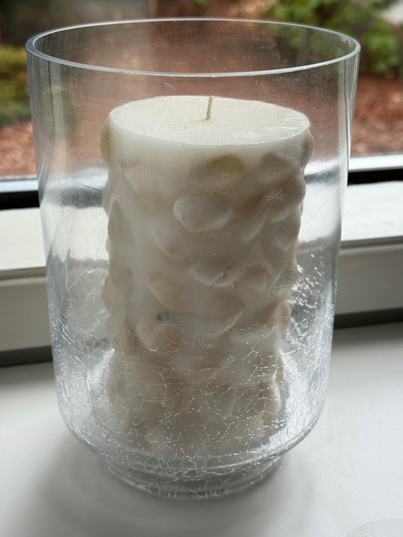 Seashell Candle in Crackle Glass Cylinder – pillar candle embedded with small natural seashells, set inside a clear crackle glass holder.