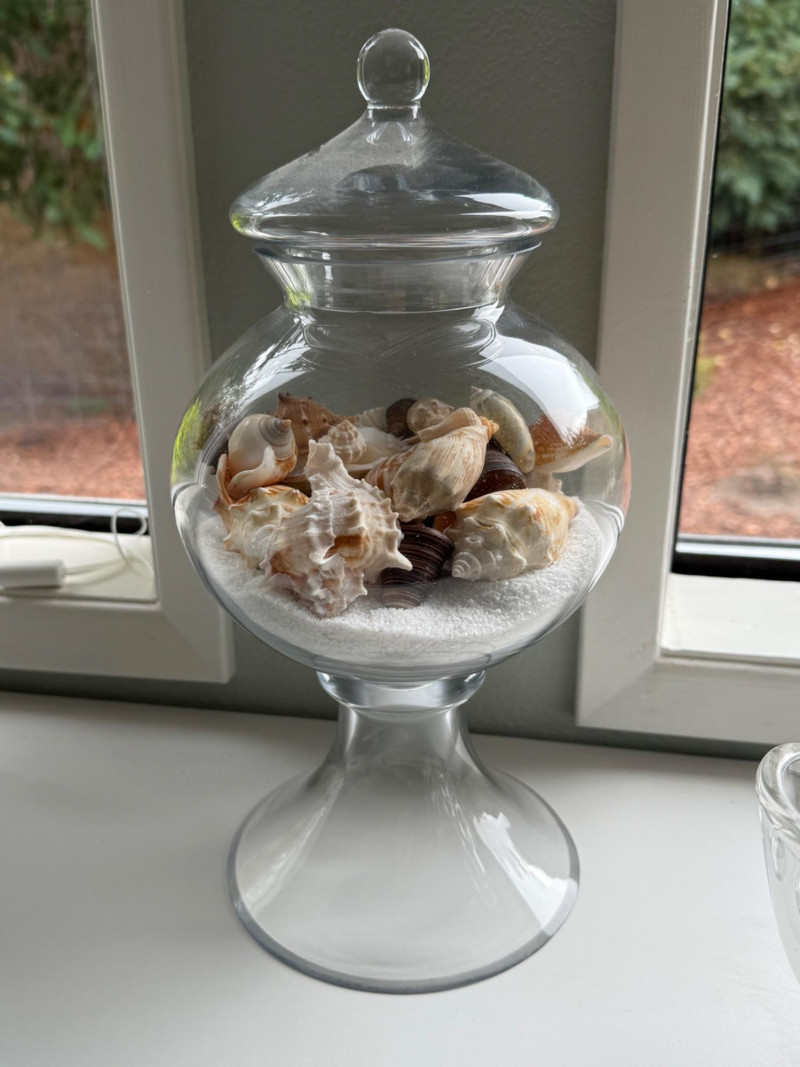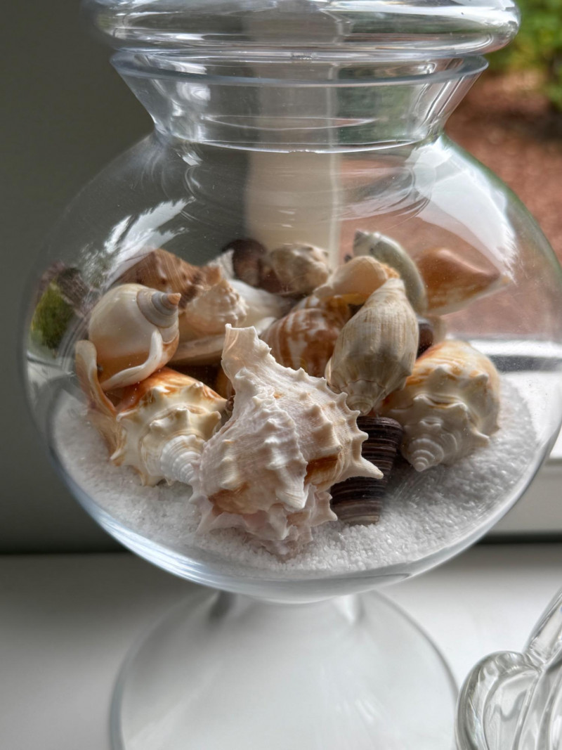 Glass Apothecary Jar with Seashells – footed lidded jar filled with assorted natural seashells over a sand base.
