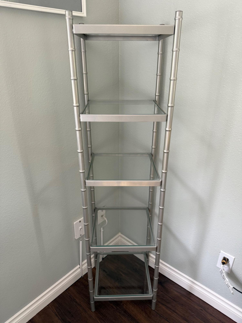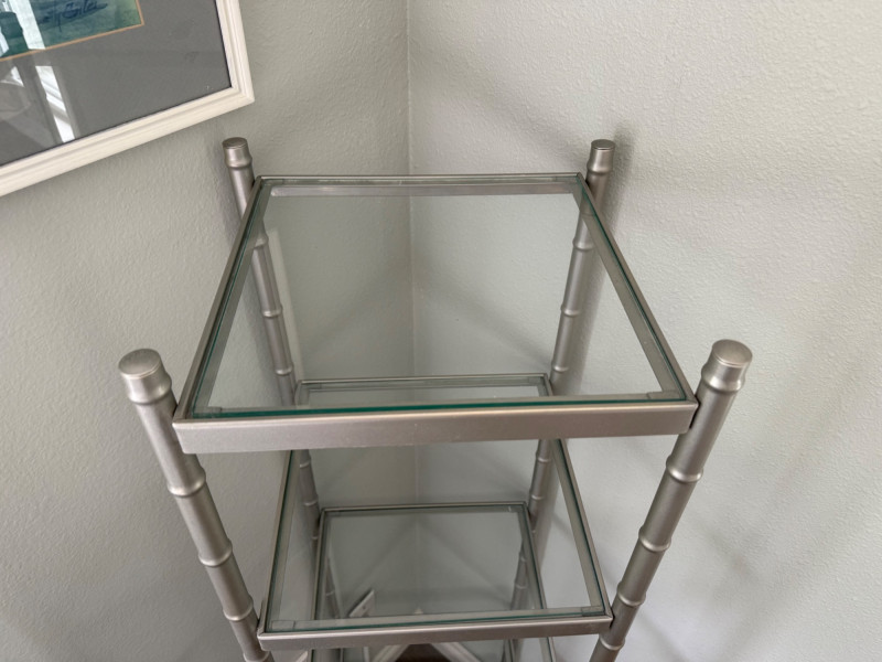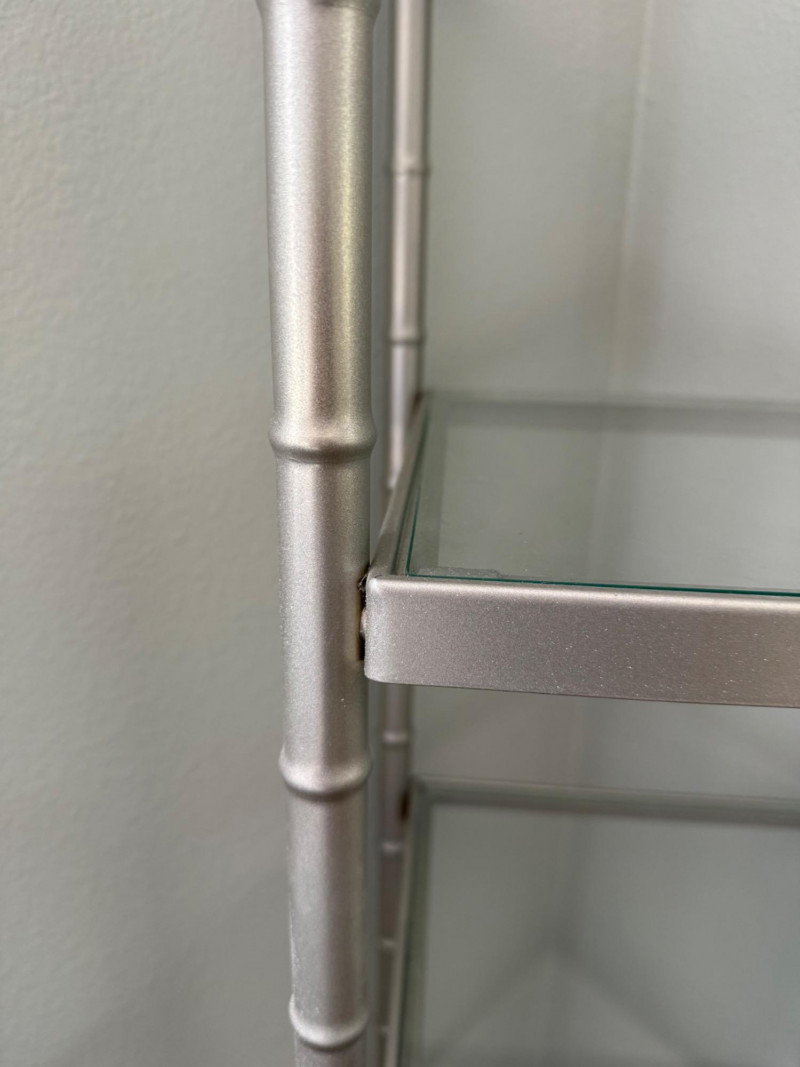 Silver Metal & Glass Etagere Shelf A sleek and modern etagere featuring four clear glass shelves supported by a silver-tone metal frame designed with bamboo-style posts. Its compact footprint and open design make it an excellent choice for displaying collectibles, books, or décor in any room.