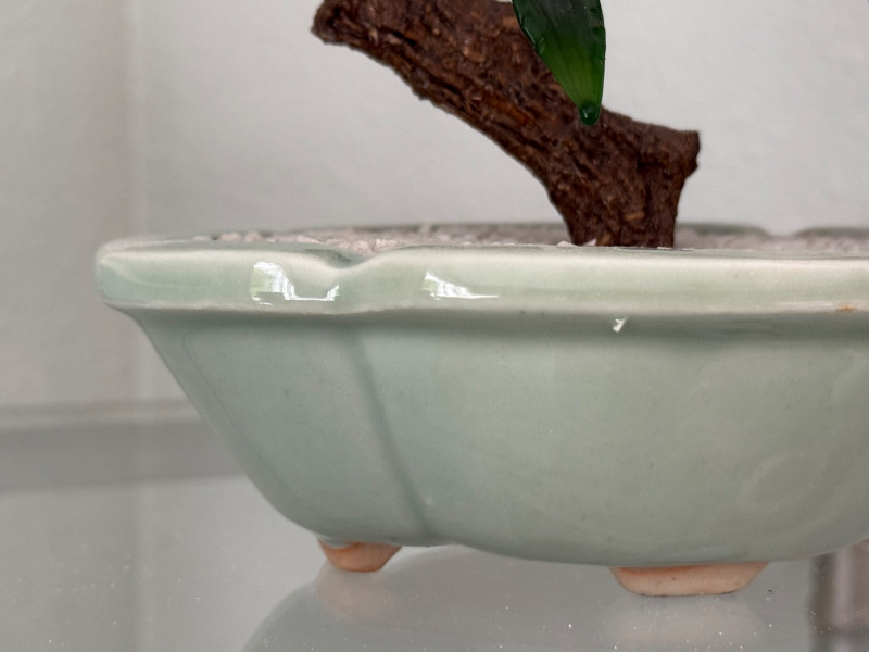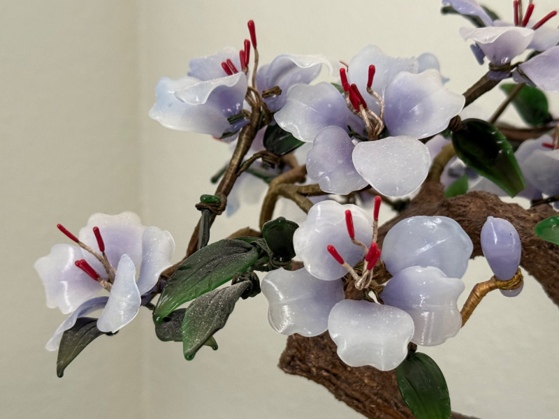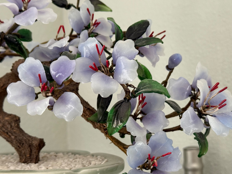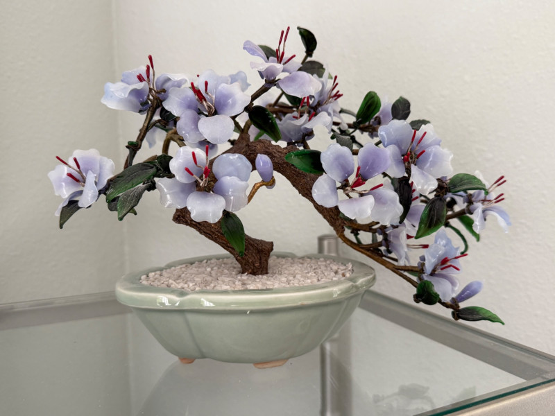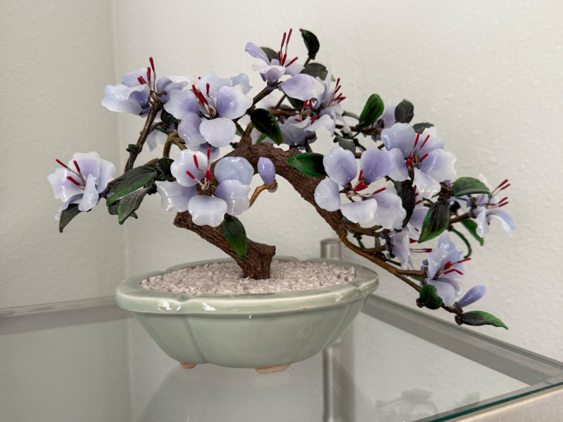 Vintage Glass Bonsai Tree with Lavender Blossoms in Celadon Pot A crafted decorative bonsai tree featuring delicate glass blossoms in lavender and white with red stamen accents, paired with green glass leaves. The branches are wired for shaping and support, mounted in a celadon-style ceramic pot filled with crushed white quartz chips.
