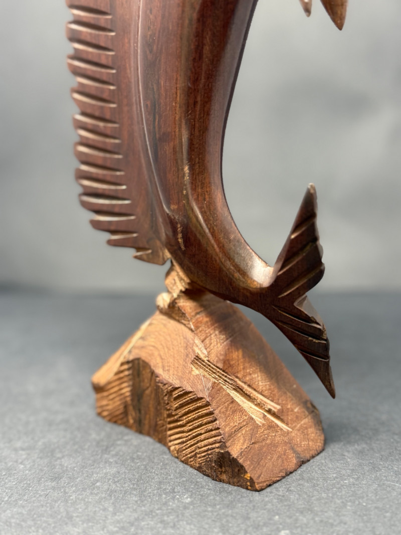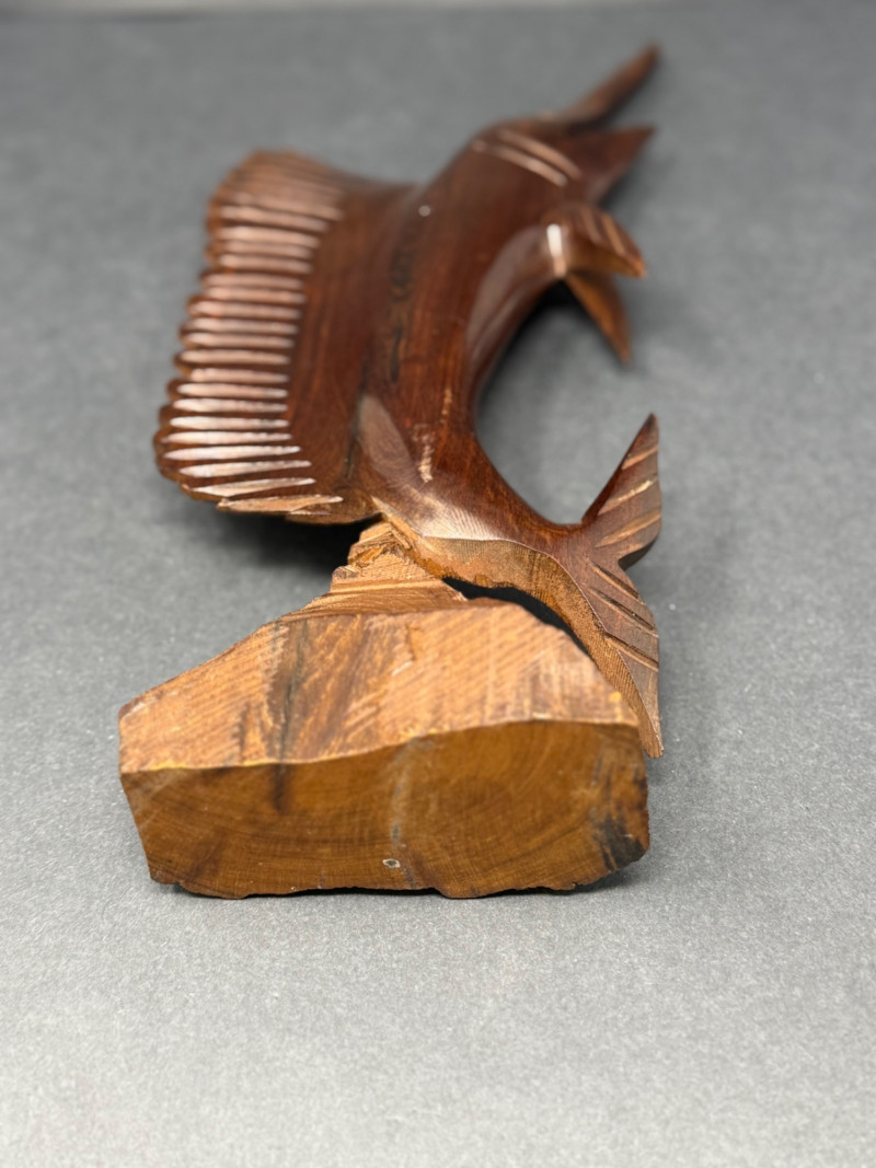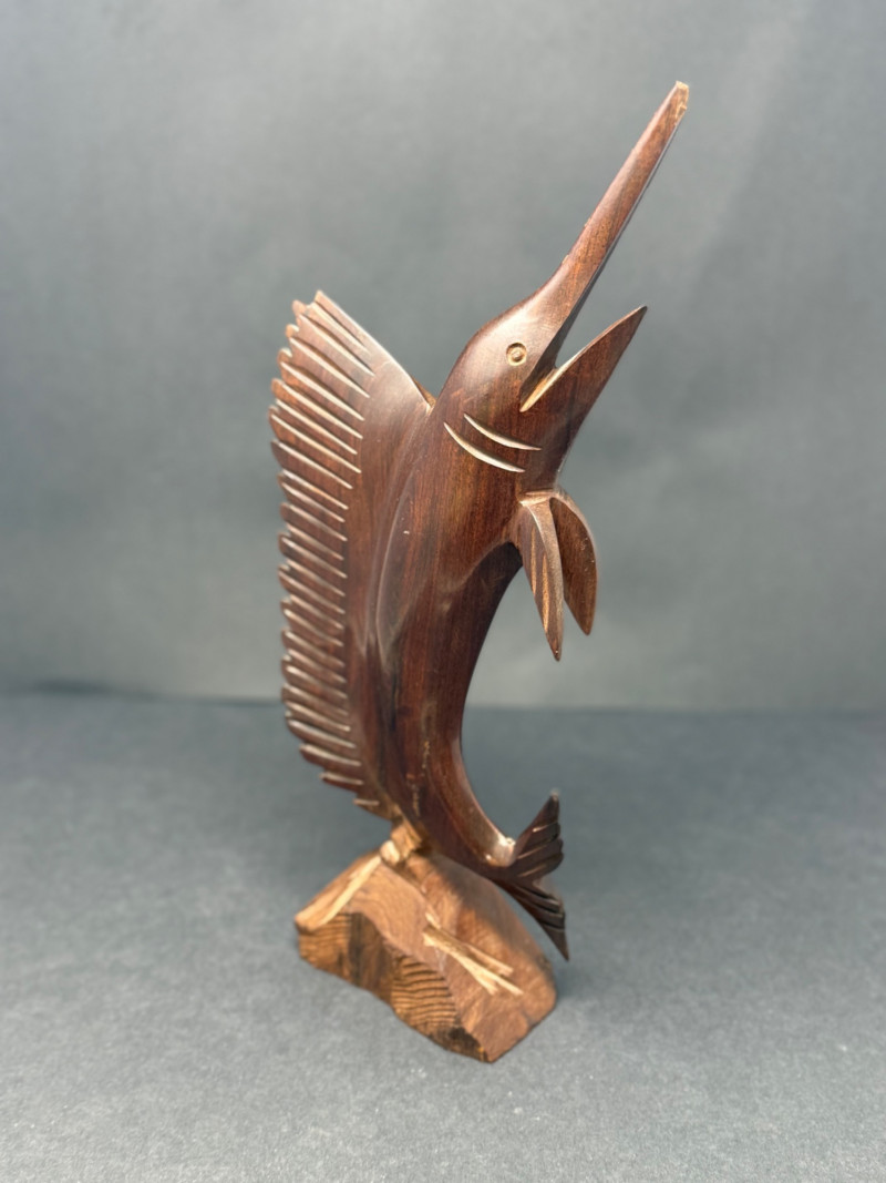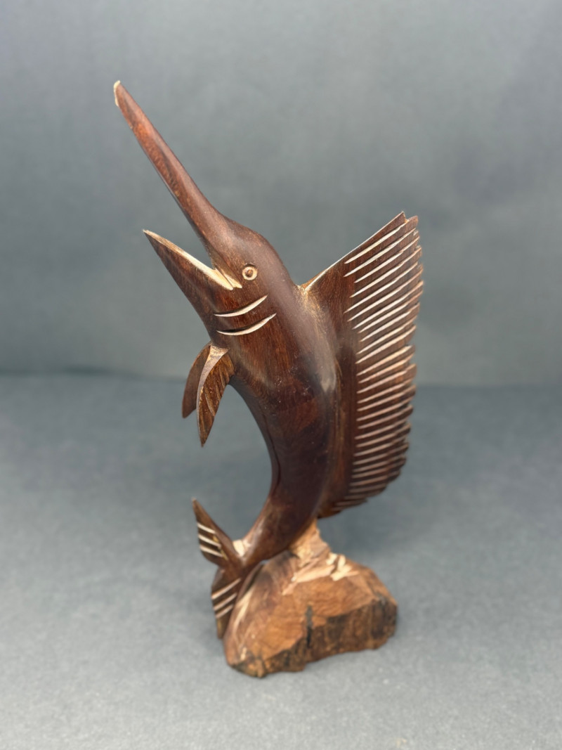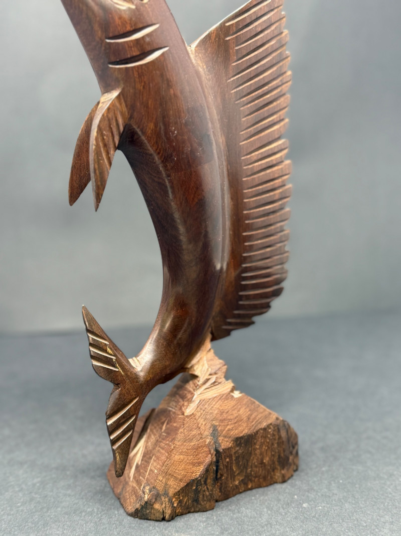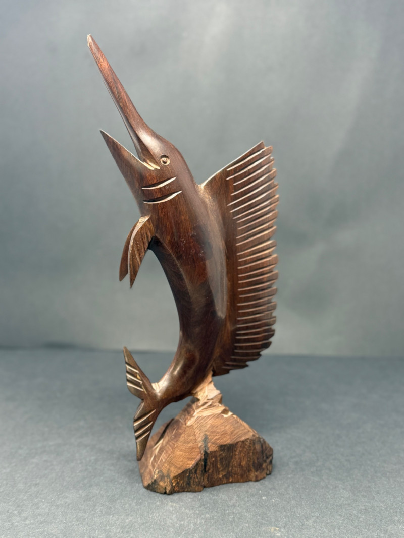 Mid-Century Hand-Carved Ironwood Sailfish Sculpture – Nautical Décor A striking mid-century hand-carved sailfish sculpture crafted from solid ironwood, known for its rich dark tone and durability. The figure captures the power and grace of the leaping sailfish with an elongated bill, dramatic dorsal fin, and finely detailed carving rising from a natural wood base. Material: Solid ironwood Era: Mid-20th century, circa 1950s–70s Likely Origin: Philippines or Indonesia, regions renowned for skilled ironwood carvings during this period Design: Leaping sailfish / marlin with detailed fins and streamlined form Dimensions: approx. 12–16" H x 4–6" W x 3–5" D Ironwood carvings were prized in mid-century décor for their weight, polish, and deep coloration. Sailfish figures, in particular, became popular symbols of sport fishing, maritime freedom, and nautical adventure. This example is both a statement piece and a timeless collectible.