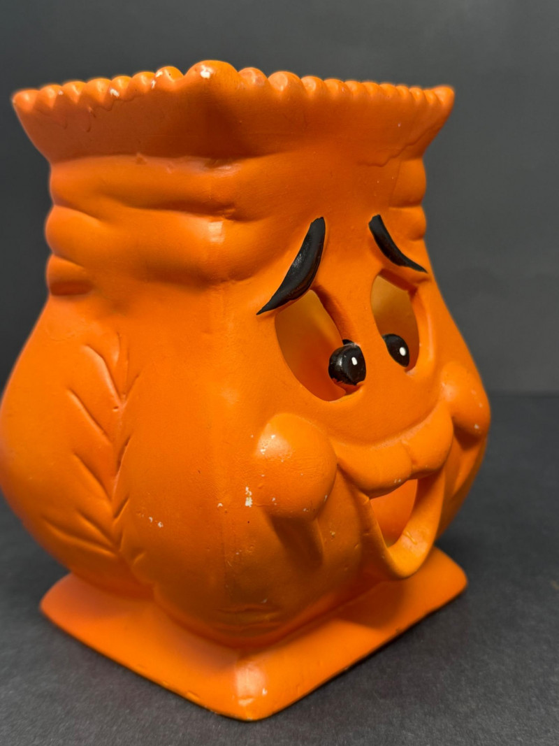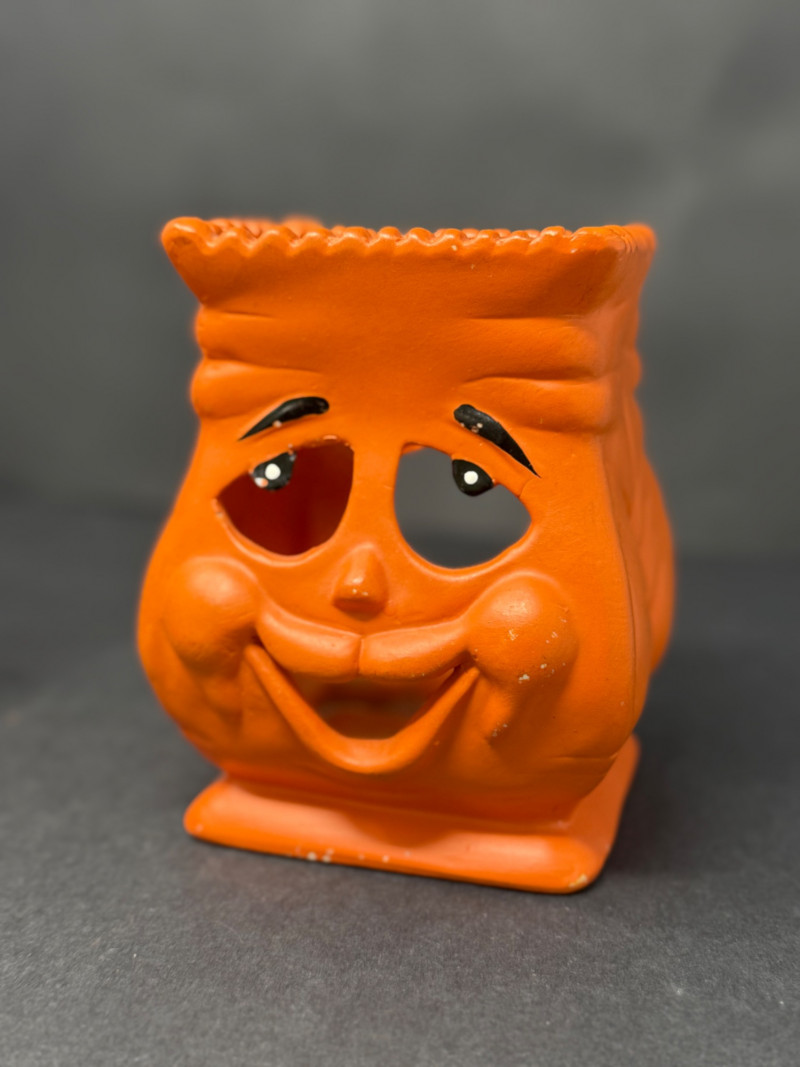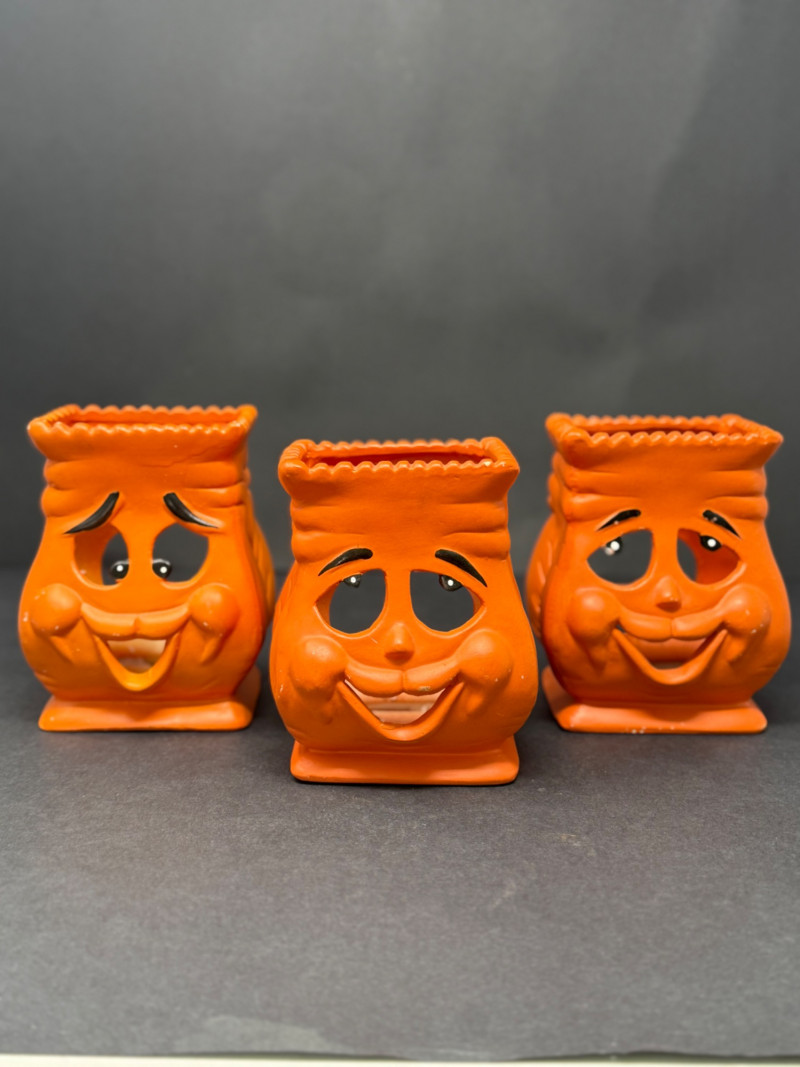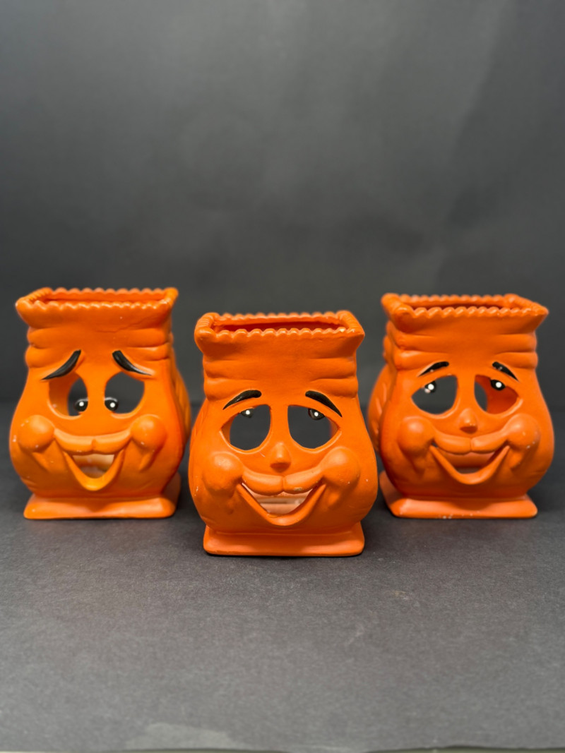 Vintage House of Lloyd Halloween Jack O’ Lantern Bag Candle Holders – Set of 3 Charming and nostalgic, this set of three vintage House of Lloyd Halloween candle holders brings a playful touch to seasonal décor. Each holder is designed in the shape of a grinning jack-o’-lantern candy bag, with cut-out eyes and mouths that allow candlelight to flicker through for a delightfully spooky effect. Their whimsical, slightly mischievous expressions capture the fun and lighthearted side of Halloween decorating. Maker: House of Lloyd Era: Likely 1980s–1990s Material: Ceramic with painted finish Design: Orange candy-bag style jack-o’-lanterns with expressive faces Dimensions: Approx. 5–6" tall, 3–4" wide, 3–4" deep. Some minor chips but no major body damage Historical Note: