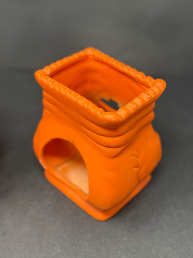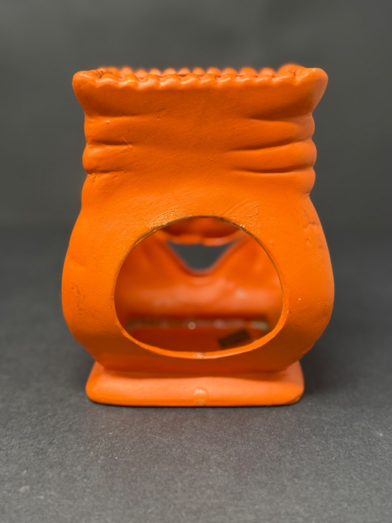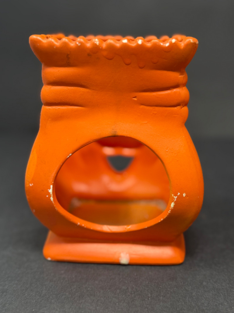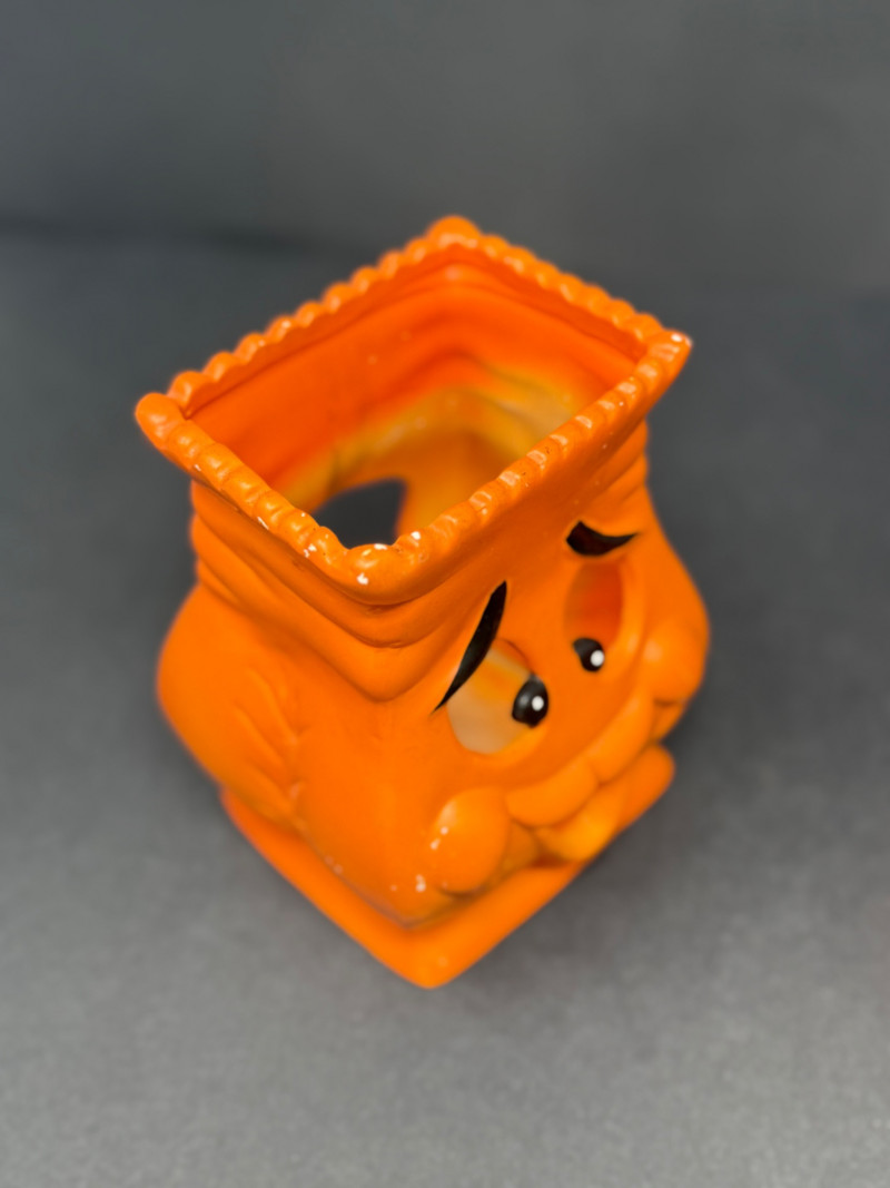 Vintage House of Lloyd Halloween Jack O’ Lantern Bag Candle Holders – Set of 3 Charming and nostalgic, this set of three vintage House of Lloyd Halloween candle holders brings a playful touch to seasonal décor. Each holder is designed in the shape of a grinning jack-o’-lantern candy bag, with cut-out eyes and mouths that allow candlelight to flicker through for a delightfully spooky effect. Their whimsical, slightly mischievous expressions capture the fun and lighthearted side of Halloween decorating. Maker: House of Lloyd Era: Likely 1980s–1990s Material: Ceramic with painted finish Design: Orange candy-bag style jack-o’-lanterns with expressive faces Dimensions: Approx. 5–6" tall, 3–4" wide, 3–4" deep. Some minor chips but no major body damage Historical Note: