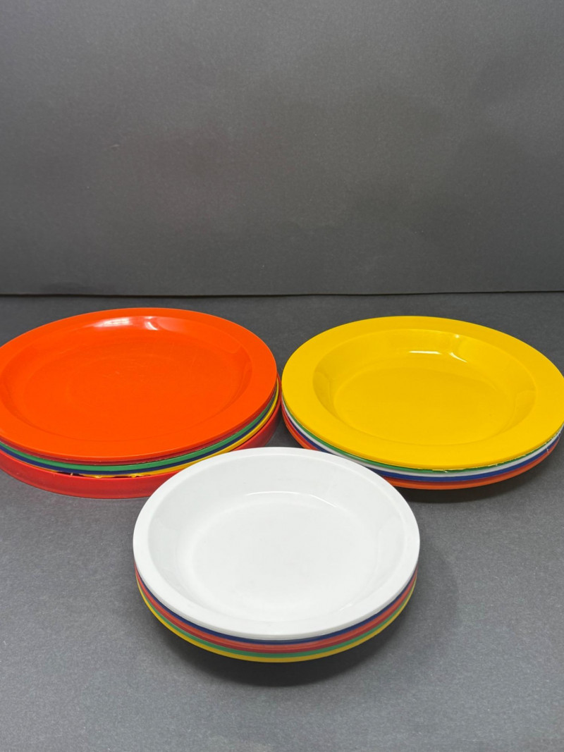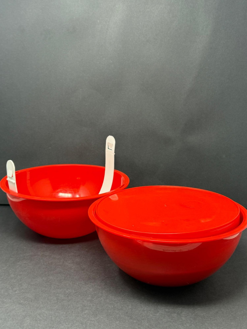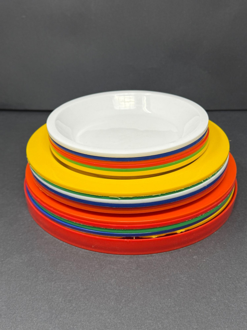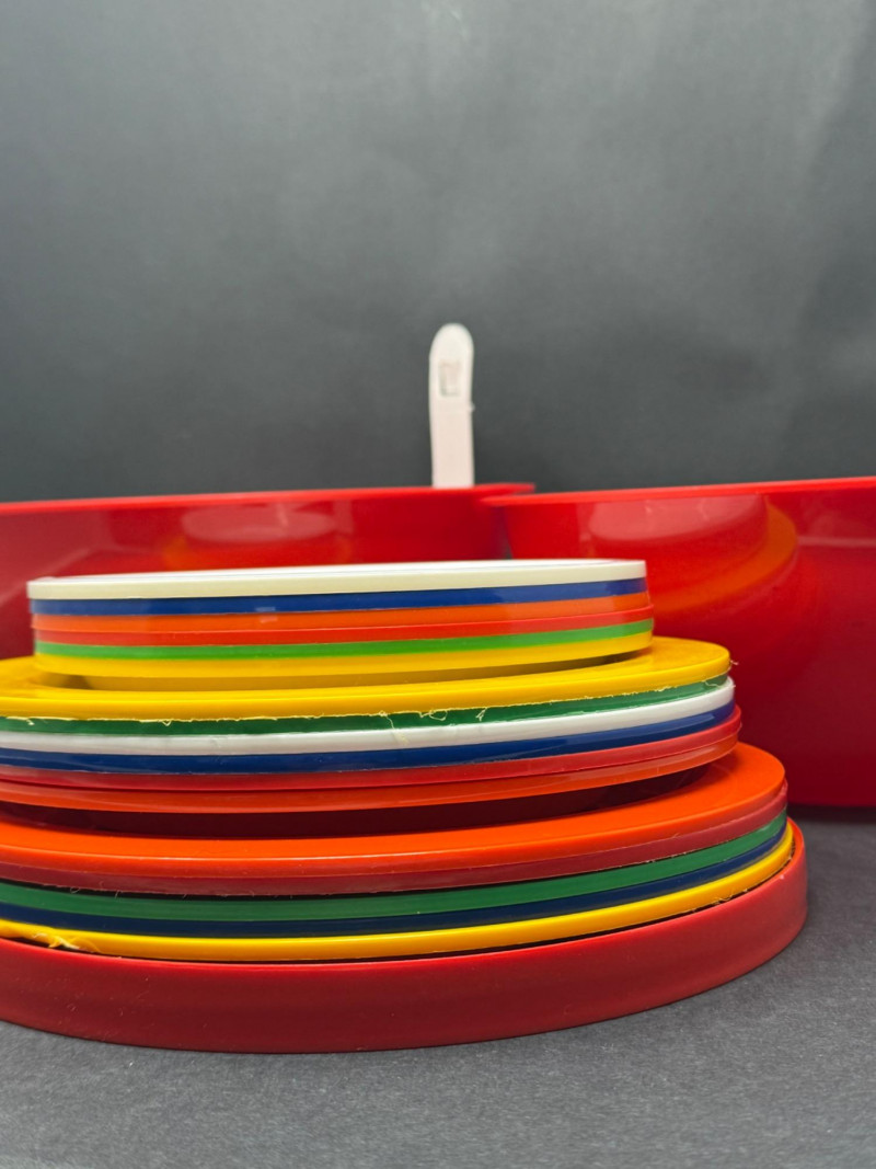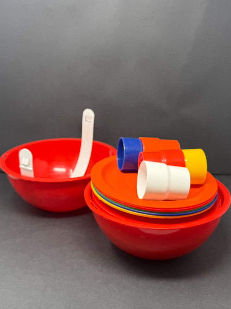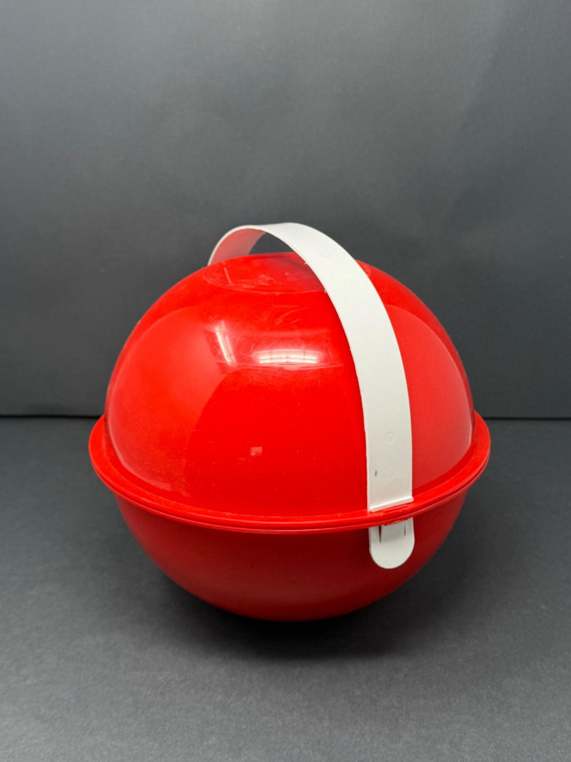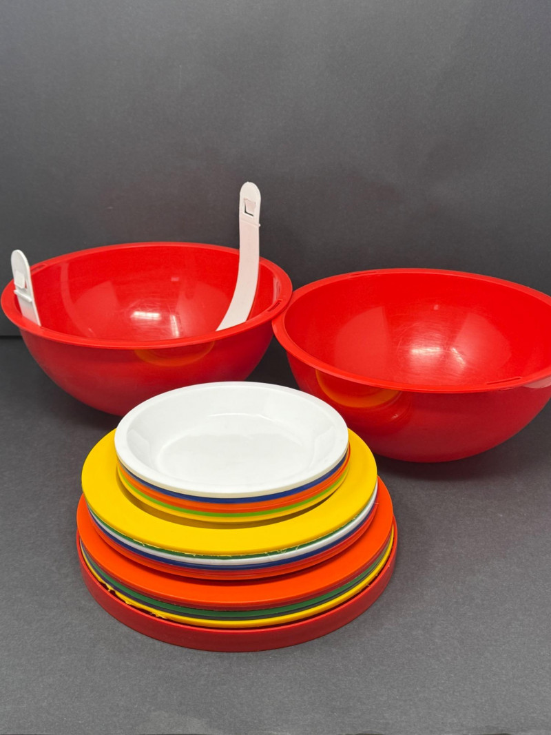 Vintage Ingrid Chicago Mid-Century Atomic Picnic Set – Camping Party Ball A vibrant and functional Ingrid Chicago “Atomic” picnic set, designed for portability and mid-century modern style. The classic party ball design features bright red bowls that nest together with a carry strap, enclosing multicolor plates, tumblers, and serving pieces. Brand: Ingrid Chicago Era: Mid-Century Modern, c. 1960s–1970s Material: Durable molded plastic Color: Bright red with multicolor accents Condition: Good vintage condition; minor surface wear consistent with age and use Measurements: Bowls approx. 8–10" diameter; tumblers approx. 4" tall; plates approx. 7–8" diameter Historical Note: Why it’s special: