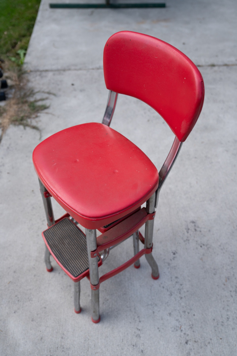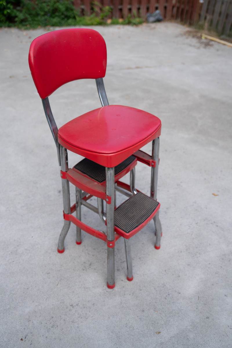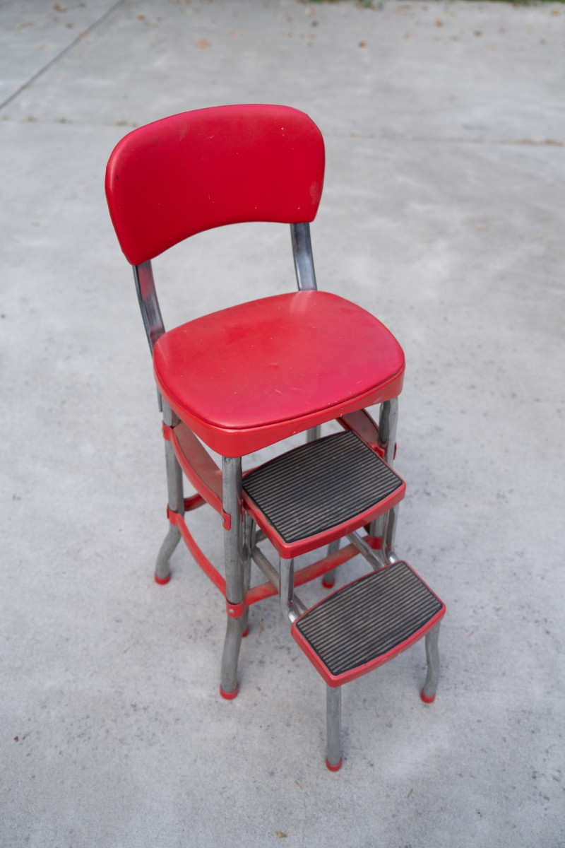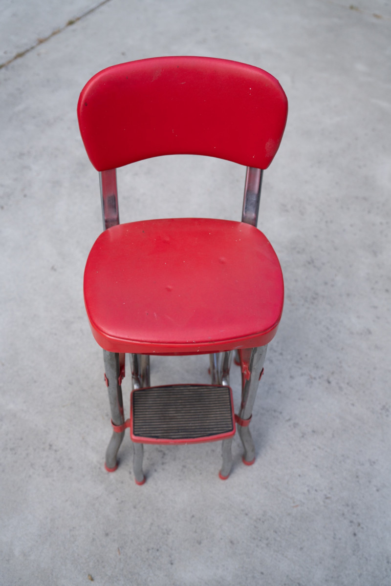Vintage Cosco Step Stool Chair – Red Vinyl & Chrome Folding Step Ladder Seat A mid-century classic from Cosco, this multifunctional chair doubles as a step stool with two folding steps that tuck neatly beneath the seat. Featuring a bright red vinyl seat and backrest with chrome-plated metal frame, it perfectly blends function and retro style. Originally popular in kitchens of the 1950s–1970s, these pieces have become iconic collectibles for both their design and practicality. Maker/Brand: Cosco Era: Mid-century (circa 1950s–1970s) Material: Chrome-plated metal frame with red vinyl seat/back and rubber step treads Design: Combination kitchen chair and folding step stool Dimensions: Approx. 34"–36" tall, 14"–16" wide, 18"–20" deep (range, with steps extended) Condition: Good vintage condition with age-appropriate wear; sturdy construction A staple of mid-century kitchens, this Cosco step stool chair remains a sought-after functional collectible—ideal as both a retro seating piece and practical household step stool.