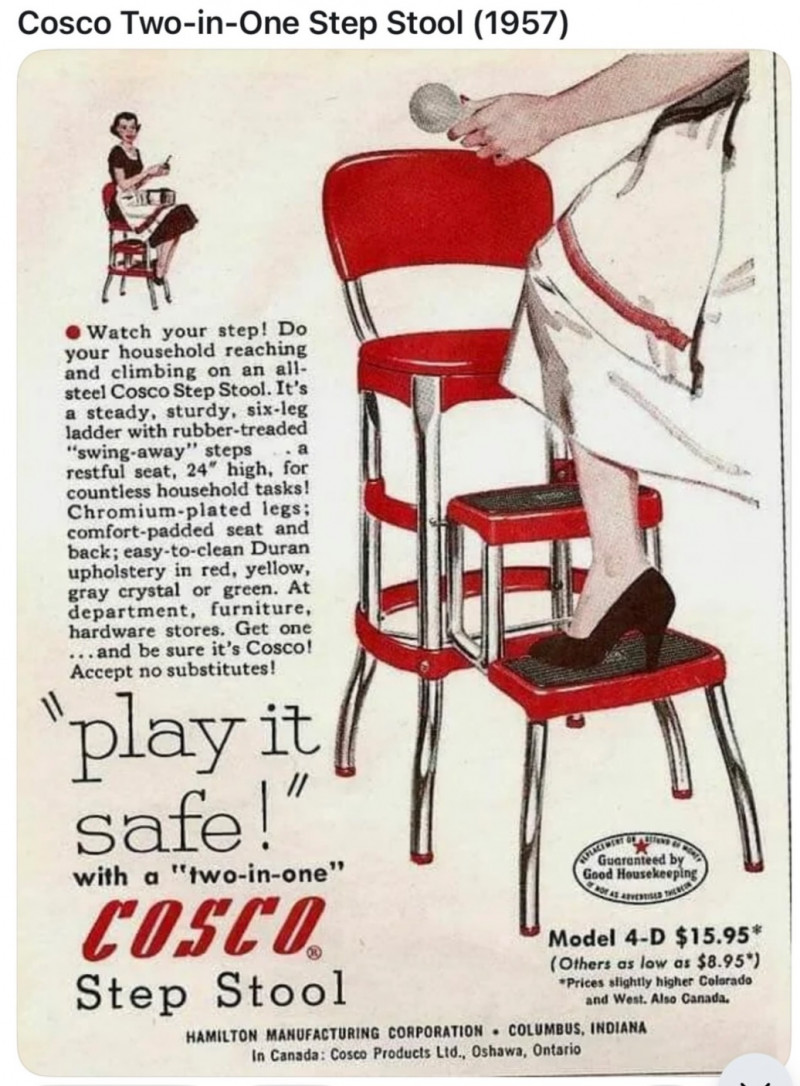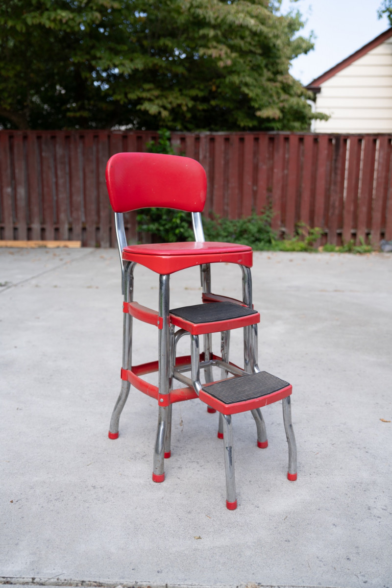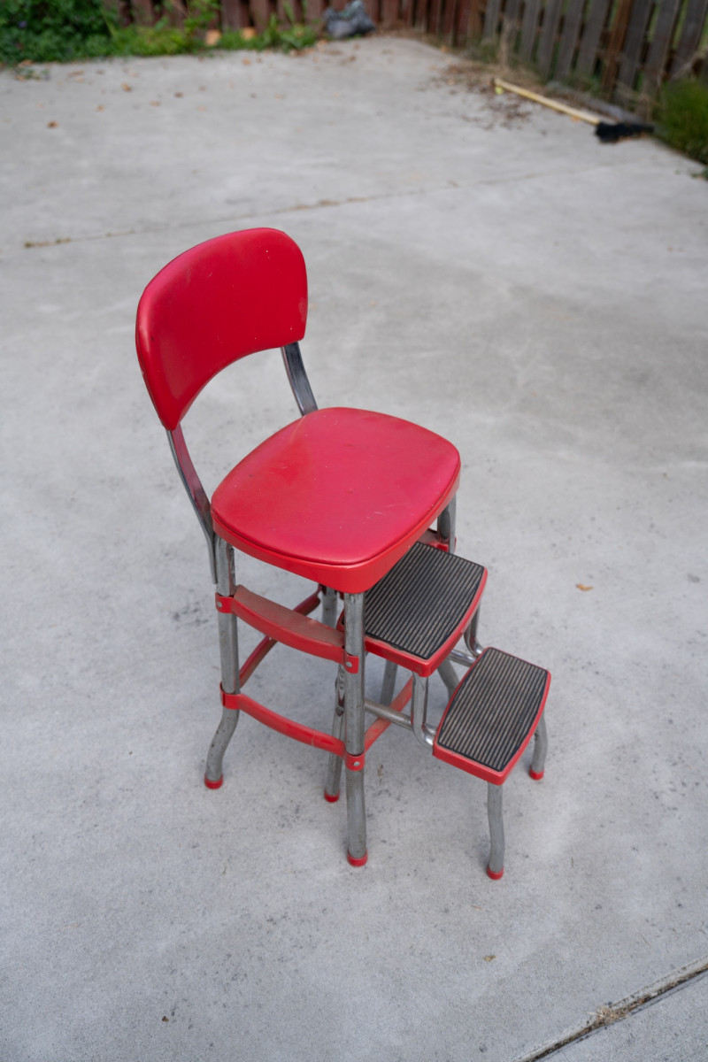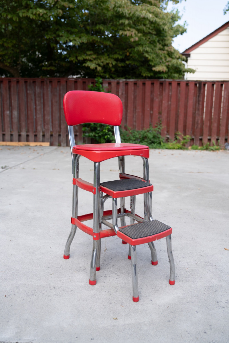 Vintage Cosco Step Stool Chair – Red Vinyl & Chrome Folding Step Ladder Seat A mid-century classic from Cosco, this multifunctional chair doubles as a step stool with two folding steps that tuck neatly beneath the seat. Featuring a bright red vinyl seat and backrest with chrome-plated metal frame, it perfectly blends function and retro style. Originally popular in kitchens of the 1950s–1970s, these pieces have become iconic collectibles for both their design and practicality. Maker/Brand: Cosco Era: Mid-century (circa 1950s–1970s) Material: Chrome-plated metal frame with red vinyl seat/back and rubber step treads Design: Combination kitchen chair and folding step stool Dimensions: Approx. 34"–36" tall, 14"–16" wide, 18"–20" deep (range, with steps extended) Condition: Good vintage condition with age-appropriate wear; sturdy construction A staple of mid-century kitchens, this Cosco step stool chair remains a sought-after functional collectible—ideal as both a retro seating piece and practical household step stool.