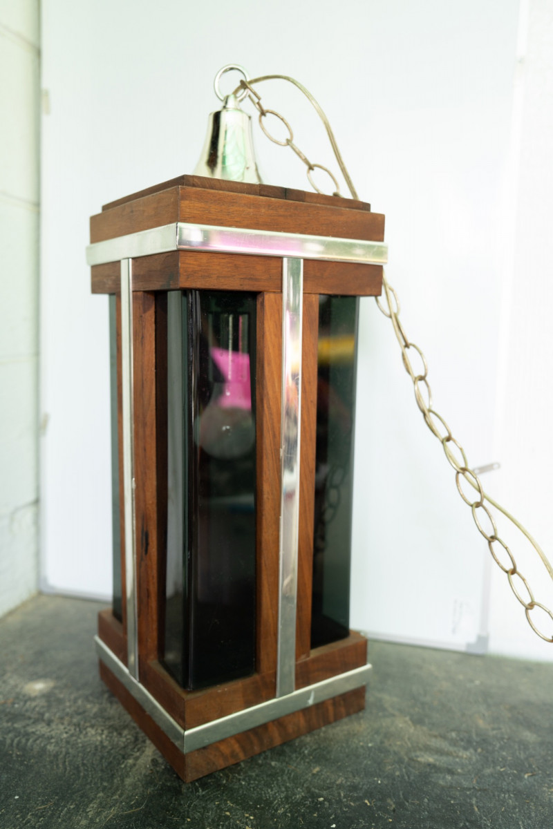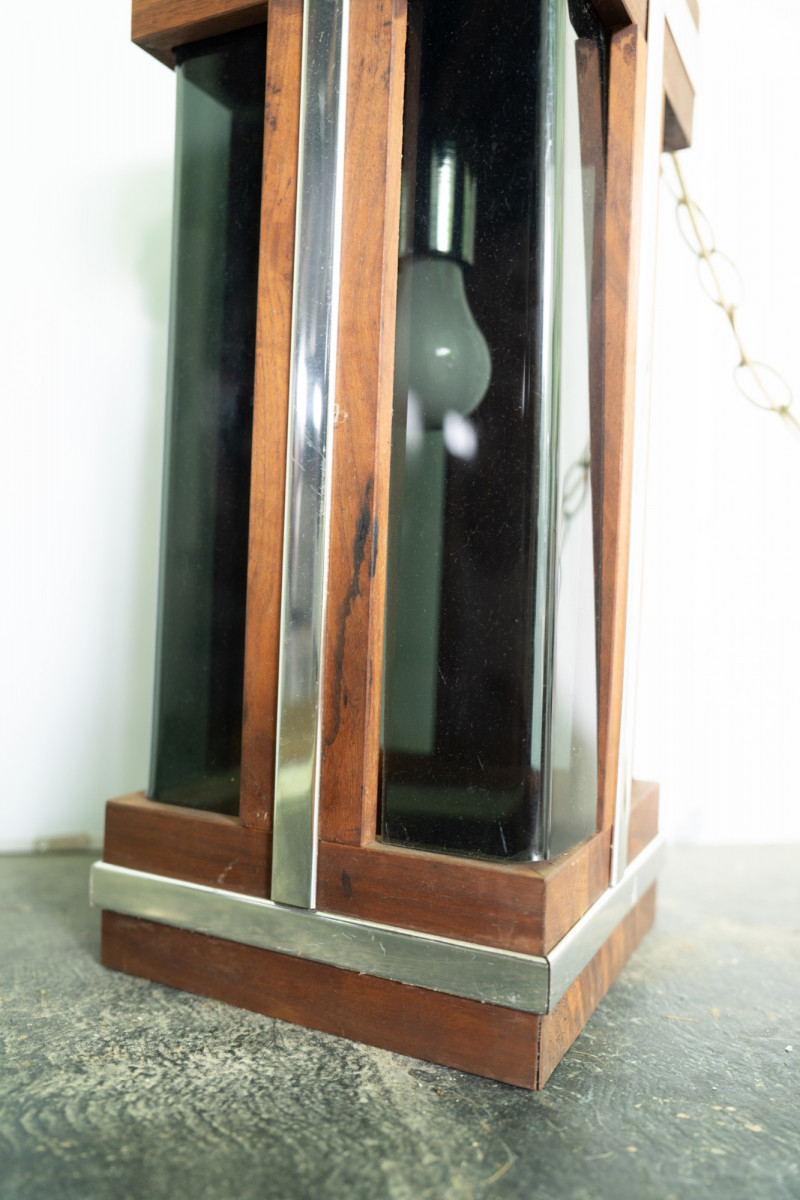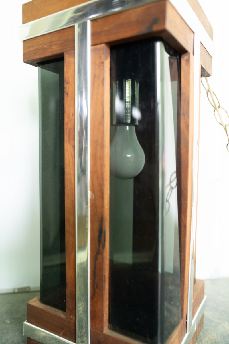 Mid-Century Modern Hanging Lantern – Wood, Chrome & Glass Panel Light Fixture – 1960s–70s A stylish mid-century modern hanging lantern featuring a geometric wood frame accented with chrome trim and beveled glass panels. The design blends warm natural wood tones with sleek metallic highlights, creating a fixture that is both functional and decorative. Includes chain for hanging installation and single light socket inside. Measurements (range): Height (fixture only): Approx. 25"h x 8.25W Historical Note: