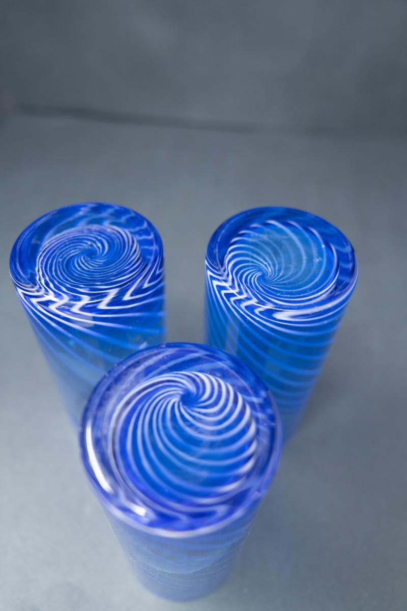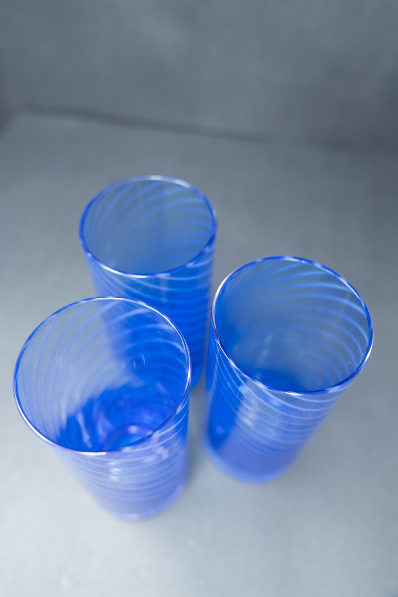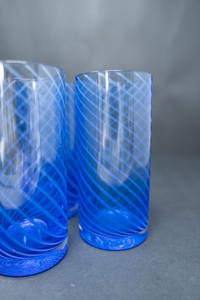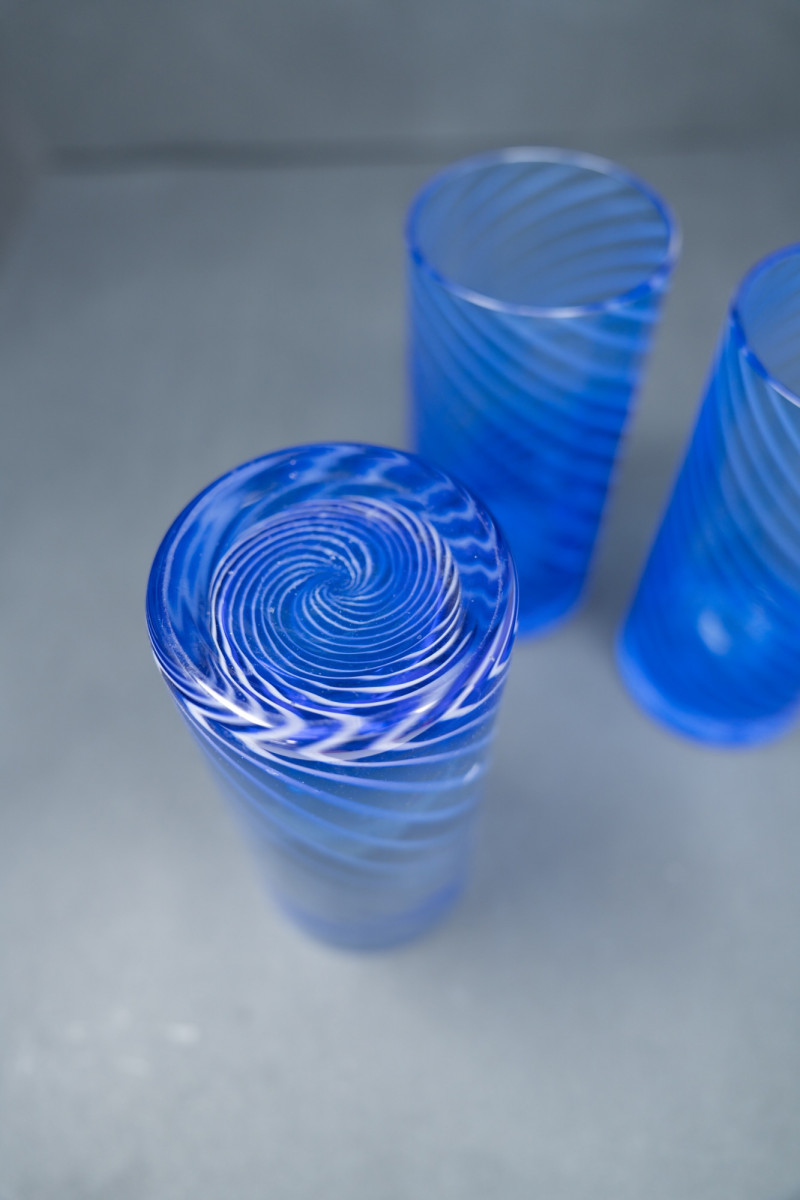Italian glassmakers have long been celebrated for their artistry and innovation, from Murano traditions to modernist designs. These tumblers reflect the 1980s era of Italian design, when cobalt glassware became a fashionable choice for both luxury dining and chic home entertaining. Their spiral motif adds a dynamic, modernist touch, showcasing Italy’s legacy of combining craftsmanship with contemporary style.