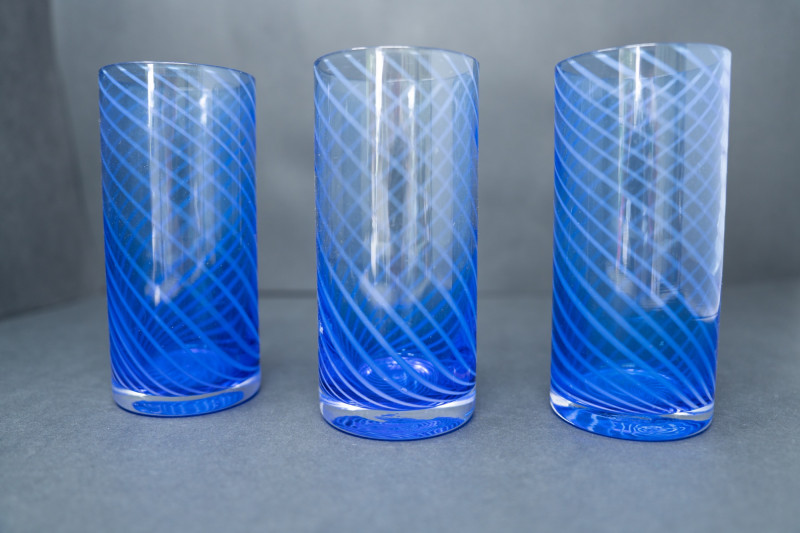 Comparable Italian sets of 4 spiral cobalt glasses are listed on Chairish and similar platforms in the $450–$500 range. This set of 3, while incomplete, remains highly collectible for its quality, origin, and design pedigree.
