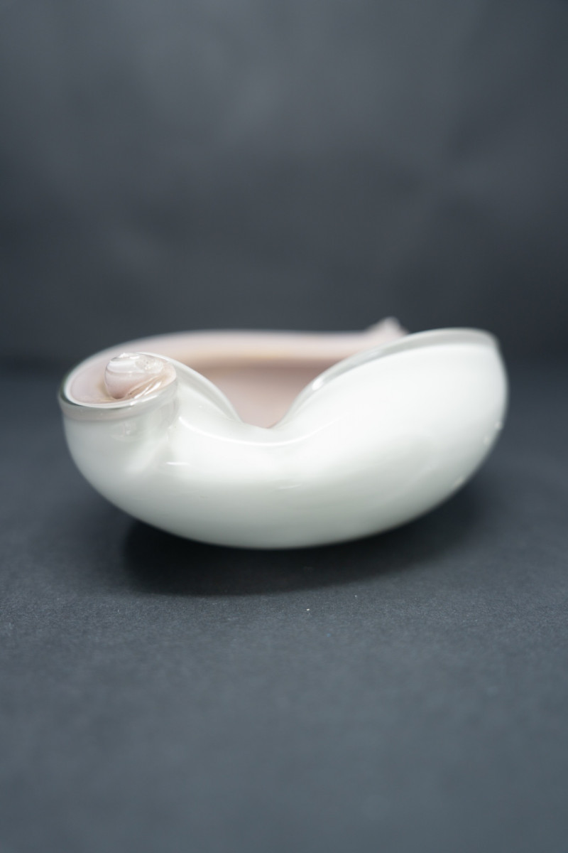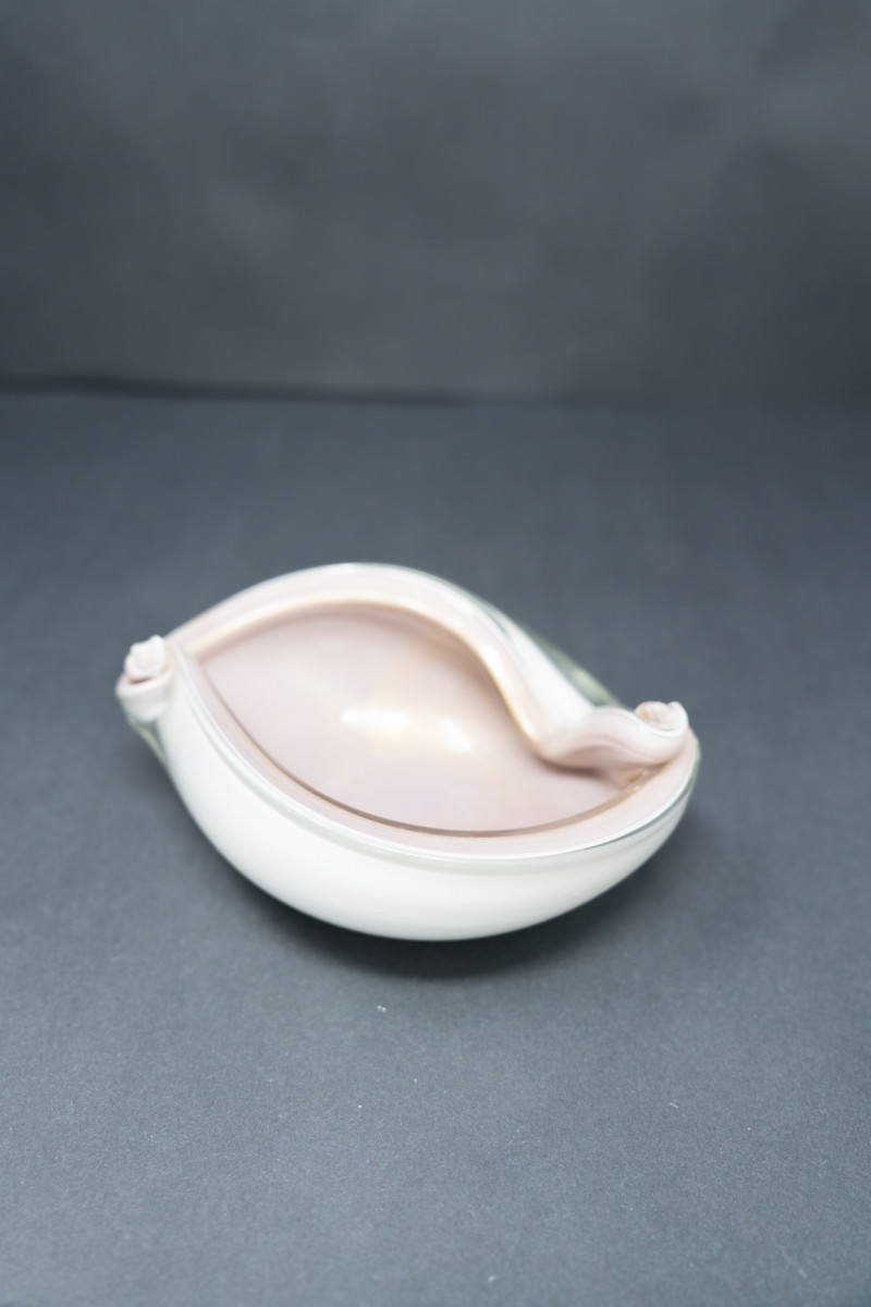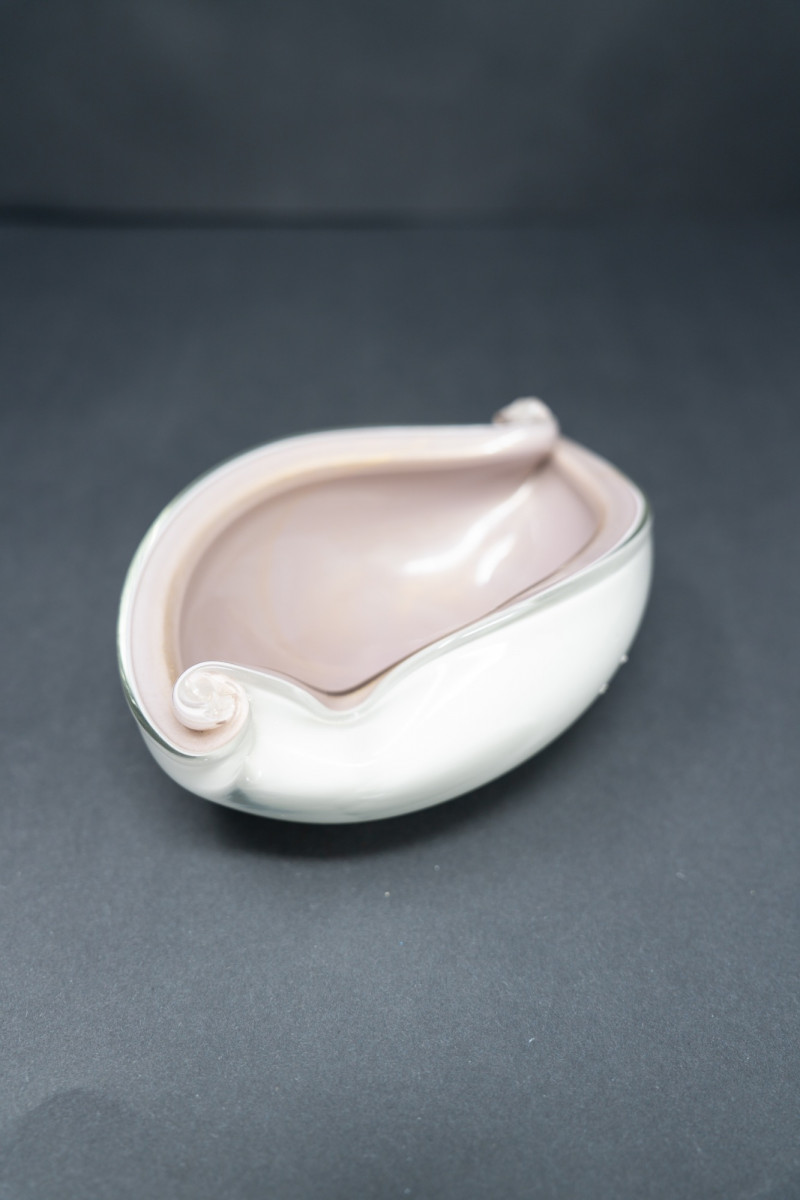 Alfredo Barbini for Murano – Lilac & White Glass Shell Bowl – Mid-20th Century Italian Art Glass A beautiful Murano glass shell-form bowl attributed to Alfredo Barbini, featuring soft lilac-pink and white hues with a clear encasement. The elegant curled lip and smooth organic form capture Barbini’s mastery of sculptural glass, making this piece both functional and decorative. Measurements (range): Length: Approx. 6"–7" Width: Approx. 4.5"–5" Height: Approx. 2.5"–3" Historical Note: Value: