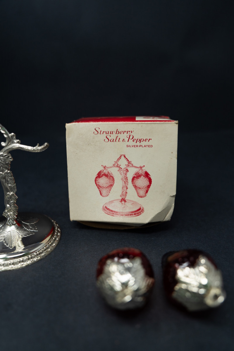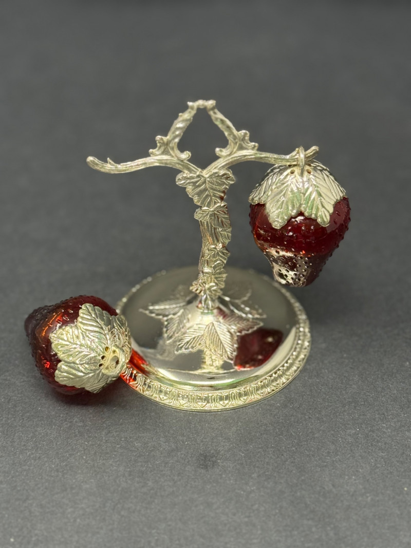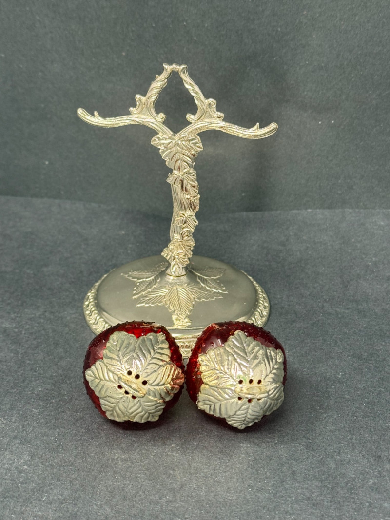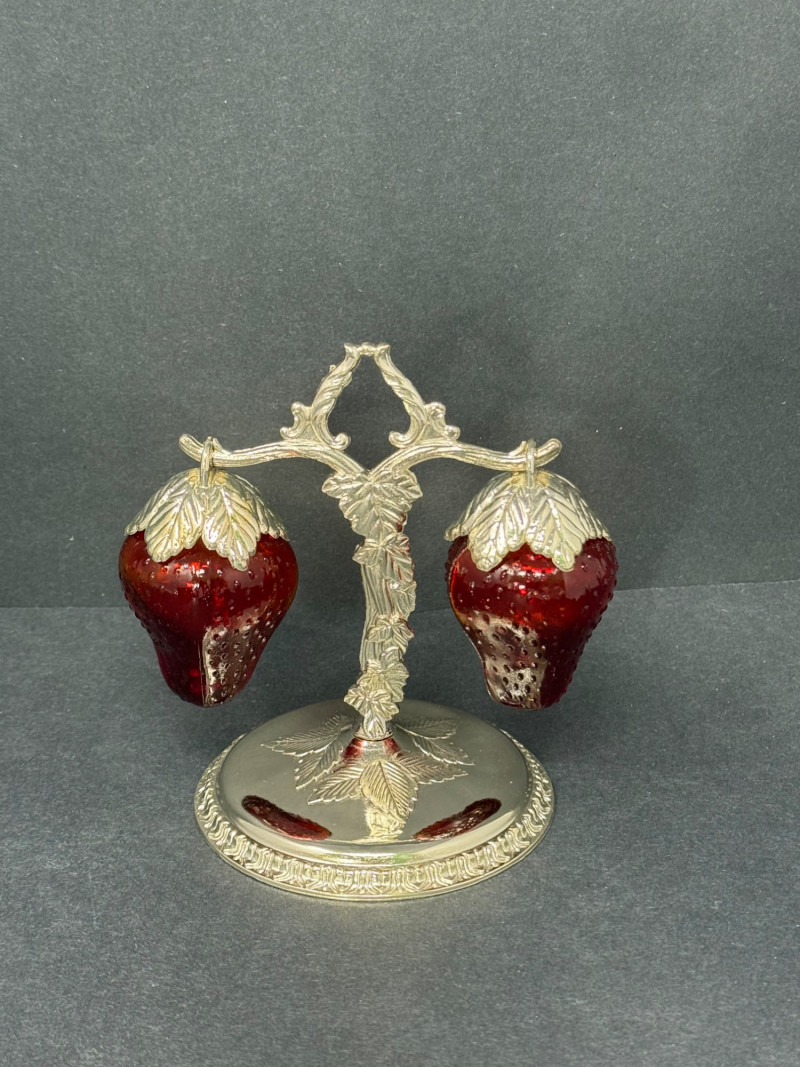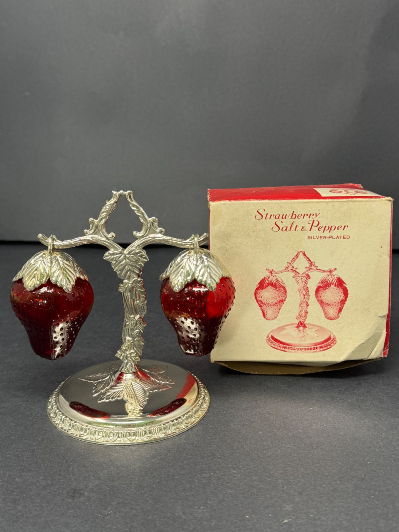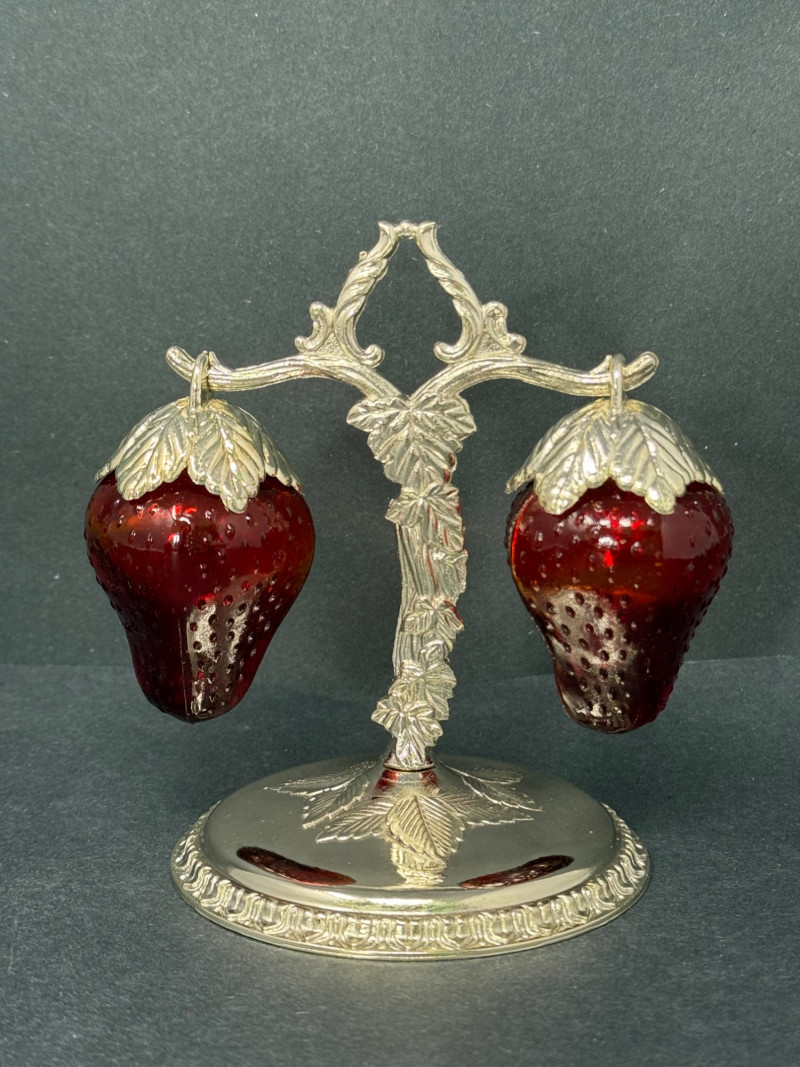 1960s Red Glass Strawberry Salt & Pepper Shakers on Vine Stand – Made in Japan – Rare A whimsical and rare mid-century salt and pepper set featuring red glass strawberries with silver-toned metal leaf caps, hanging delicately from a detailed vine-form stand. Made in Japan in the 1960s, this collectible set is both functional and highly decorative, embodying the playful charm of mid-century novelty glassware. Maker: Japan (unmarked, attributed) Era: Circa 1960s Materials: Red art glass, silver-toned metal Design: Strawberry-shaped shakers suspended from vine stand Dimensions: Approx. 6.5" tall x 4.5" wide Condition: Great vintage condition with minor age-related wear and light tarnish on metal, consistent with age. Why it’s special: Rarely found complete with both glass strawberry shakers and original stand, this Japanese novelty piece is highly sought after by collectors of mid-century kitchenware and decorative table accessories.