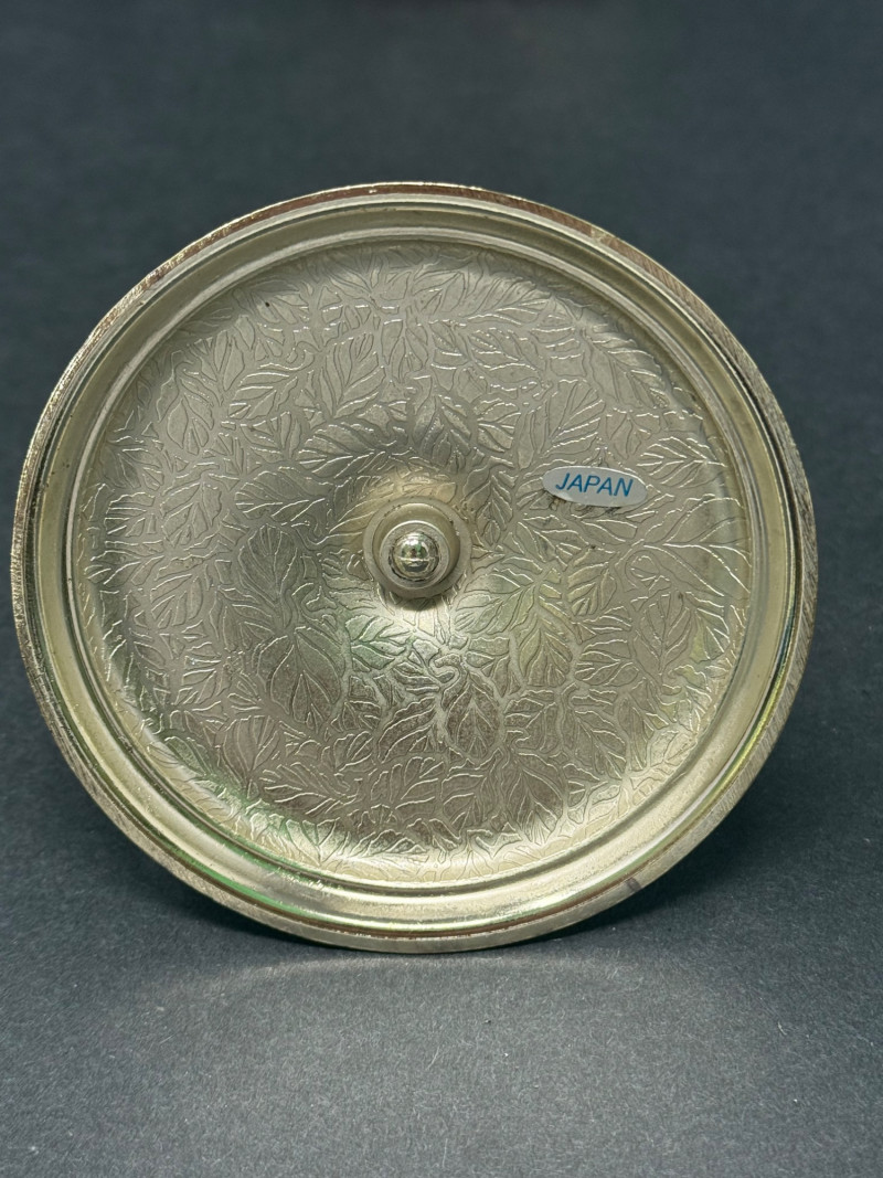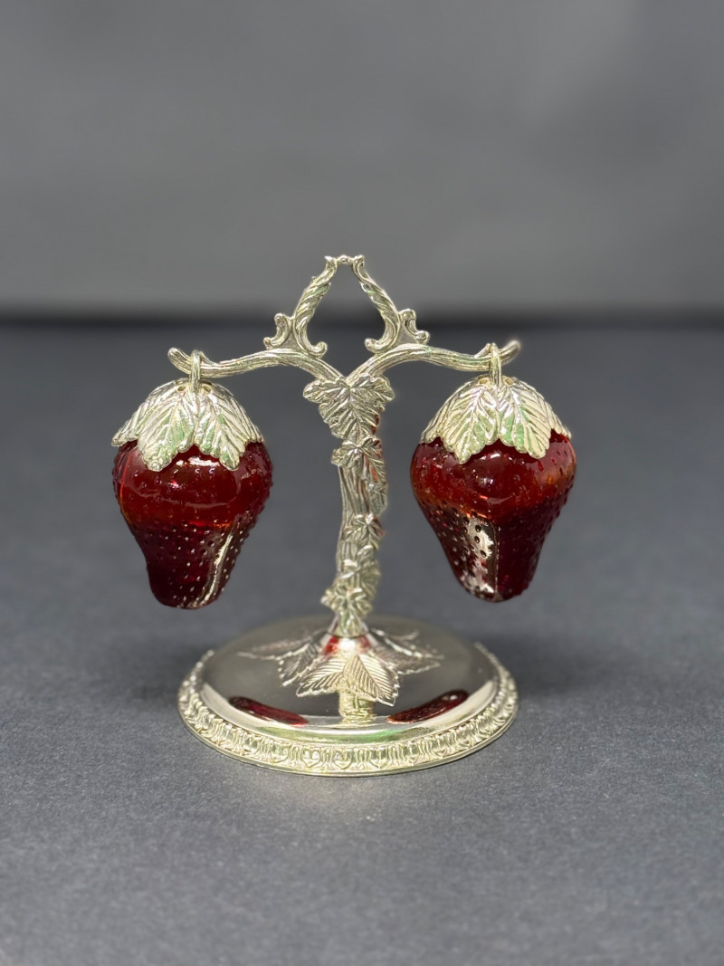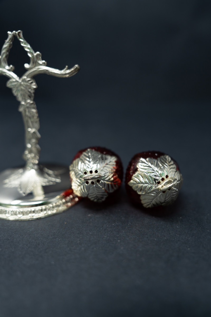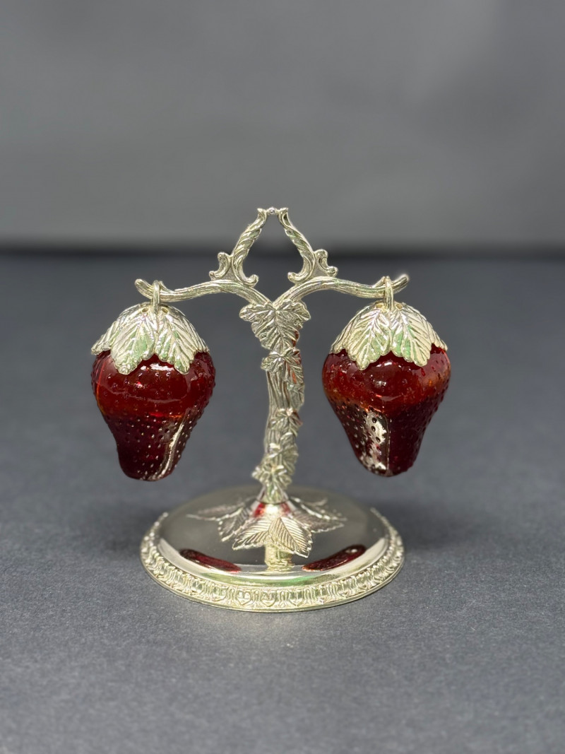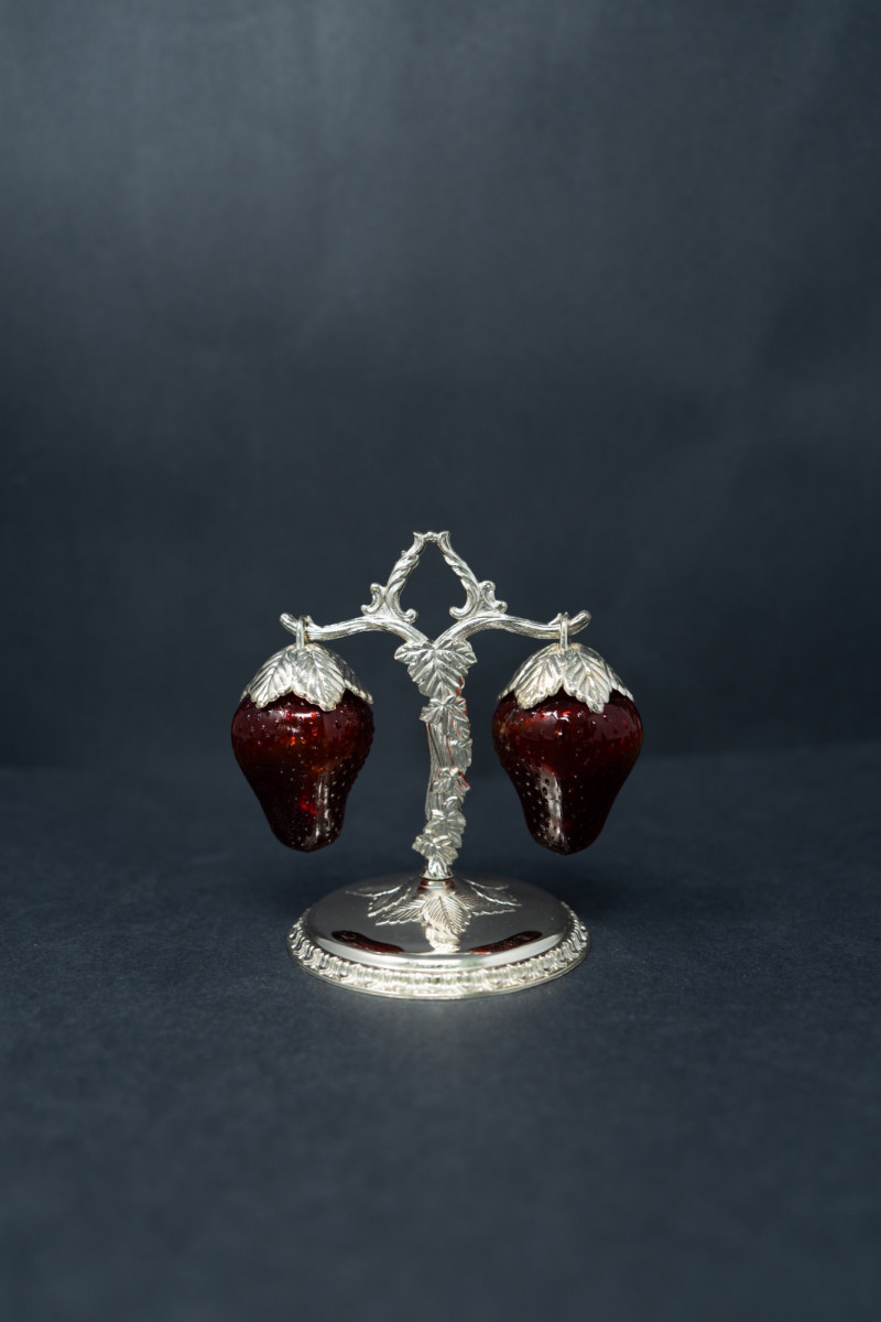 1960s Red Glass Strawberry Salt & Pepper Shakers on Vine Stand – Made in Japan – Rare A whimsical and rare mid-century salt and pepper set featuring red glass strawberries with silver-toned metal leaf caps, hanging delicately from a detailed vine-form stand. Made in Japan in the 1960s, this collectible set is both functional and highly decorative, embodying the playful charm of mid-century novelty glassware. Maker: Japan (unmarked, attributed) Era: Circa 1960s Materials: Red art glass, silver-toned metal Design: Strawberry-shaped shakers suspended from vine stand Dimensions: Approx. 6.5" tall x 4.5" wide Condition: Great vintage condition with minor age-related wear and light tarnish on metal, consistent with age. Why it’s special: Rarely found complete with both glass strawberry shakers and original stand, this Japanese novelty piece is highly sought after by collectors of mid-century kitchenware and decorative table accessories.