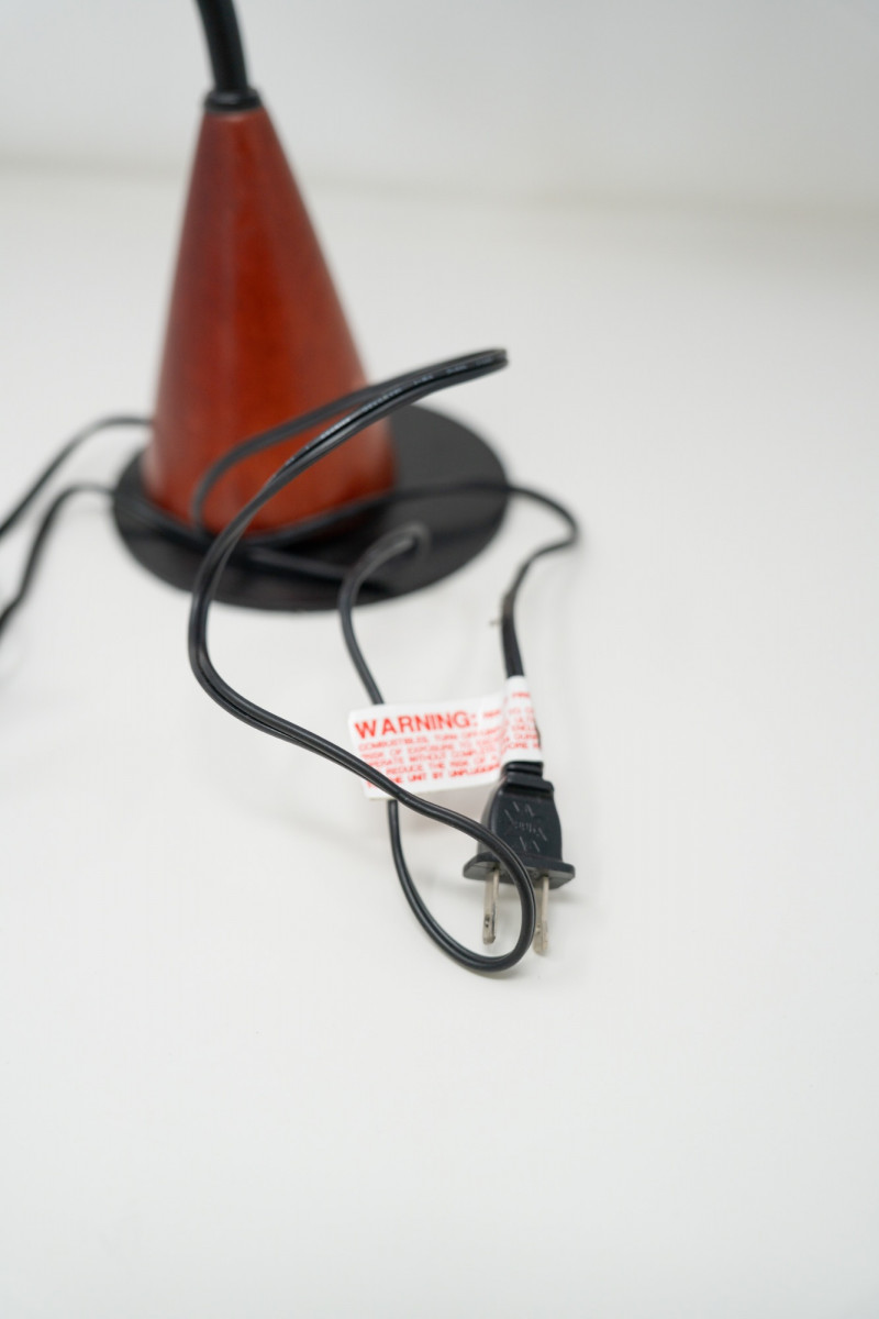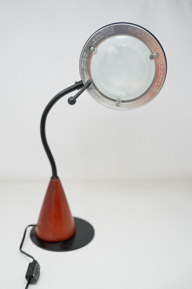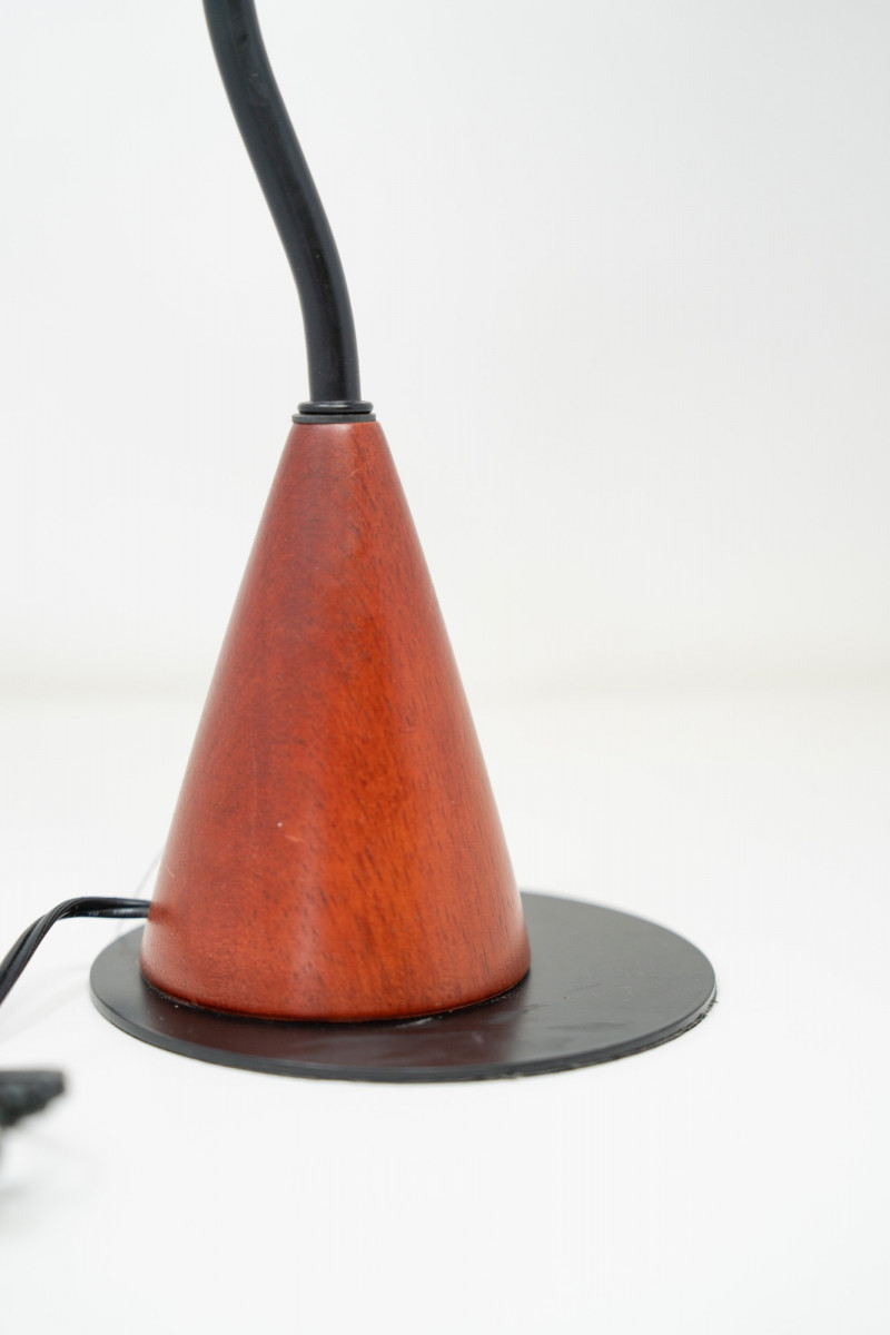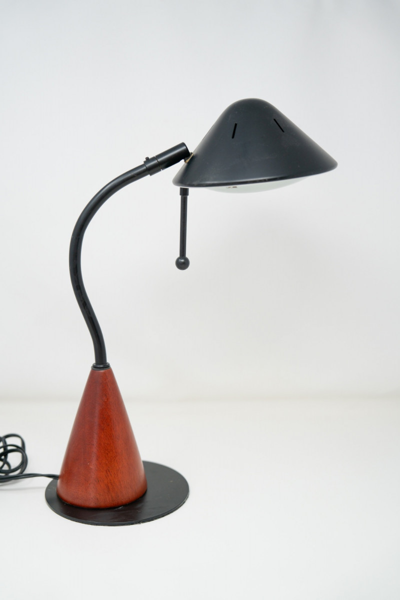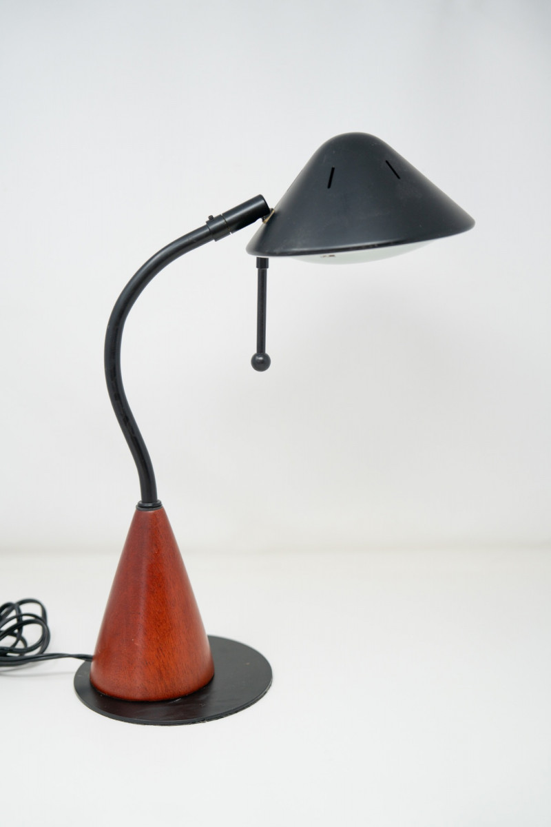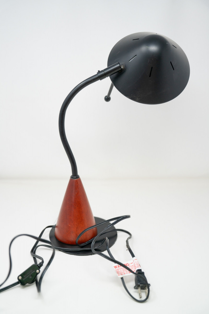 Postmodern Desk Lamp by Ron Rezek – 1980s A striking postmodern desk lamp designed by Ron Rezek, dating to the 1980s. Known for his bold, architectural lighting, Rezek’s designs capture the era’s clean lines and sculptural balance. This lamp features: Design: Angular black metal shade with perforated vents and ball-tipped pull rod Base: Cone-shaped wooden base paired with a black metal disc, blending natural warmth with industrial style Neck: Curved black metal stem with adjustable tilt functionality Era: Circa 1980s Maker: Ron Rezek Dimensions: Approx. 16–18" tall, 6–8" wide Condition: Very good vintage condition with only light wear consistent with age. The finish and wood base remain rich and clean. Why it’s special: Ron Rezek lamps are highly collectible for their refined yet playful postmodern look. This piece embodies the mix of geometric form and practical function that defined late-20th-century design.