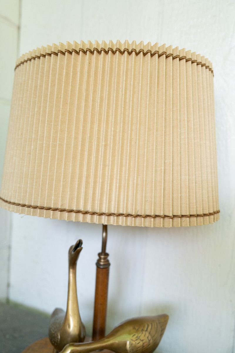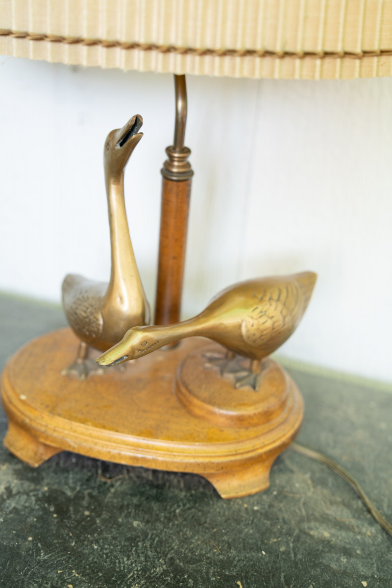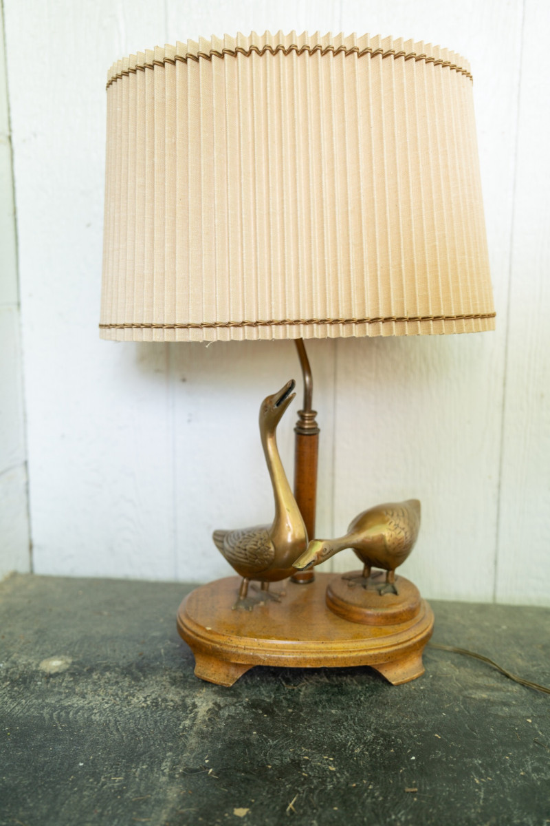 Vintage Brass Goose Lamp – Mid-Century Sculptural Table Lamp with Pleated Shade A whimsical and charming mid-century table lamp featuring two sculptural brass geese mounted on a wooden base. Paired with its original pleated fabric shade, this piece adds both warmth and character to any space. Era: Circa 1950s–1960s Design: Sculptural brass goose figures mounted on wood base, original pleated fabric shade Materials: Brass, wood, fabric shade Dimensions: Approx. 20–24" tall, 12–14" wide Condition: Good vintage condition with light wear to the base and shade consistent with age. Lamp is in working order. Why it’s special: Playful brass animal motifs were a popular design trend in mid-century home decor, making this lamp both decorative and collectible. A unique statement piece for a cozy reading nook or eclectic vintage interior.