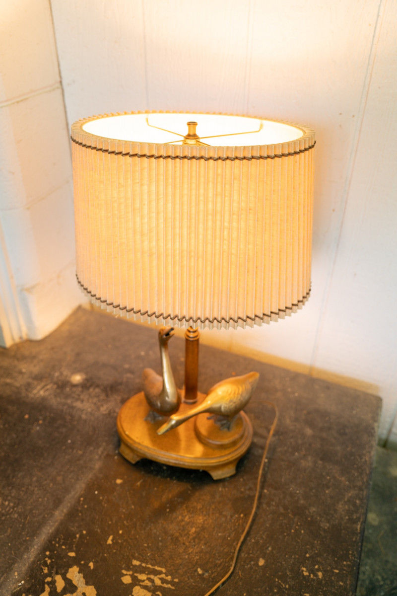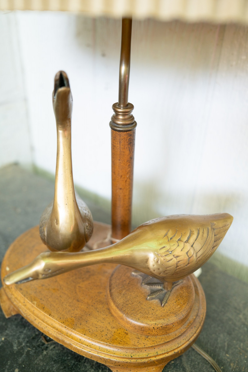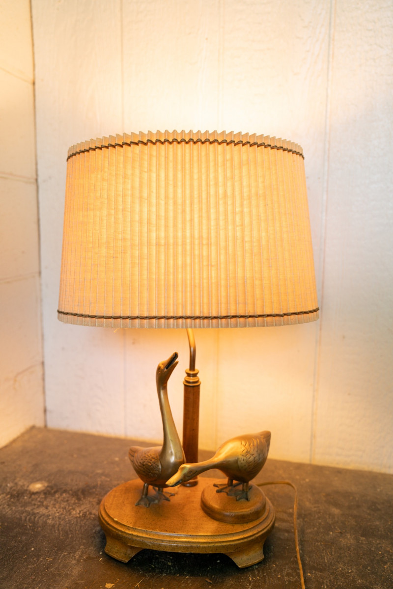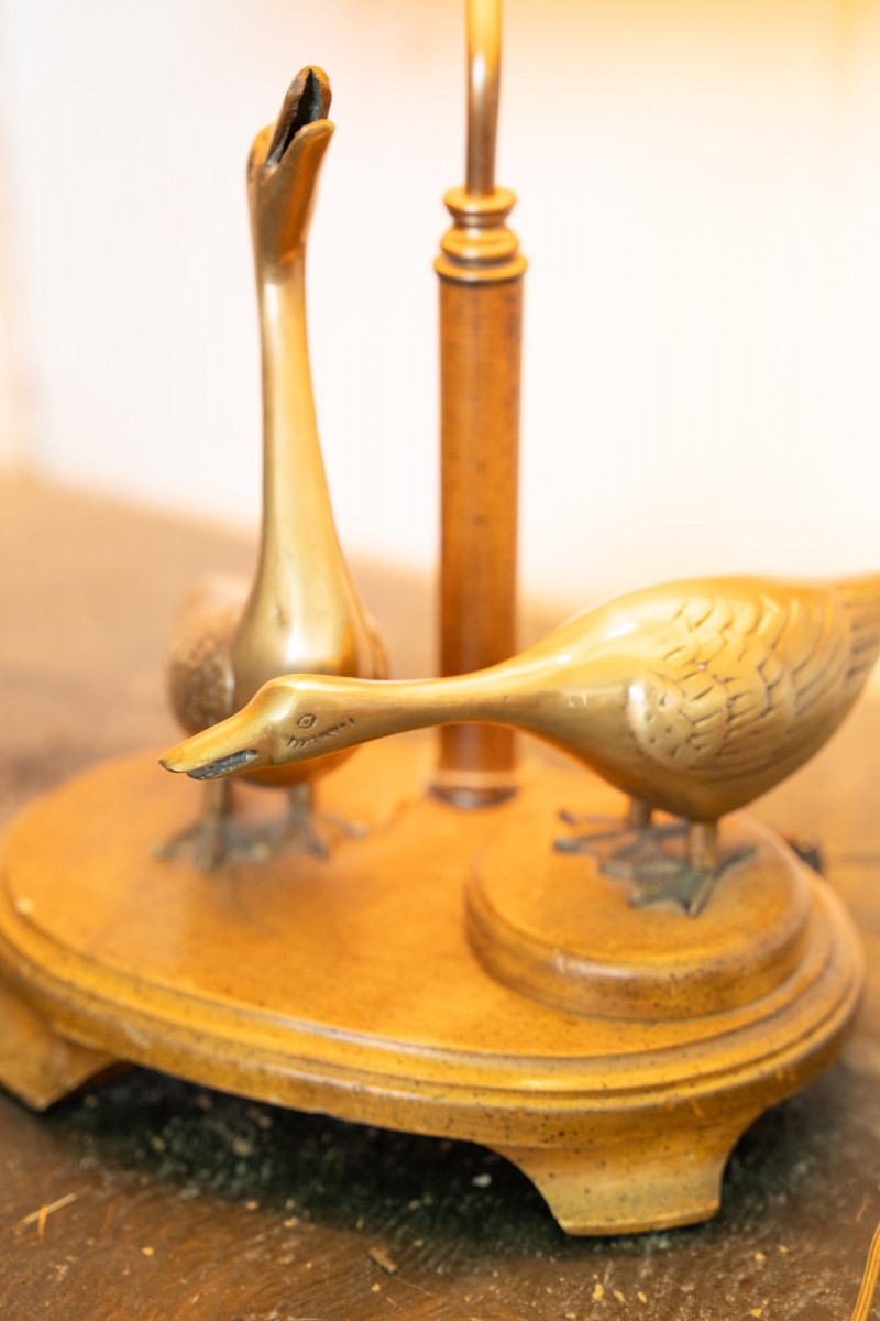 Vintage Brass Goose Lamp – Mid-Century Sculptural Table Lamp with Pleated Shade A whimsical and charming mid-century table lamp featuring two sculptural brass geese mounted on a wooden base. Paired with its original pleated fabric shade, this piece adds both warmth and character to any space. Era: Circa 1950s–1960s Design: Sculptural brass goose figures mounted on wood base, original pleated fabric shade Materials: Brass, wood, fabric shade Dimensions: Approx. 20–24" tall, 12–14" wide Condition: Good vintage condition with light wear to the base and shade consistent with age. Lamp is in working order. Why it’s special: Playful brass animal motifs were a popular design trend in mid-century home decor, making this lamp both decorative and collectible. A unique statement piece for a cozy reading nook or eclectic vintage interior.