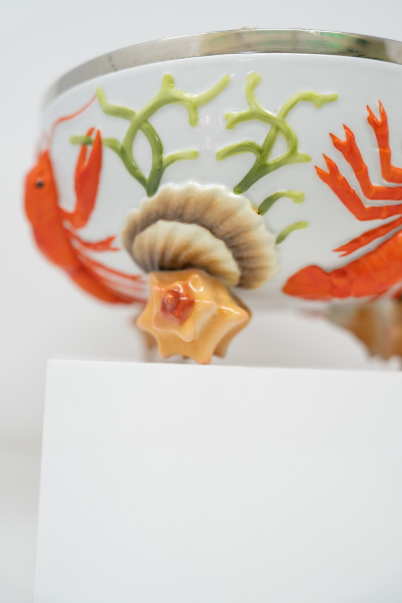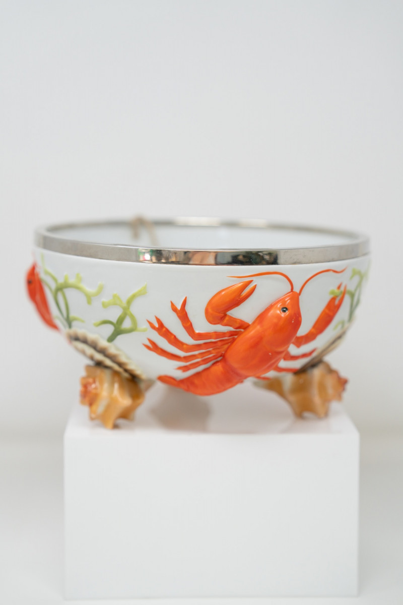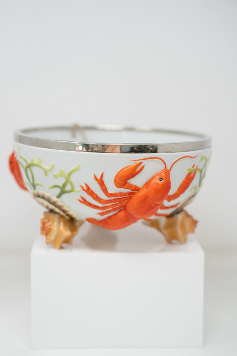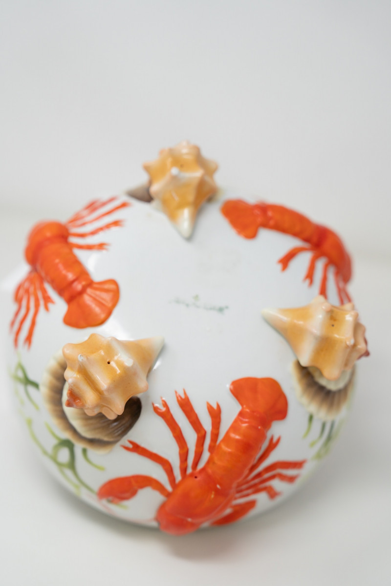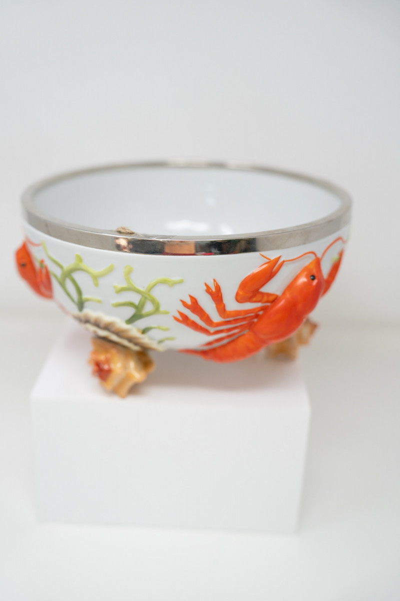 Vintage Italian Majolica Lobster & Shell-Footed Bowl – Hand-Painted Ceramic with Silver Rim A vibrant and whimsical Italian Majolica bowl, exquisitely hand-painted with bold orange lobsters that wrap dynamically around the exterior, set above sculptural conch-shell feet. Finished with a polished silver-tone rim, this piece skillfully blends artistry with a playful coastal aesthetic. Origin: Likely Italian Majolica Era: Mid-20th century Materials: Hand-painted ceramic with silver-tone metal rim Design Highlights: Lobster motif, seashell feet, seaweed accents, rich coastal styling Dimensions: Approx. 6–8″ in diameter; 4–6″ in height Condition: Excellent vintage state with subtle wear indicative of age. Why it’s special: Market Value Estimate: