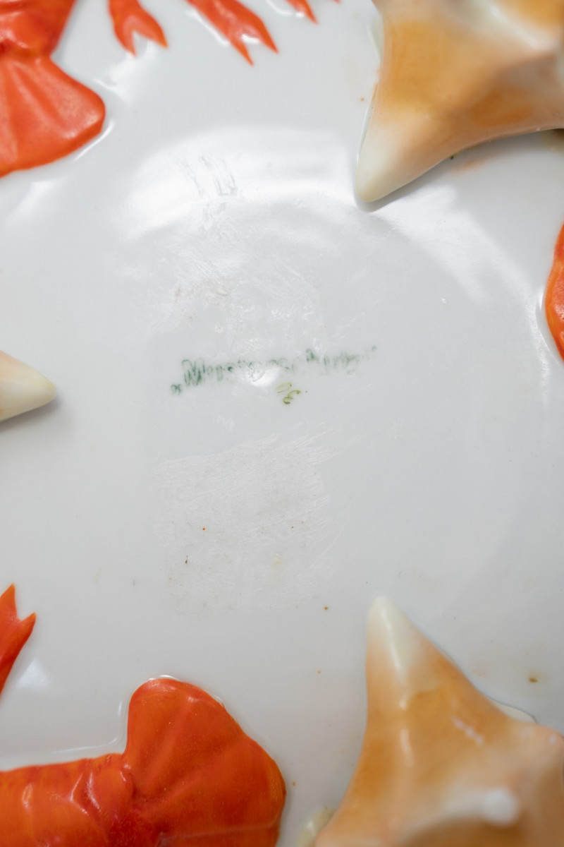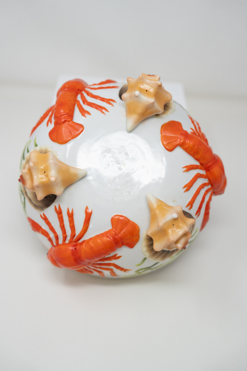 Majolica pieces featuring sculptural lobster and shell detailing are rare and highly collectible—this example stands out for both its vibrant design and craftsmanship.