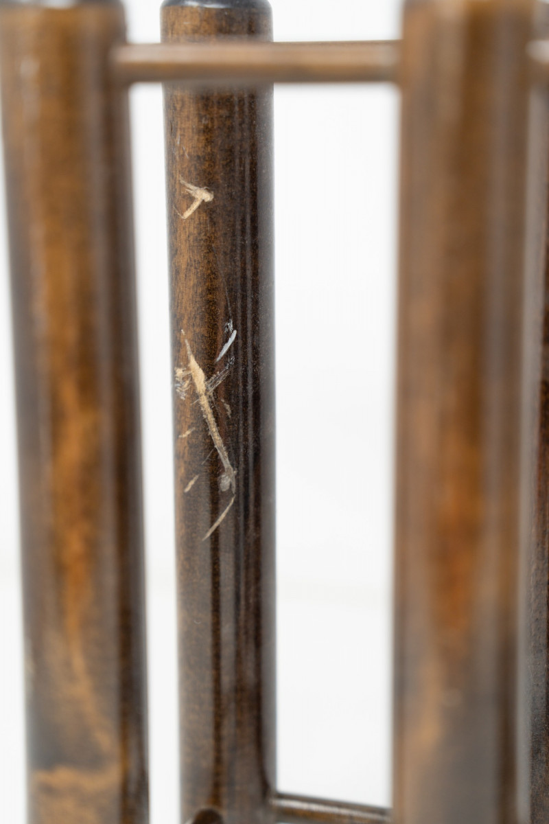 Mid-Century Modern Wooden Wine Rack – 1960s–70s Geometric Design A sleek and functional mid-century modern wine rack, crafted from dark-stained wood in a minimalist geometric form. Its modular, stacked-cylinder construction reflects the clean lines and practical elegance of Scandinavian-inspired design from the 1960s–70s. Era: Mid-20th century (1960s–70s) Material: Wood with dark stain finish Design: Cylindrical stacked dowel construction, space-efficient and stylish Dimensions: Approx. 12–15″ tall × 8–10″ wide × 8–10″ deep (fits 6 bottles comfortably) Condition: Good vintage condition with minor surface wear consistent with age. Why it’s special: