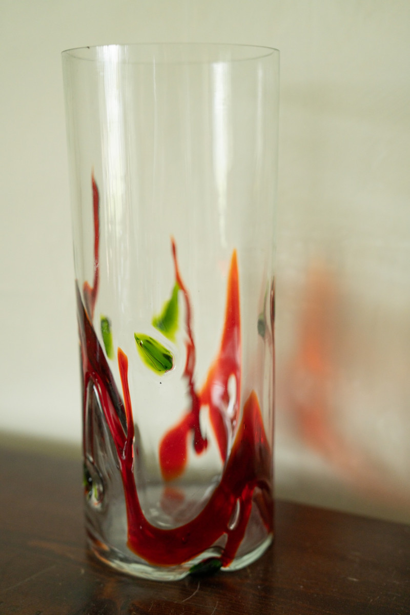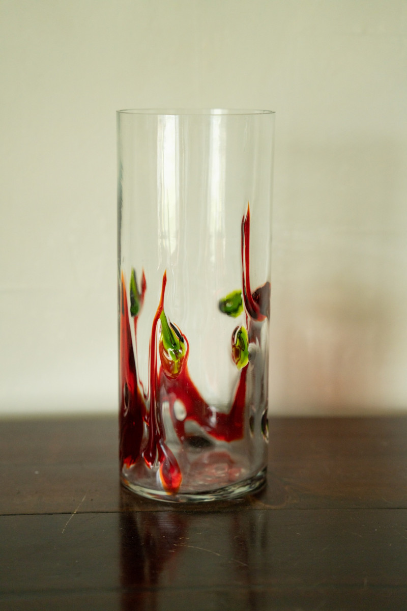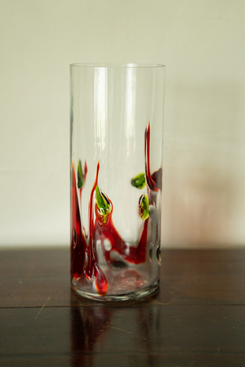 Mid-Century Murano-Style Art Glass Vase – Red & Green Inclusions This striking cylindrical art glass vase features a clear body with vibrant red and green abstract inclusions that appear to dance within the glass. A bold example of mid-century Murano-style craftsmanship, the piece showcases the artistry of hand-blown glass with fluid color work. Maker/Attribution: Murano-style, Italy Era: Mid-20th century, c. 1960s–70s Material: Hand-blown clear glass with internal red and green inclusions Design: Tall cylindrical form, with organic streaks and pockets of color suspended in clear glass Dimensions: Approx. 8–10″ tall × 3–4″ diameter Condition: Excellent vintage condition with minor wear consistent with age; no cracks or chips noted. Why it’s special: