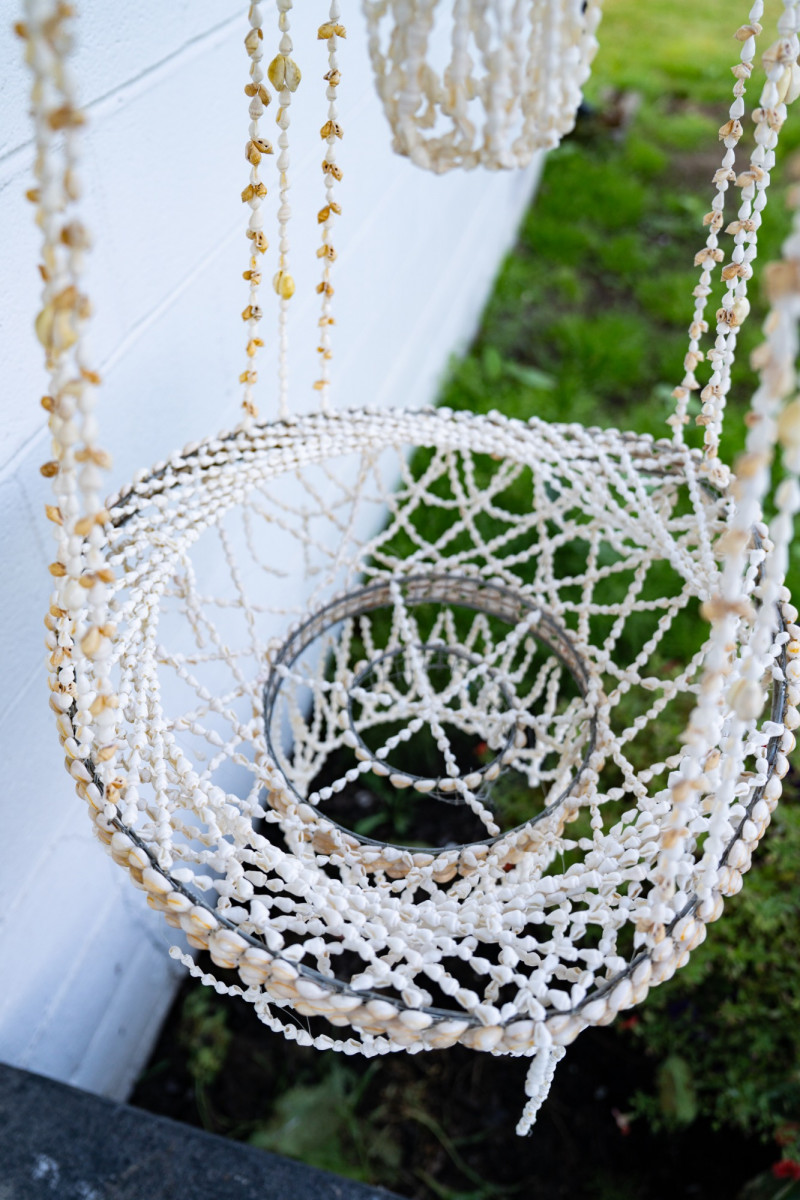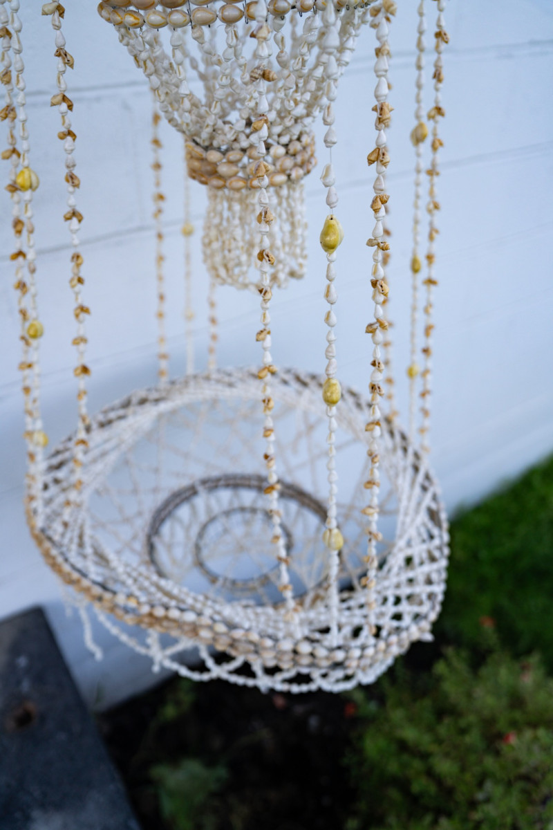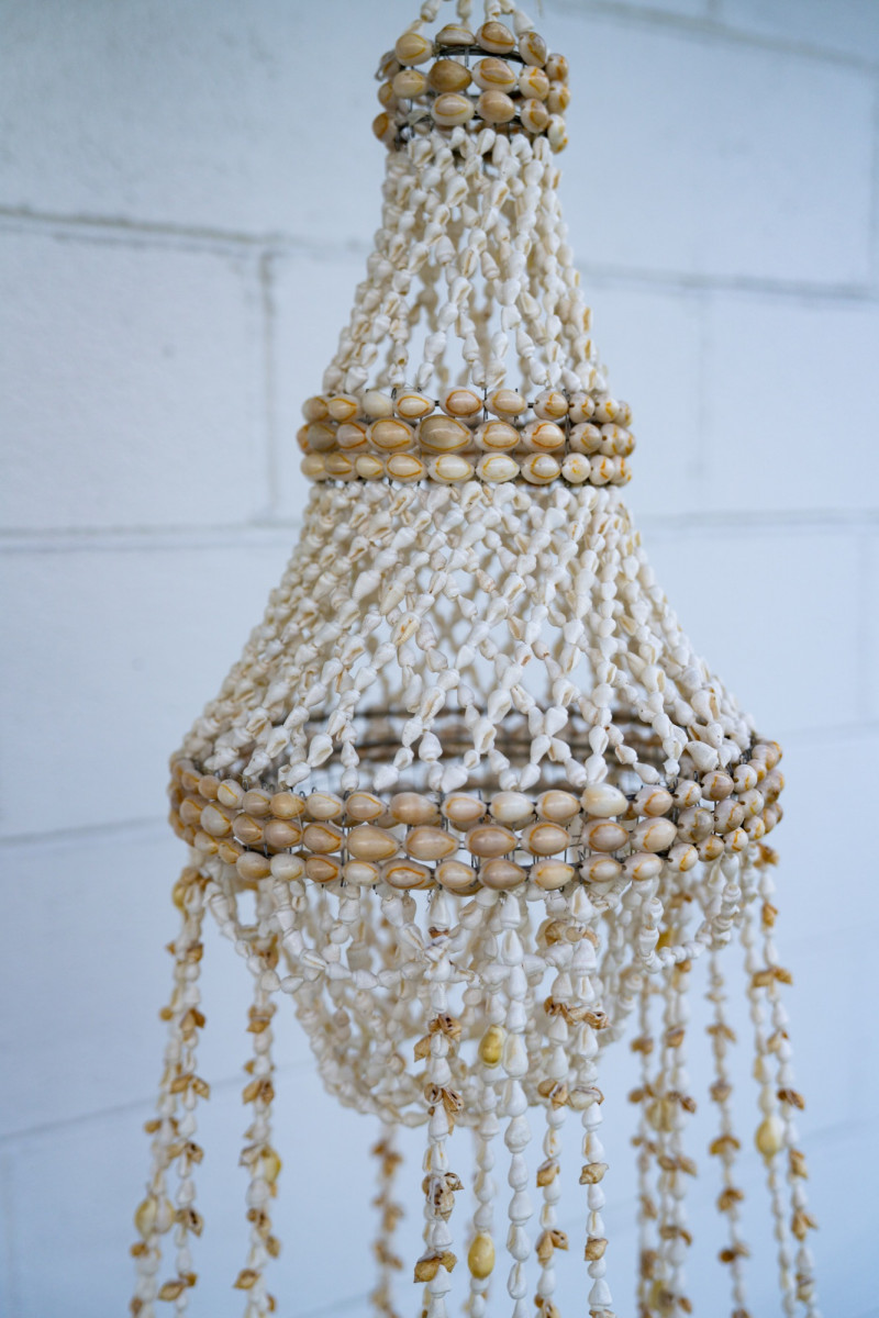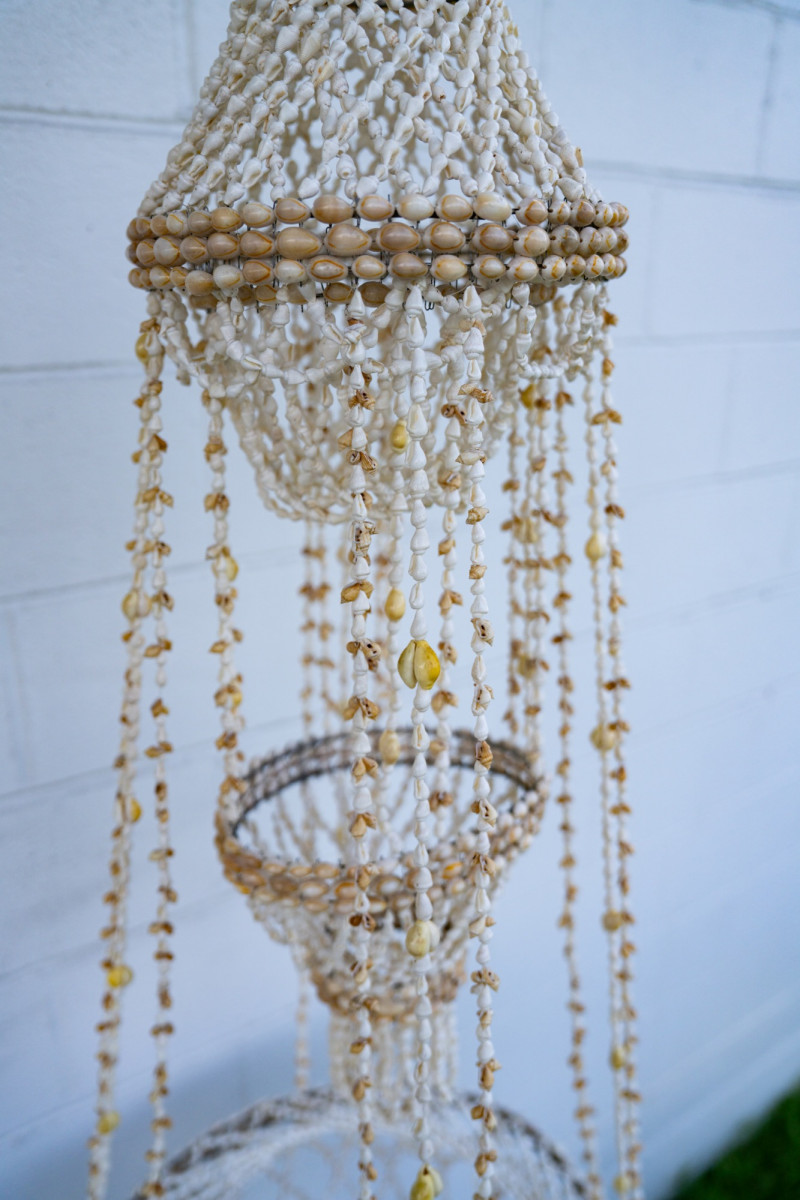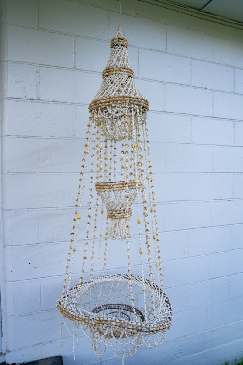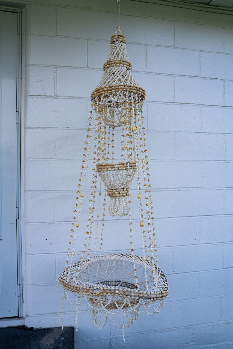 Vintage Handmade Seashell Chandelier – Bohemian Coastal Hanging Decor – Circa 1970s This rare, handmade seashell chandelier is an intricate example of bohemian coastal décor from the 1970s. Featuring strands of natural seashells woven into cascading tiers, it creates a dramatic yet airy presence perfect for beach cottages, boho-inspired homes, or eclectic interiors. Era: Circa 1970s Material: Natural seashells, hand-strung with woven frame Design: Multi-tiered chandelier style with draping shell strands Dimensions: Approx. 38–80” tall × 14–16” wide Origin: Likely Philippines, where many of these decorative shell works were crafted during the mid-century period Condition: Very good vintage condition with minor wear consistent with age; shells intact - some loose strings at bottom with a few missing shells Comparable handmade seashell chandeliers have been valued around $400–$450 on design marketplaces, making this both a decorative statement and a collectible piece.