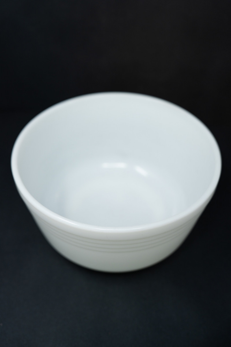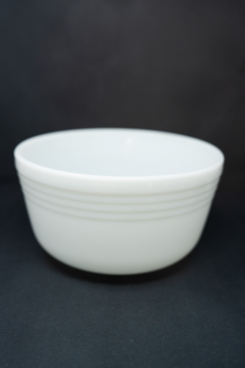 Vintage Pyrex Milk Glass Nesting Bowls with Matching Sherbet Cups – Mid-Century Modern – 1940s–50s A charming set of vintage Pyrex milk glass nesting bowls paired with four matching footed sherbet/ice cream cups. With their clean white finish and ribbed banding, this set embodies the durability and modern design that made Pyrex a kitchen icon. Maker: Pyrex (Bowls), with unmarked matching milk glass sherbet cups Era: Circa 1940s–1950s Material: Milk glass Design: Ribbed pattern nesting bowls and pedestal dessert cups Dimensions: Bowls: Approx. 7–8” diameter × 3.5–4” tall Sherbet Cups: Approx. 3–3.5” diameter × 3” tall Condition: Very good vintage condition; light surface wear consistent with age, no chips or cracks. Unlike Fire-King, Pyrex milk glass was produced in smaller runs and is harder to find today. Collectors prize these early Pyrex pieces for their classic utilitarian beauty and resilience. This set is perfect for both collectors and those seeking timeless kitchenware with a retro aesthetic.