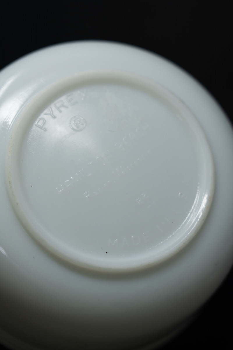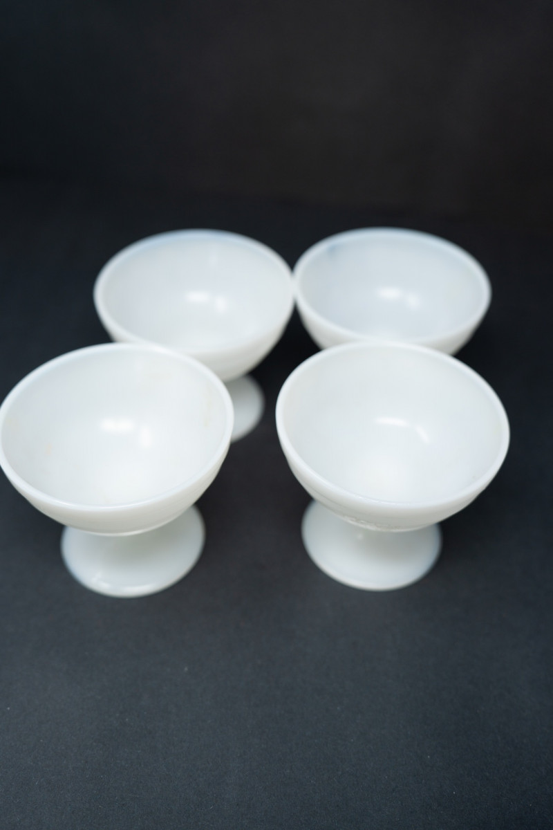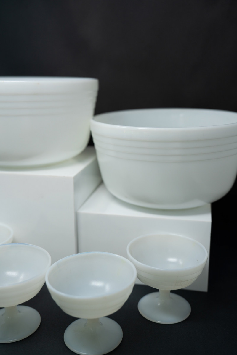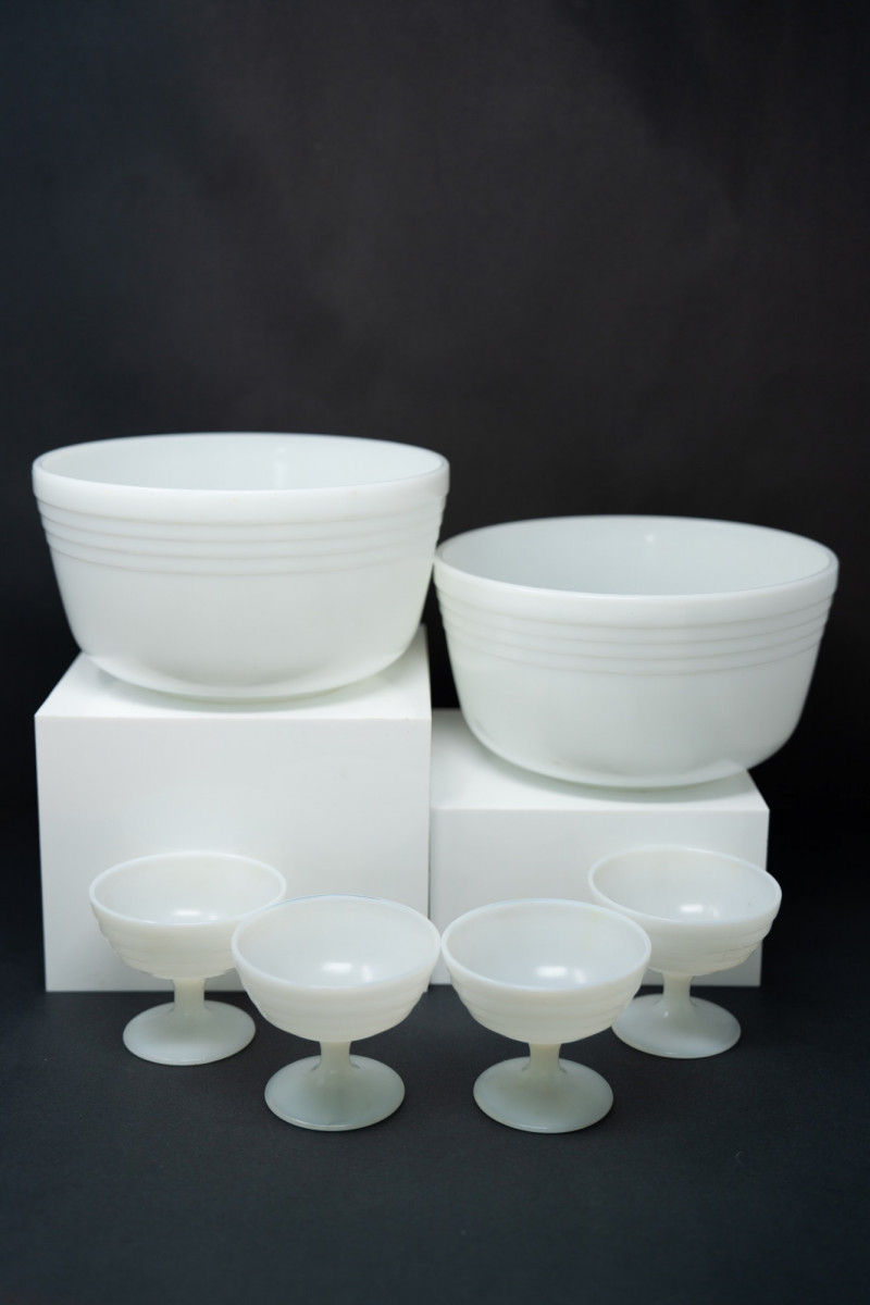 Lot # 76 - Vintage Pyrex Milk Glass Nesting Bowls with Matching Sherbet Cups