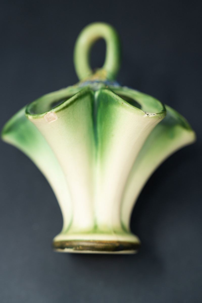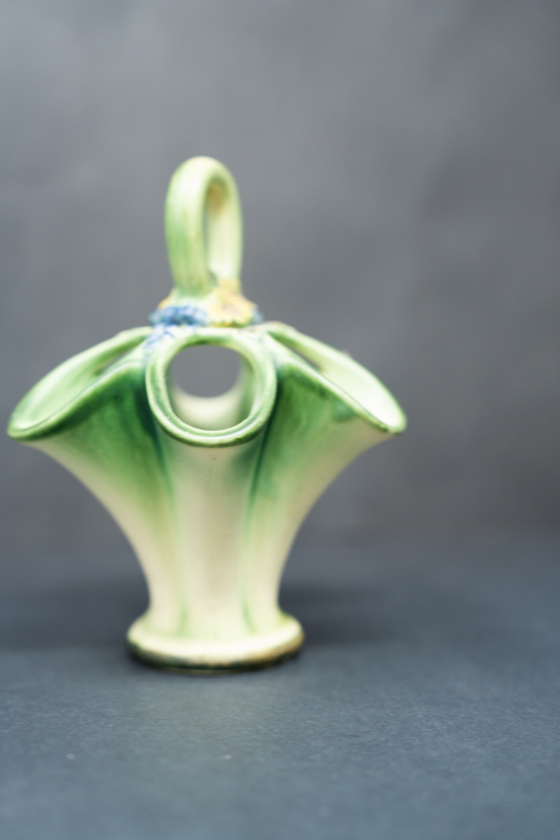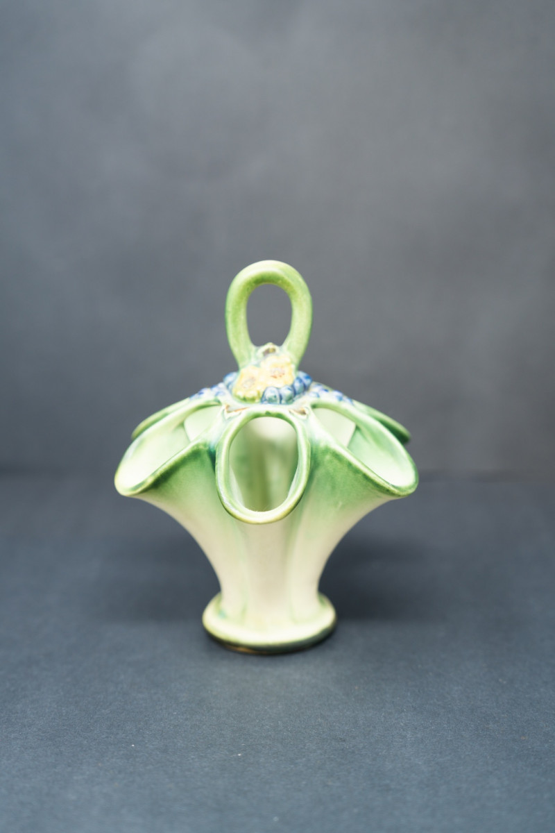 Vintage Weller Pottery Florenzo Umbrella Basket – Circa 1930s–40s – Green with Blueberries This rare Weller Pottery Florenzo umbrella basket features a sculptural cornucopia-style design with flaring petals and a loop handle. Decorated in a soft green glaze with hand-painted blueberry and leaf accents, it highlights Weller’s mastery of Art Deco and nature-inspired pottery. Maker: Weller Pottery Line/Pattern: Florenzo Era: Circa 1930s–40s Design: Sculptural umbrella/cornucopia form with loop handle and raised fruit detail Condition: Good vintage condition with two very minor chips and light crazing typical for age; no structural cracks-see photos Dimensions: Approx. 6–8" tall Value: Comparable examples sell for around $110 on Ruby Lane and other collectible pottery markets. Why it’s special: Weller Pottery was one of America’s foremost art pottery makers, admired for its hand-painted floral and fruit motifs. The Florenzo line is particularly collectible, and this basket is a rare decorative accent that also appeals strongly to pottery collectors.