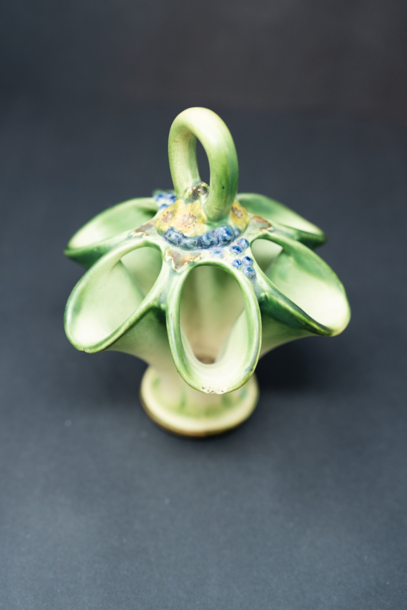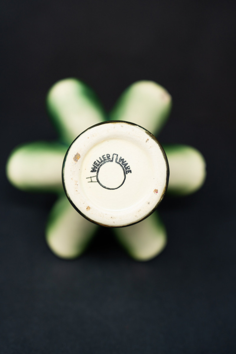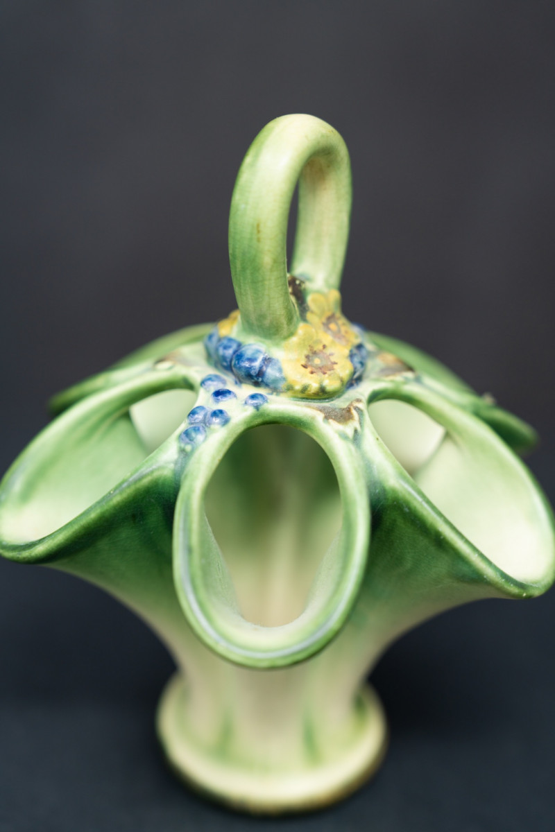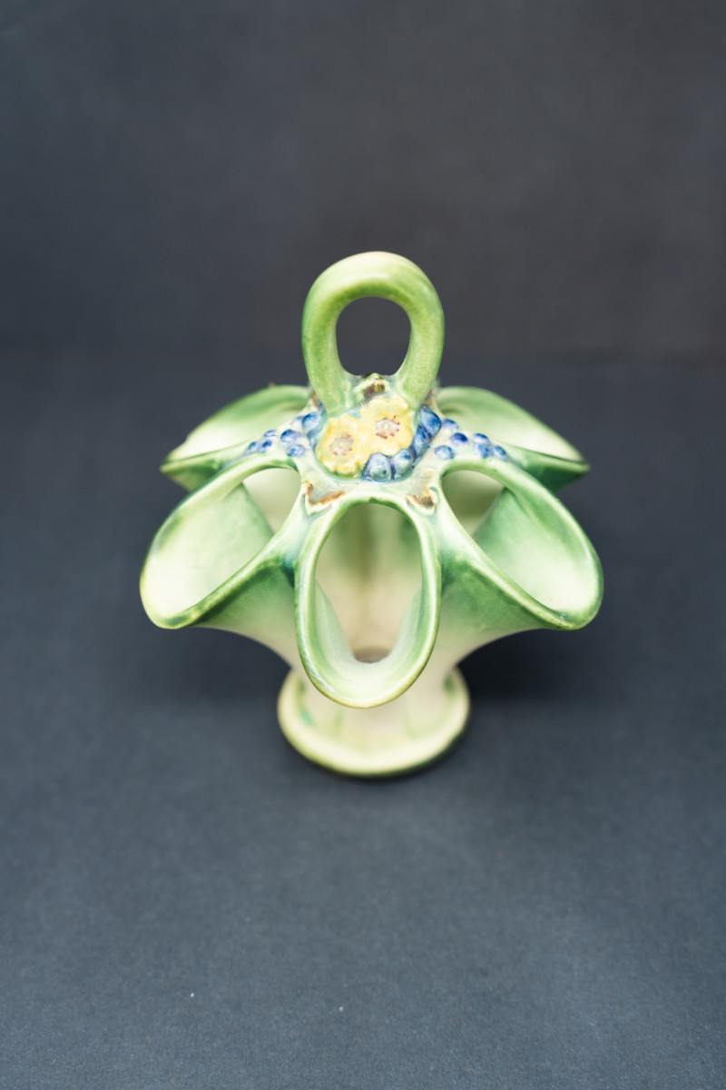 Vintage Weller Pottery Florenzo Umbrella Basket – Circa 1930s–40s – Green with Blueberries This rare Weller Pottery Florenzo umbrella basket features a sculptural cornucopia-style design with flaring petals and a loop handle. Decorated in a soft green glaze with hand-painted blueberry and leaf accents, it highlights Weller’s mastery of Art Deco and nature-inspired pottery. Maker: Weller Pottery Line/Pattern: Florenzo Era: Circa 1930s–40s Design: Sculptural umbrella/cornucopia form with loop handle and raised fruit detail Condition: Good vintage condition with two very minor chips and light crazing typical for age; no structural cracks-see photos Dimensions: Approx. 6–8" tall Value: Comparable examples sell for around $110 on Ruby Lane and other collectible pottery markets. Why it’s special: Weller Pottery was one of America’s foremost art pottery makers, admired for its hand-painted floral and fruit motifs. The Florenzo line is particularly collectible, and this basket is a rare decorative accent that also appeals strongly to pottery collectors.