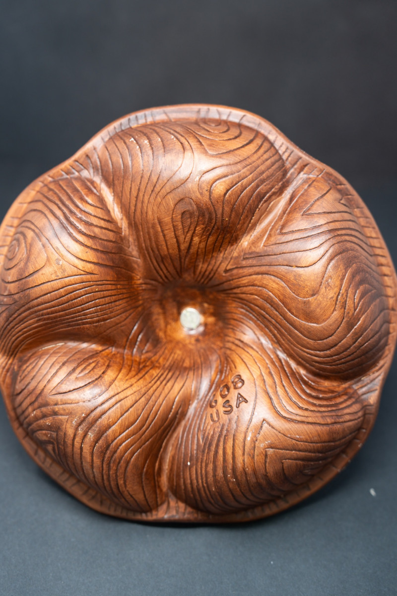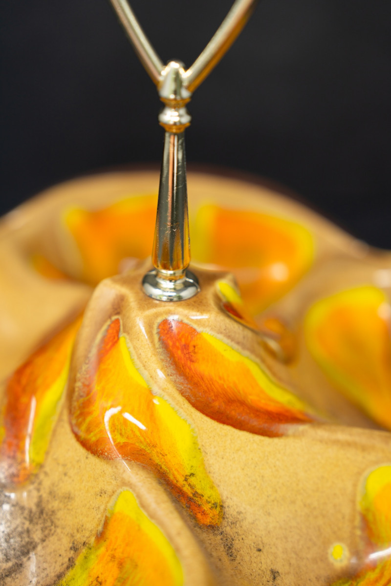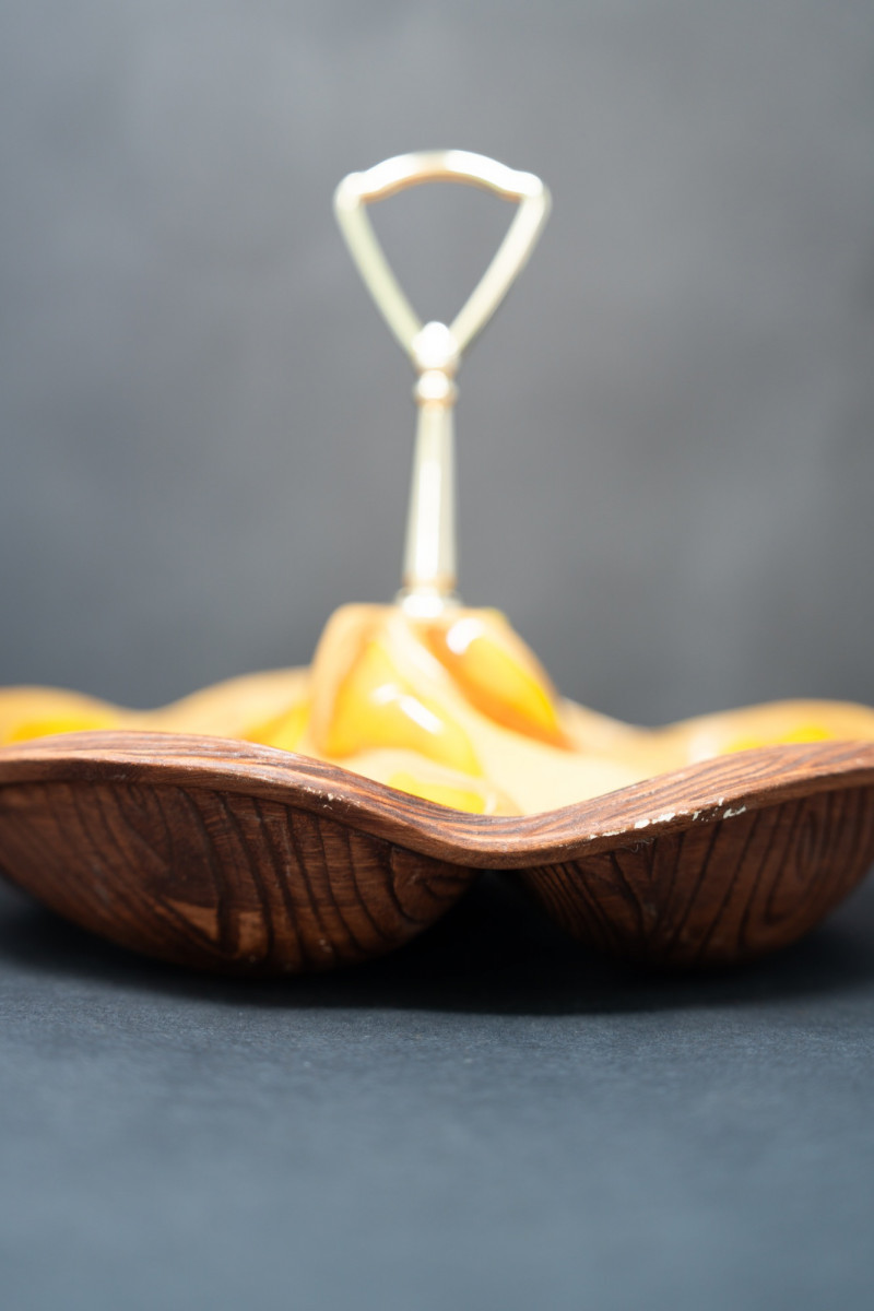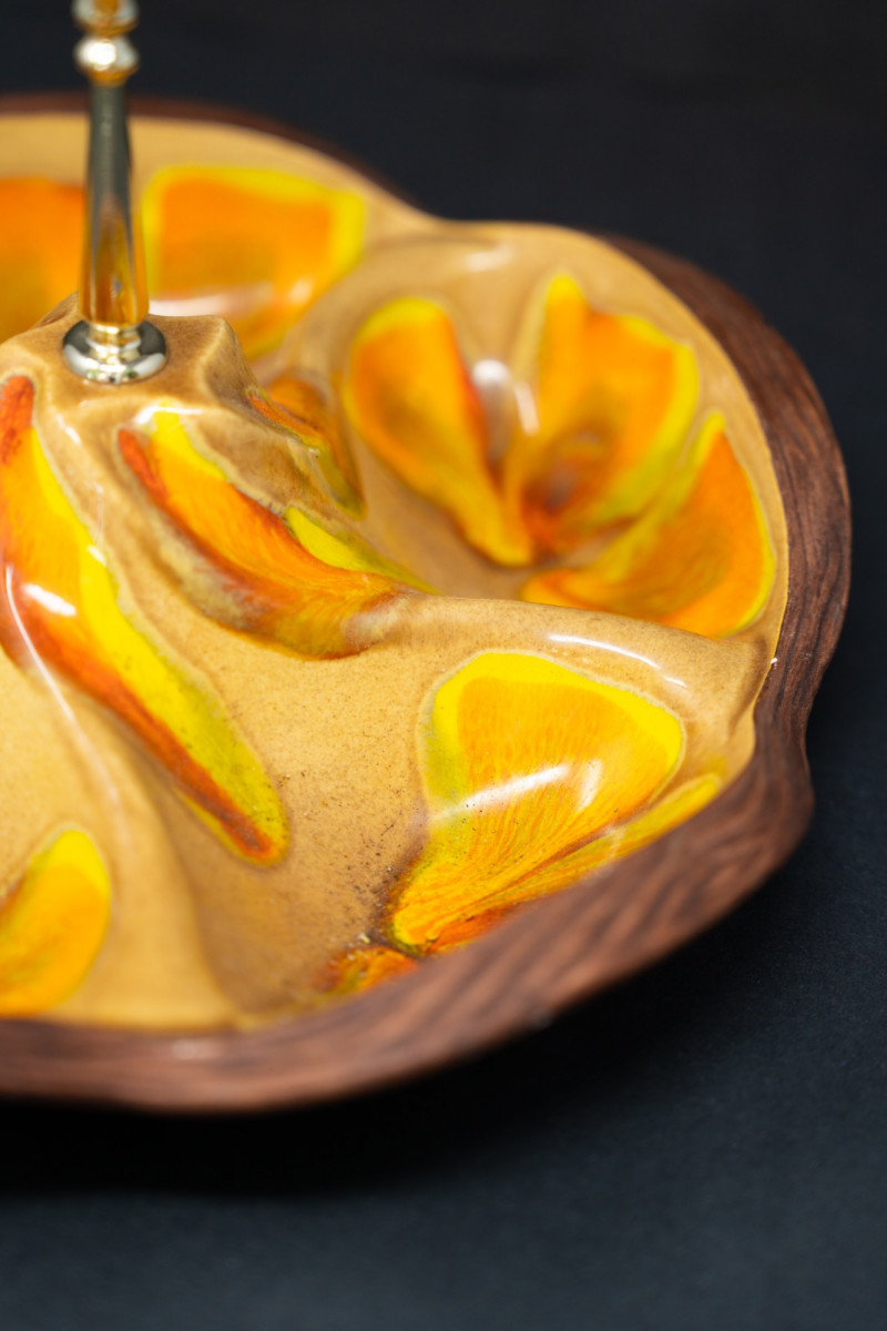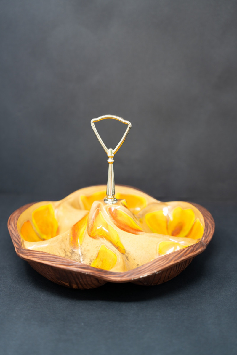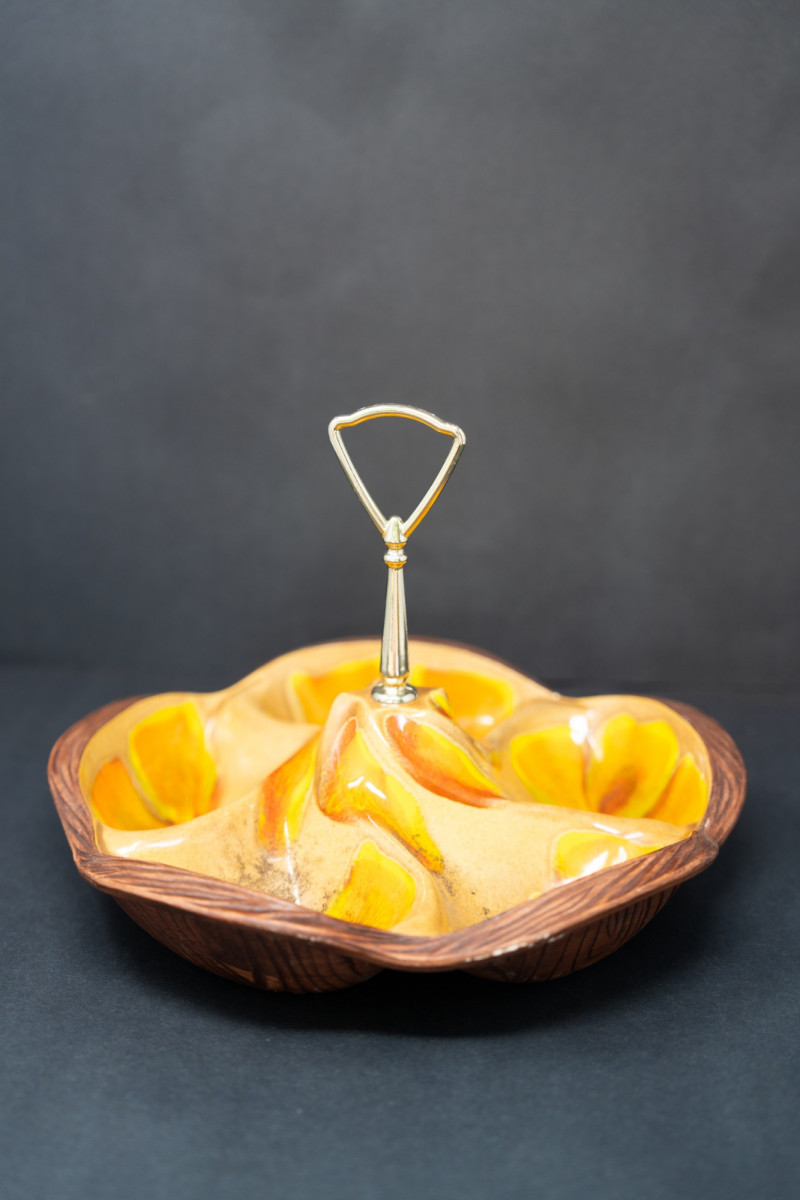 Vintage Mid-Century Modern Italian Ceramic & Wood Serving Tray – Orange & Yellow Glaze This vibrant mid-century serving tray combines bold ceramic artistry with warm wood craftsmanship. Featuring sculptural ceramic compartments in vivid orange and yellow glaze, set into a carved wood base with a central chrome handle, it’s both functional and strikingly decorative. Perfect for serving snacks, hors d'oeuvres, or simply displaying as a retro centerpiece. Maker: Attributed Italian pottery (unmarked, but in the style of Bitossi / mid-century imports) Era: Circa 1960s–1970s Material: Ceramic, wood, chrome handle Design: Multi-compartment serving dish with organic sculptural form Dimensions: Approx. 10–12" across (estimate) Condition: Great vintage condition with minor wear consistent with age. Two small chips on orange part/glaze. Ceramic glaze is glossy and vibrant; wood base has light surface wear. Why it’s special: A retro entertaining piece that blends organic modern design with bold color, sure to bring warmth and conversation to any table.