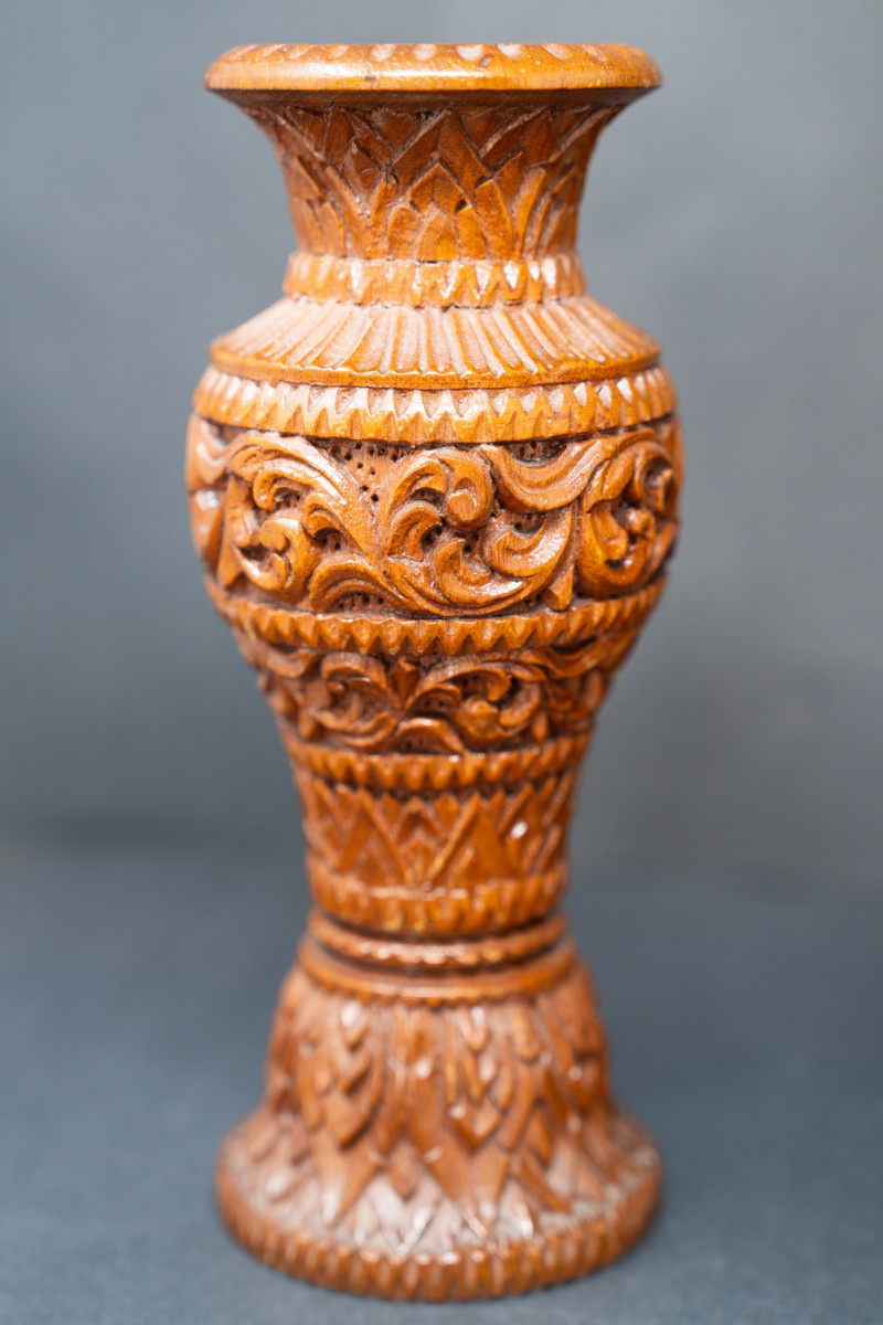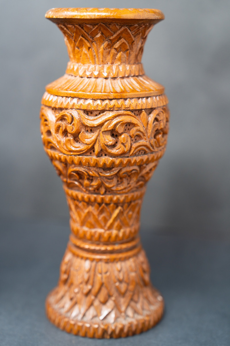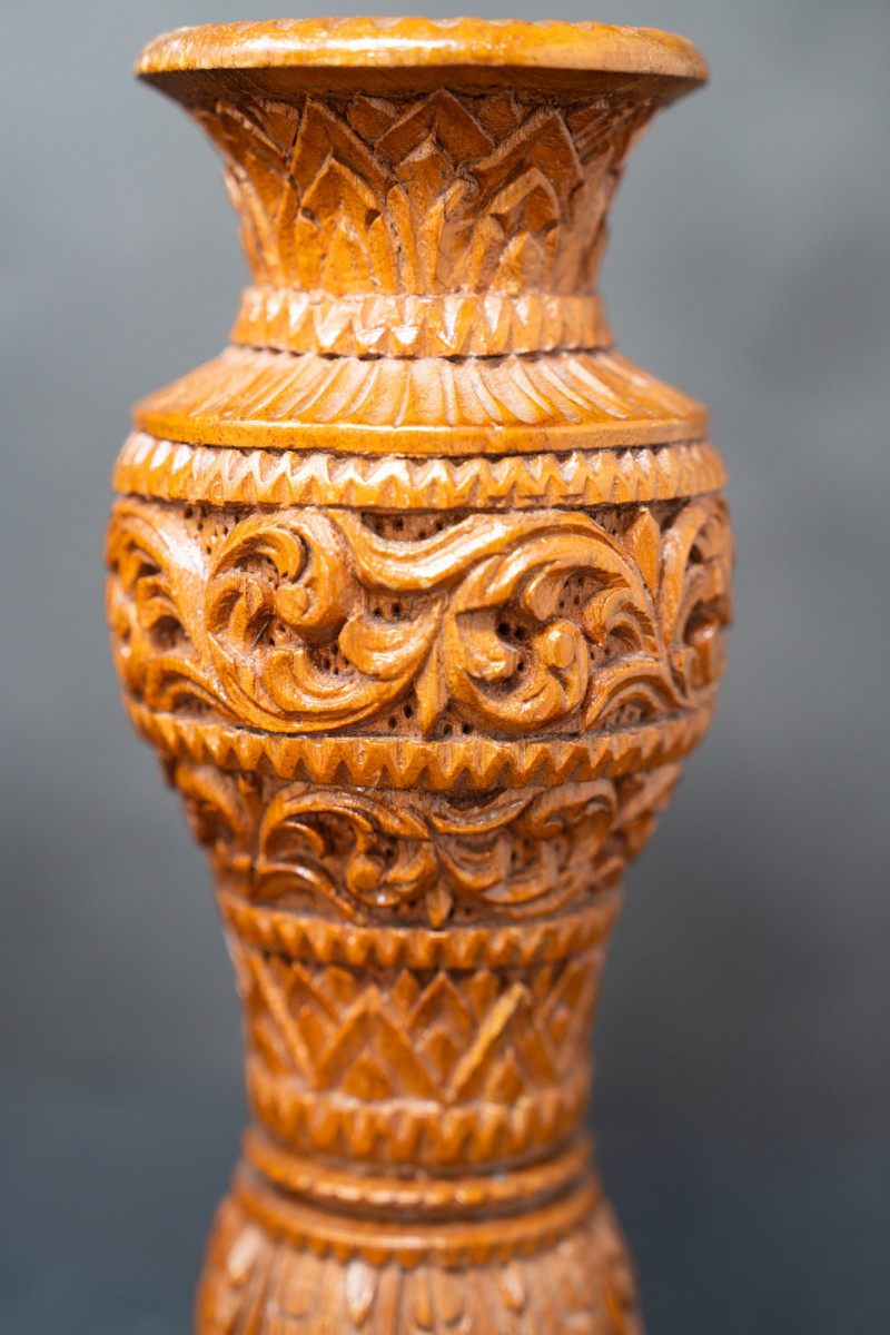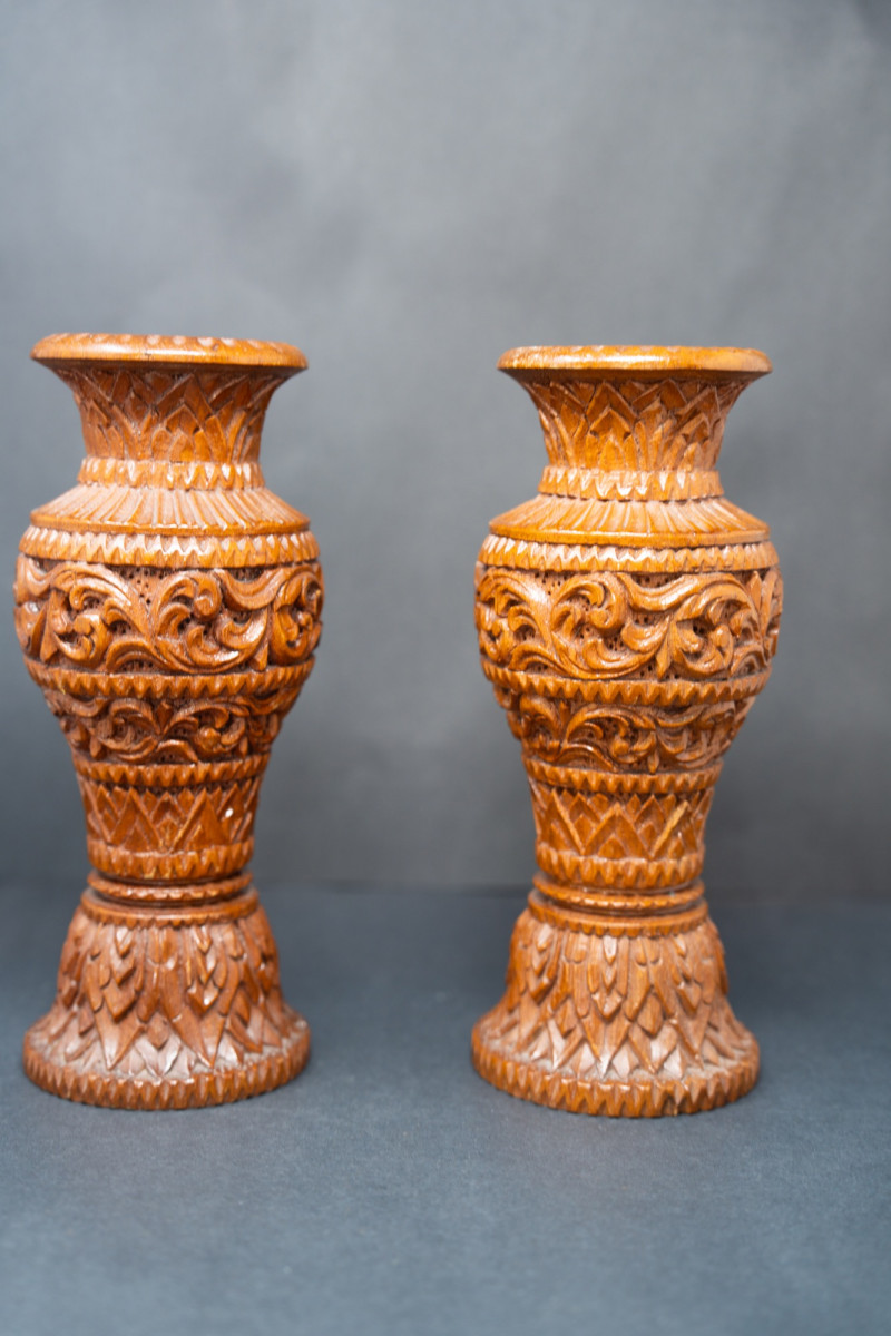 Pair of Vintage Hand-Carved Wooden Candle Holders – Ornate Floral & Geometric Detailing This striking pair of hand-carved wooden candle holders showcases intricate craftsmanship with detailed floral scrollwork and geometric motifs. Each piece is finely sculpted from solid wood, designed to hold taper candles, and finished with a warm, natural patina. Likely originating from Southeast Asia (such as the Philippines or Thailand), these candle holders blend traditional artistry with practical use. Material: Solid carved wood Design: Ornate floral scroll and geometric patterning with flared tops for taper candles Era: Mid-20th century (1960s–70s, artisan-made) Dimensions: Approx. 10–12" tall (estimate) Condition: Very good vintage condition with light wear consistent with age. No major cracks or chips noted.