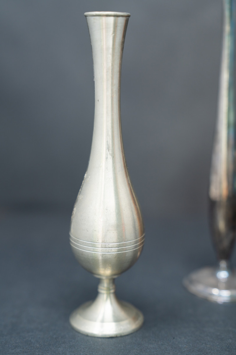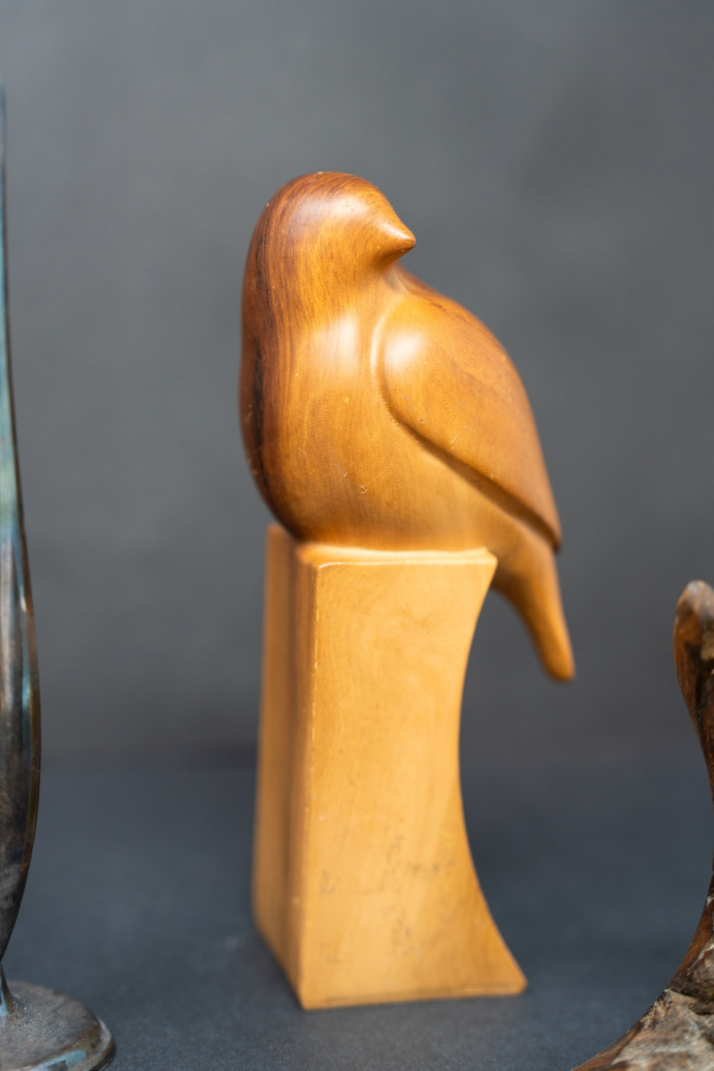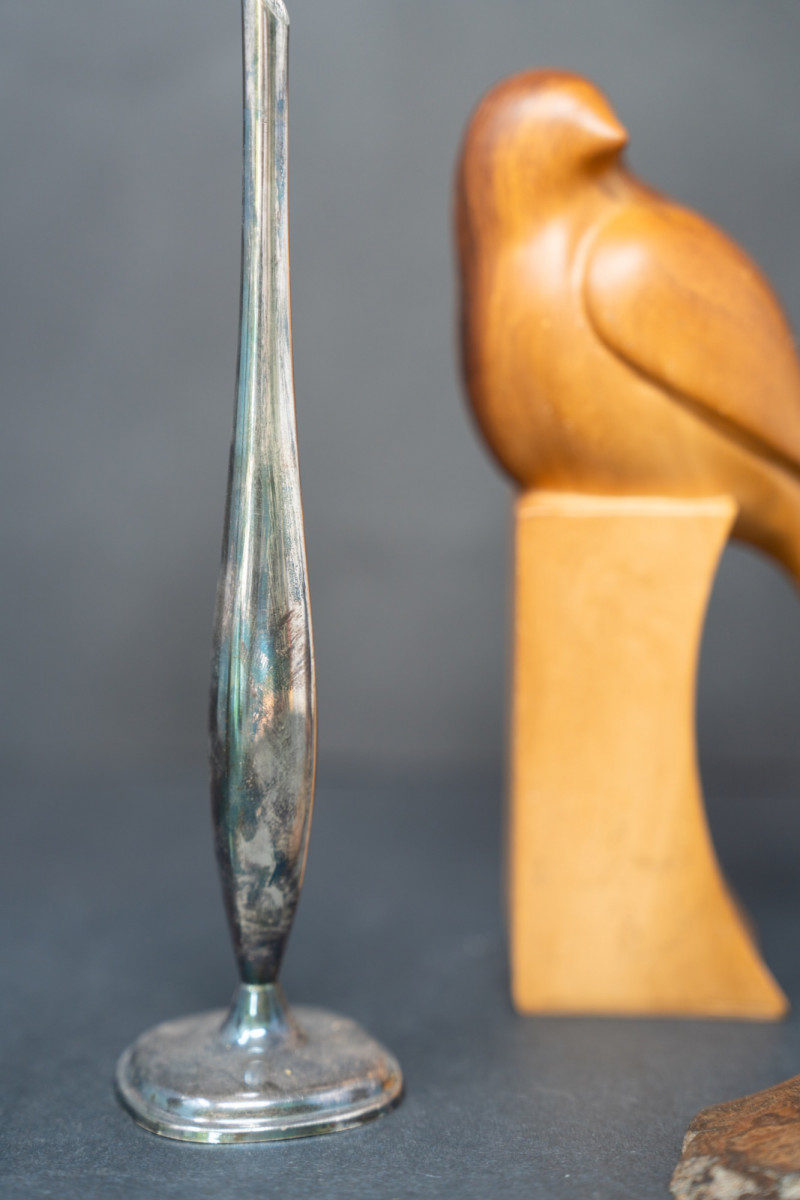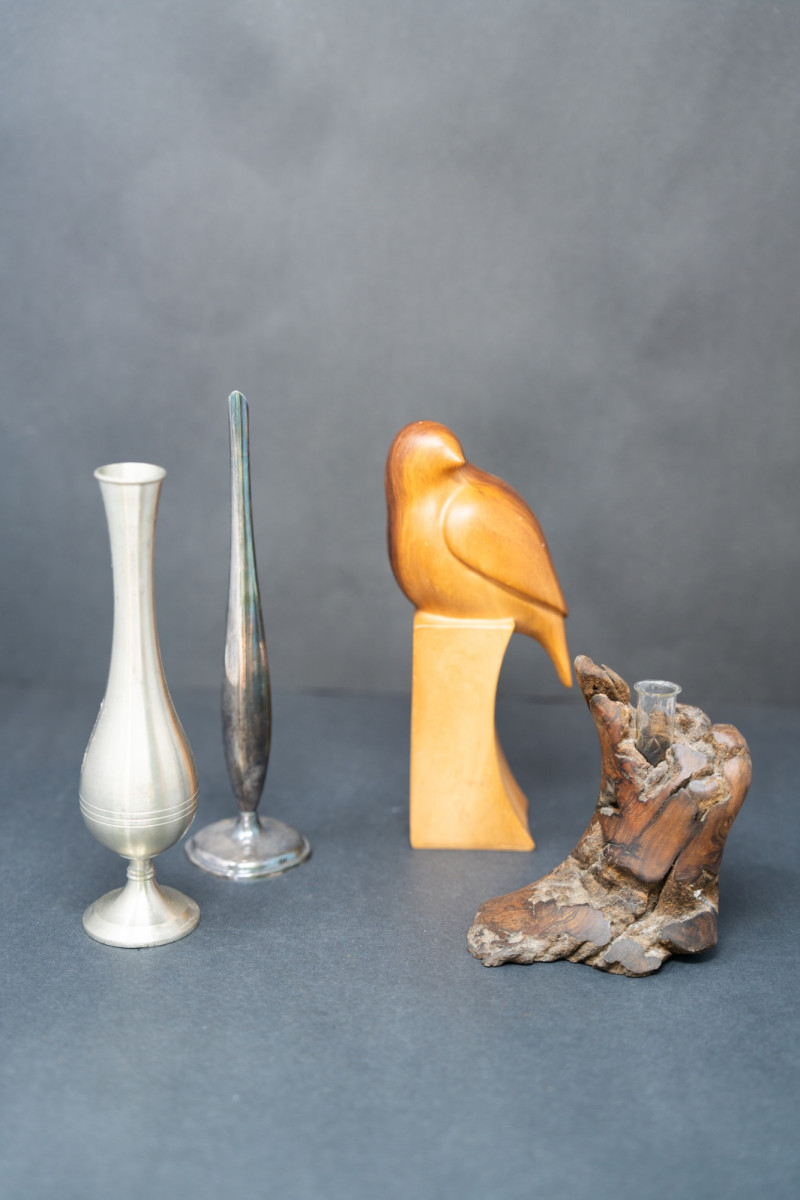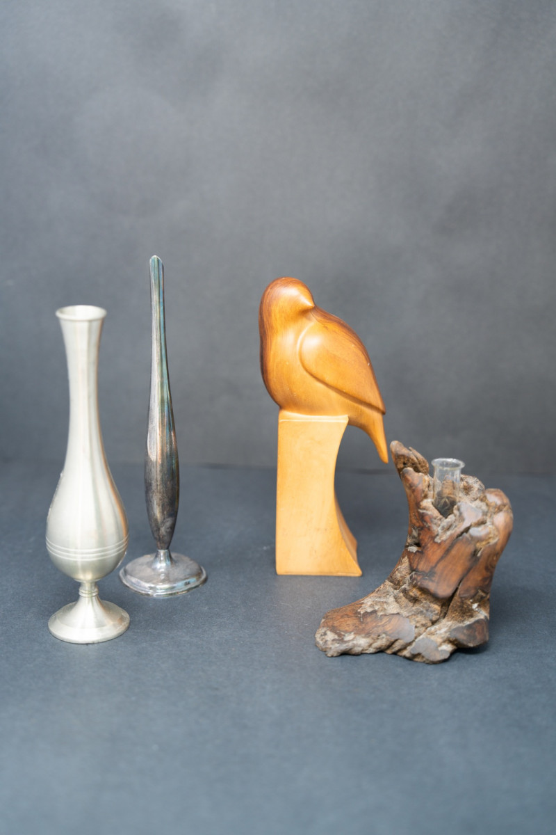 Lot # 85 - 4 Vintage Decorative Accents – Metal Bud Vases, Wood Bird Sculpture