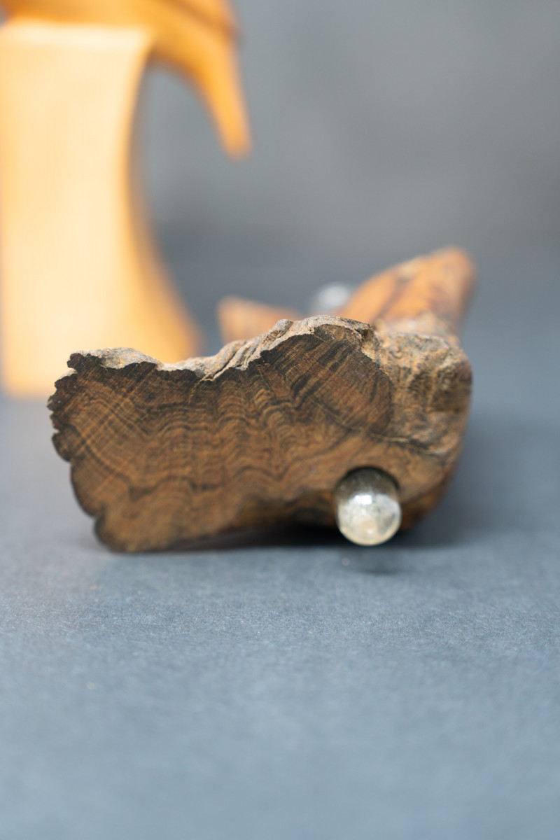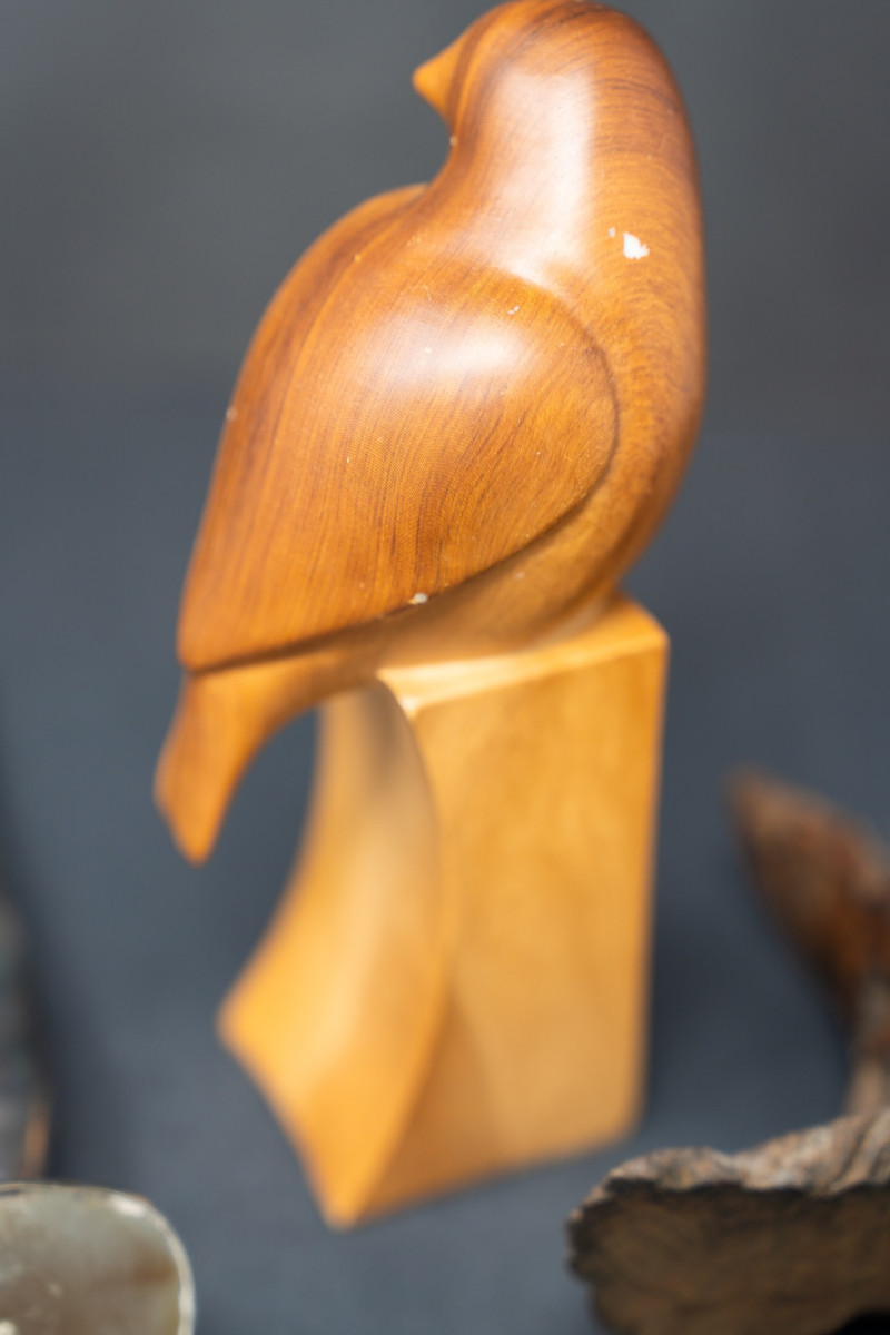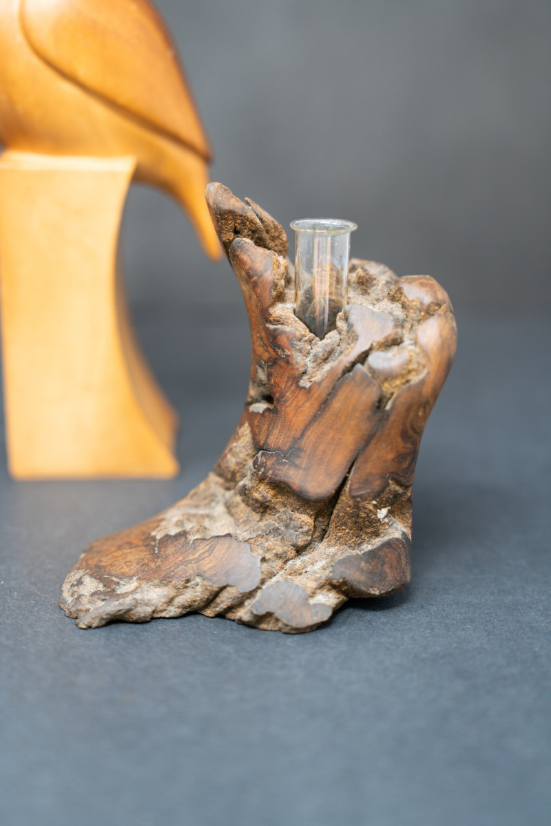 Lot of 4 Vintage Decorative Accents – Metal Bud Vases, Wood Bird Sculpture & Driftwood Holder A curated lot of four unique vintage accent pieces, perfect for display or gifting. This mix of materials and forms brings together mid-century metalwork, natural wood, and artisan craft: Tall Silver-Tone Bud Vase – Slender, flared lip design. Light patina from age. Modernist Pewter/Metal Bud Vase – Sleek, tapered silhouette, showing natural tarnish for character. Carved Wood Bird Sculpture – Minimalist form with smooth finish, perched on a block base. Driftwood Holder with Glass Insert – Rustic natural form with inset glass, usable for small flowers or incense. Era: Mid-20th century (1950s–70s mix) Dimensions: Range from approx. 4" to 8" tall Condition: Good vintage condition with light age patina and wear; natural imperfections on driftwood. Why it’s special: This is a ready-made display collection that blends modernist metal, organic wood carving, and naturalistic driftwood. Works beautifully on a shelf, mantle, or as part of a larger vintage vignette.