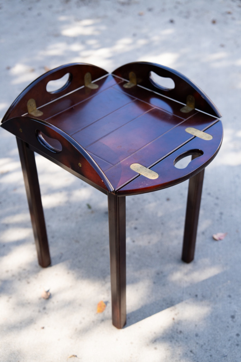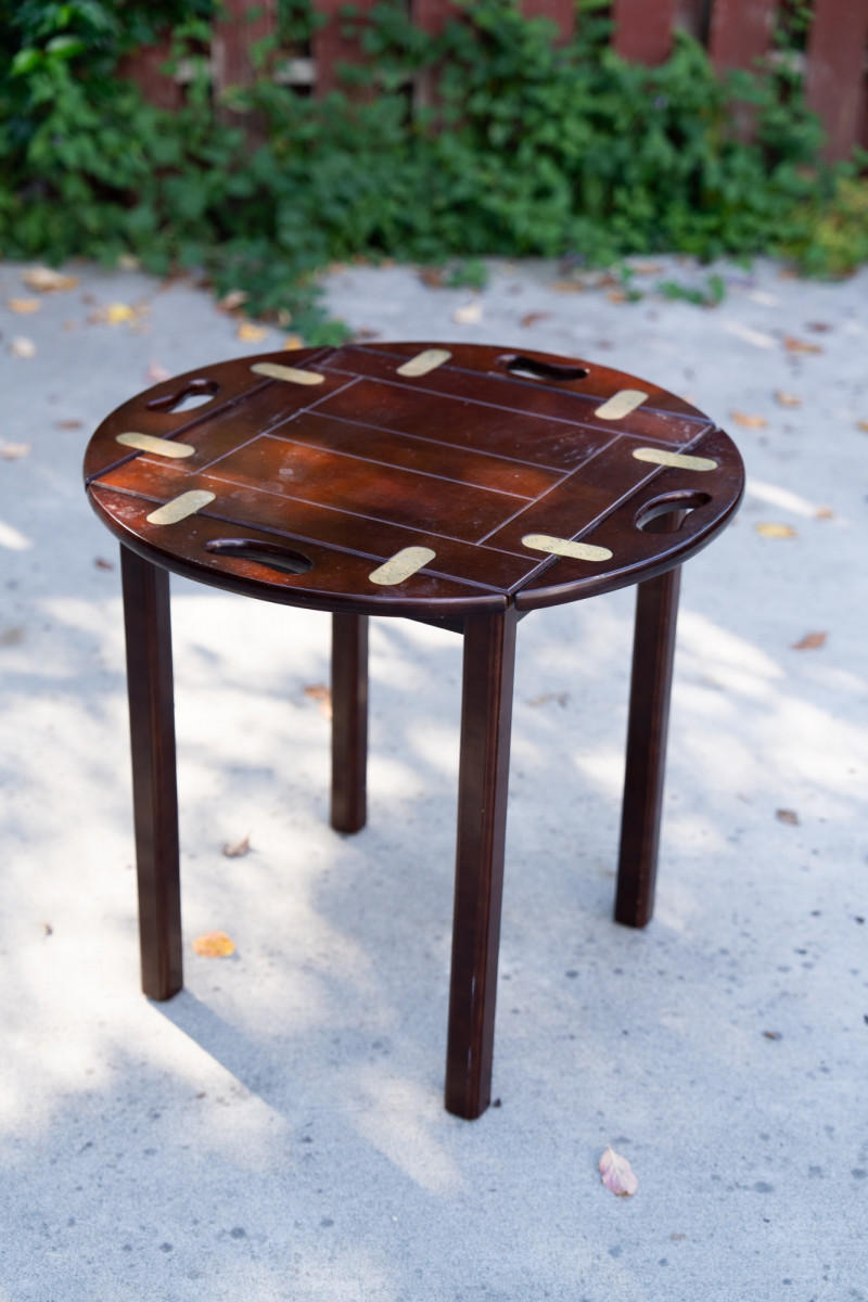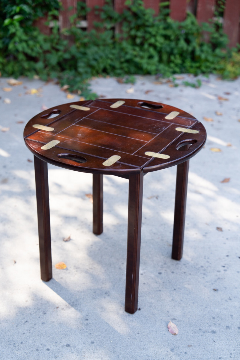 Vintage Bombay Company Butler’s Tray Table – Dark Stained Wood with Brass Inlay – Late 20th Century This elegant butler’s tray table from The Bombay Company is a classic late 20th-century design, crafted in dark stained wood with brass inlay accents. The removable tray top features brass hinge details and convenient cut-out handles, combining functionality with timeless style. Maker: The Bombay Company Era: Late 20th Century Material: Wood with brass inlay Design: Butler’s tray style with removable top Measurements: Approx. 22"–24" tall, 20"–22" diameter Condition: Good vintage condition with light wear consistent with age and use. Historical Note: Butler’s tray tables originated in 18th-century England as practical yet refined furnishings used by household staff for serving food and drink. The design—with a removable tray and folding base—allowed for versatility and elegance in entertaining. The Bombay Company revived these traditional English-inspired pieces in the late 20th century, offering affordable luxury with timeless appeal. Value: Comparable tables retail between $250–$800 This versatile table works beautifully as a side table, accent piece, or serving tray in traditional and transitional interiors.
