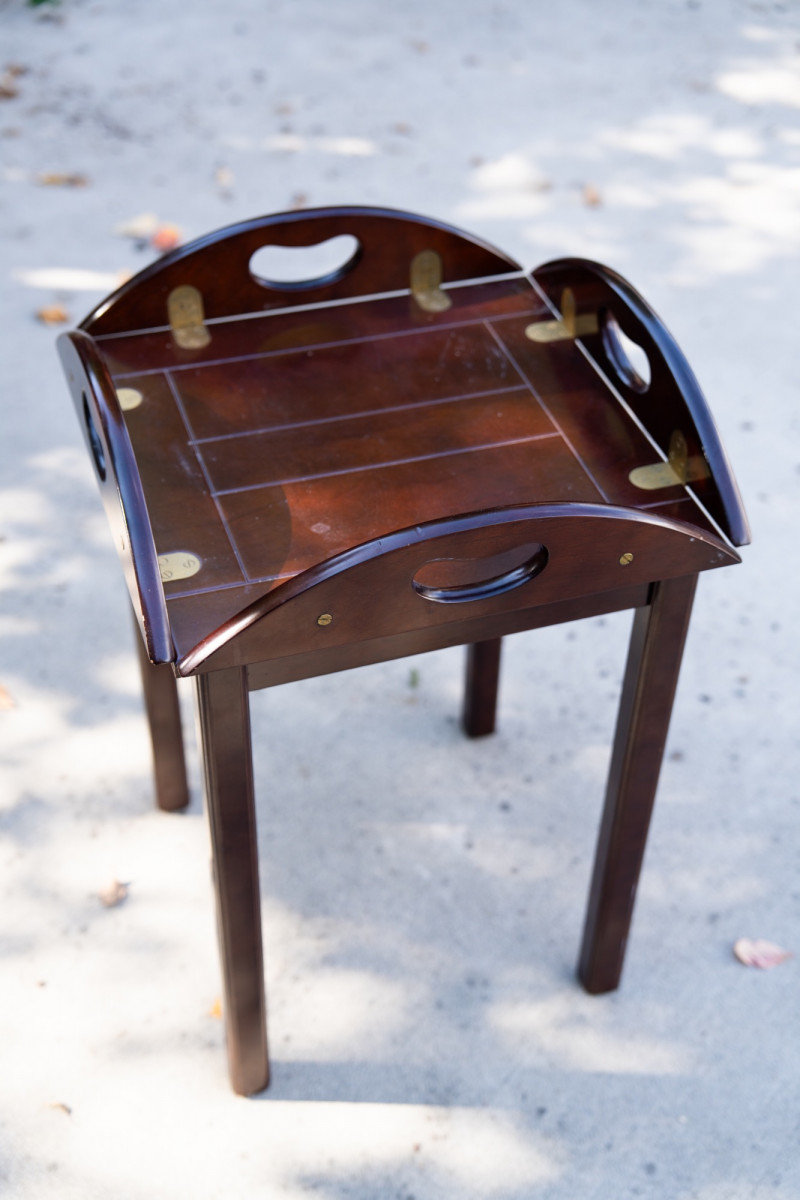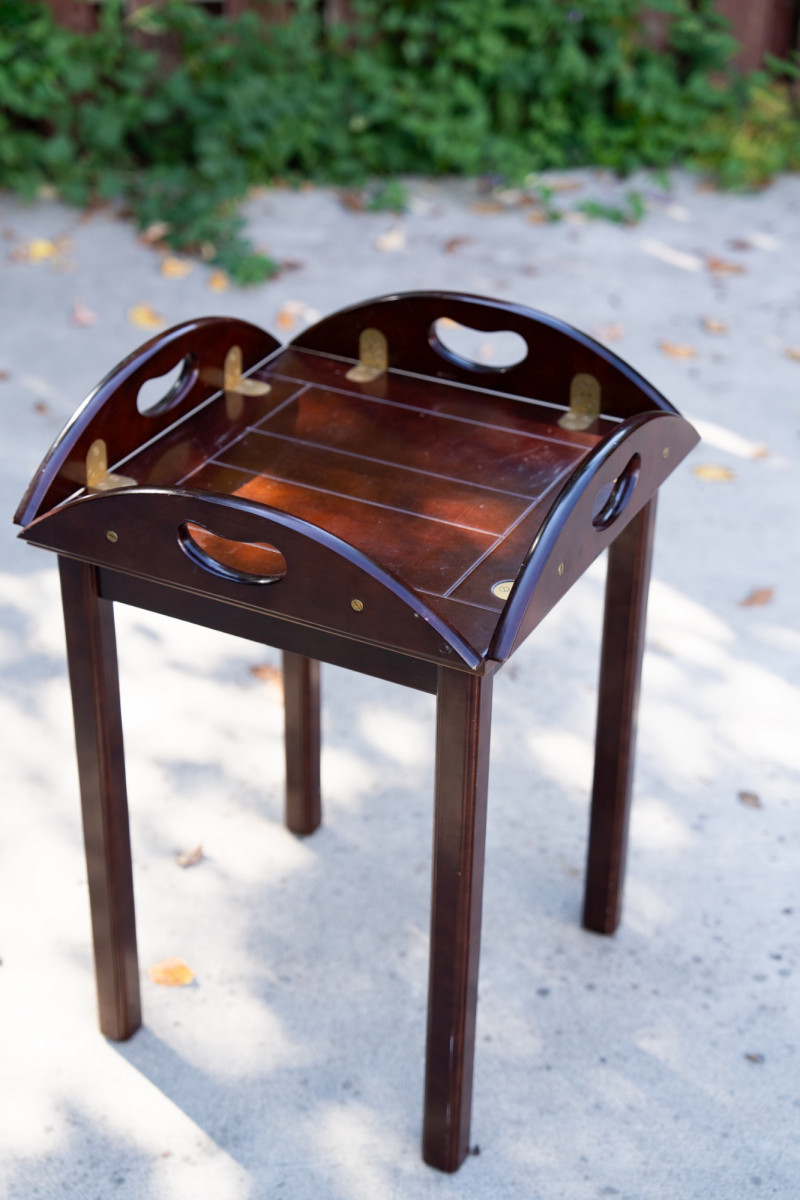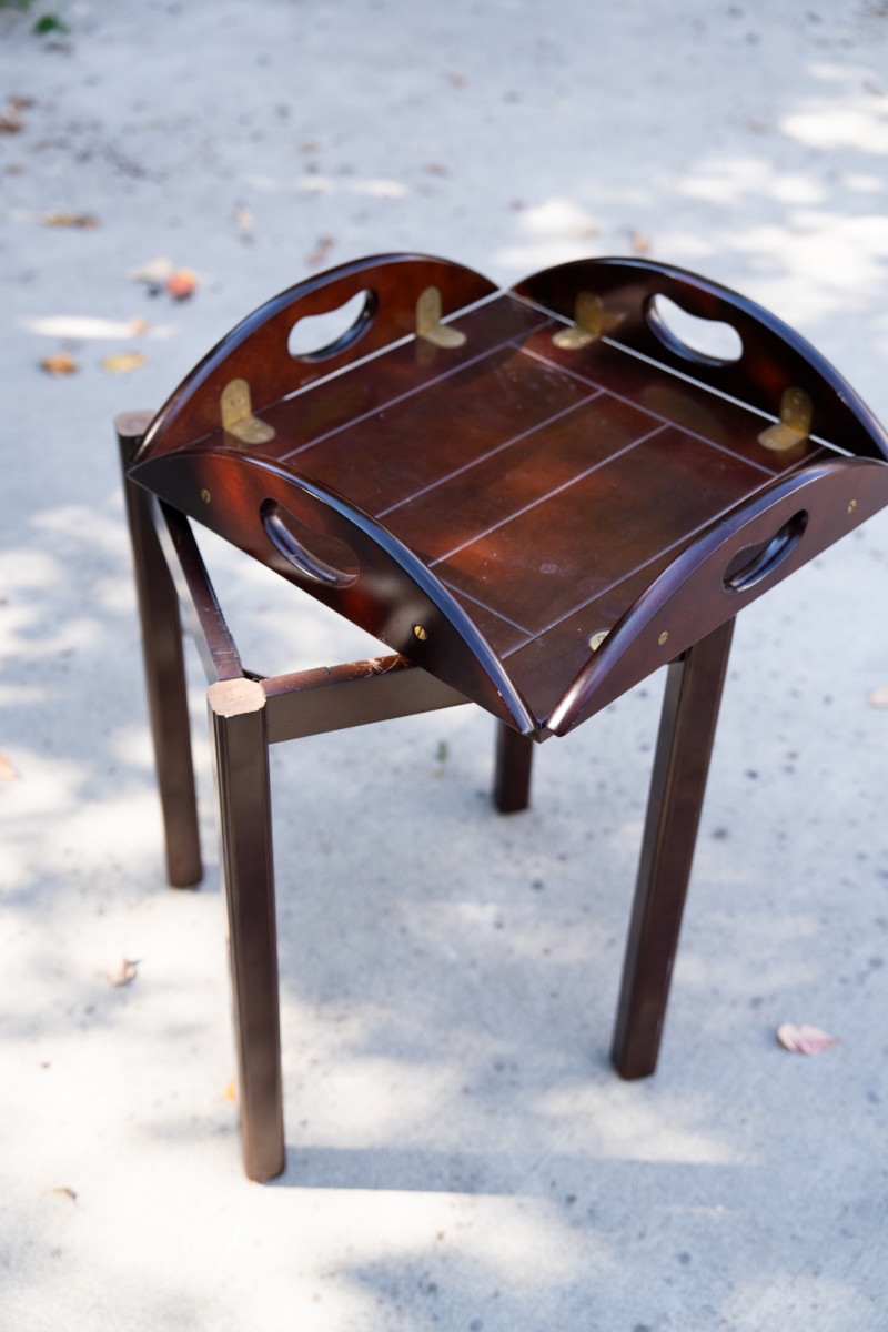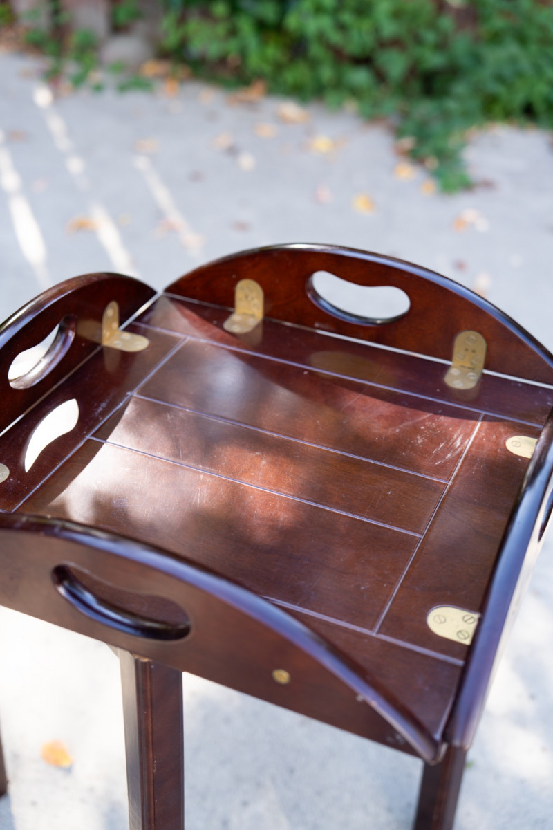 Vintage Bombay Company Butler’s Tray Table – Dark Stained Wood with Brass Inlay – Late 20th Century This elegant butler’s tray table from The Bombay Company is a classic late 20th-century design, crafted in dark stained wood with brass inlay accents. The removable tray top features brass hinge details and convenient cut-out handles, combining functionality with timeless style. Maker: The Bombay Company Era: Late 20th Century Material: Wood with brass inlay Design: Butler’s tray style with removable top Measurements: Approx. 22"–24" tall, 20"–22" diameter Condition: Good vintage condition with light wear consistent with age and use. Historical Note: Butler’s tray tables originated in 18th-century England as practical yet refined furnishings used by household staff for serving food and drink. The design—with a removable tray and folding base—allowed for versatility and elegance in entertaining. The Bombay Company revived these traditional English-inspired pieces in the late 20th century, offering affordable luxury with timeless appeal. Value: Comparable tables retail between $250–$800 This versatile table works beautifully as a side table, accent piece, or serving tray in traditional and transitional interiors.