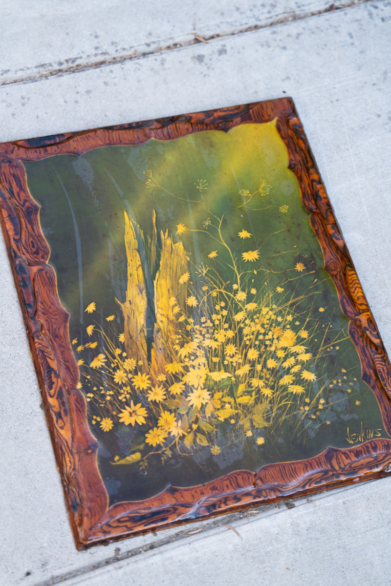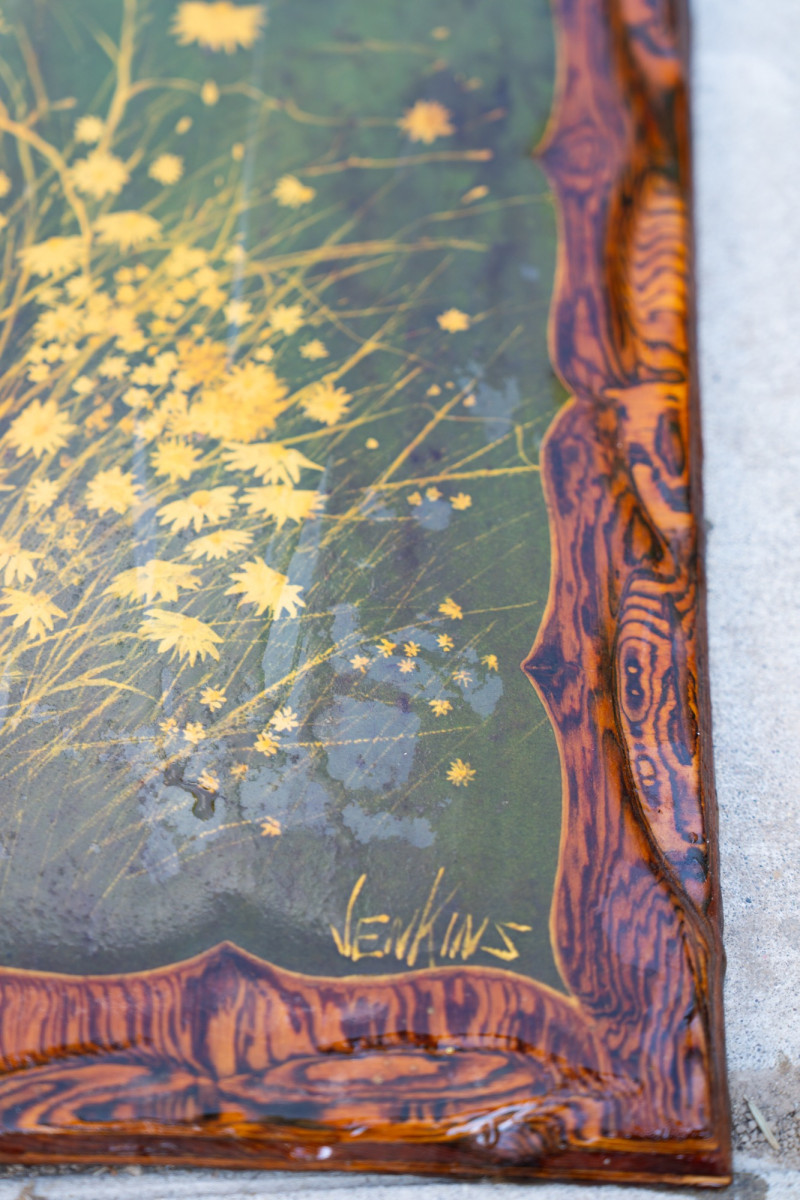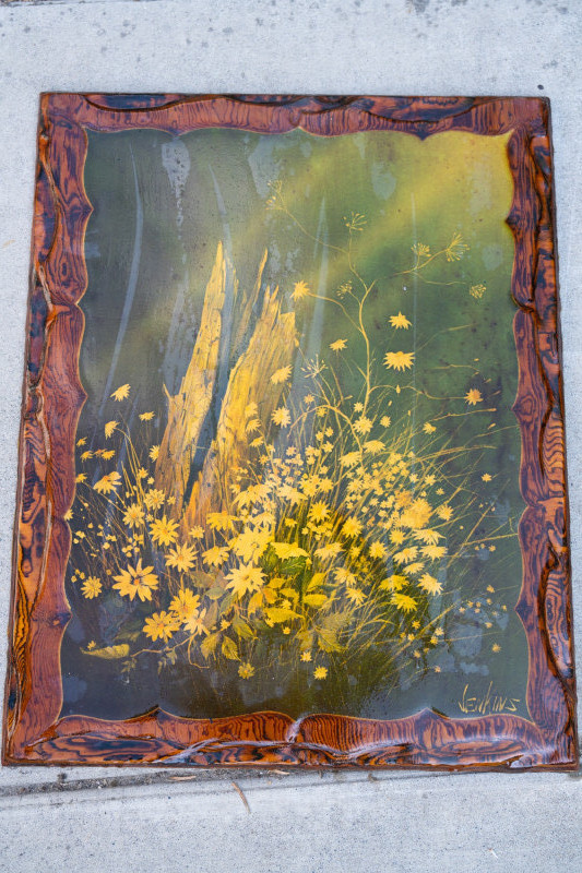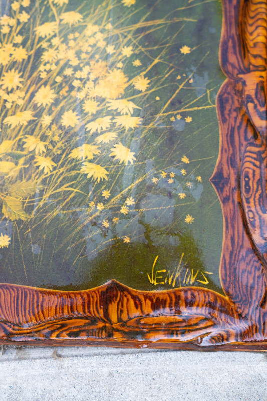 Vintage Reverse-Painted Floral Glass Wall Art – Signed Jenkins – Rustic Frame A striking reverse-painted glass artwork featuring a field of golden-yellow wildflowers against a natural green background, with a central weathered tree stump motif. The frame is designed in a faux bois (woodgrain) style, giving the entire piece a rustic, handcrafted appearance. Artist: Signed Jenkins (lower right) Medium: Reverse-painted glass with molded faux bois border Era: Mid-20th century (likely 1960s–1970s) Design: Golden yellow florals with woodland tree stump and naturalistic background Measurements: Approx. 16" x 12" Condition: Vintage condition with light wear consistent with age; some surface marks to glass and frame, but overall vibrant and intact. Historical Note: Reverse painting on glass has roots going back centuries but gained renewed popularity in the 20th century for decorative wall panels and mirrors. Pieces like this, with rustic faux bois frames and natural floral subjects, were especially popular in mid-century American homes.