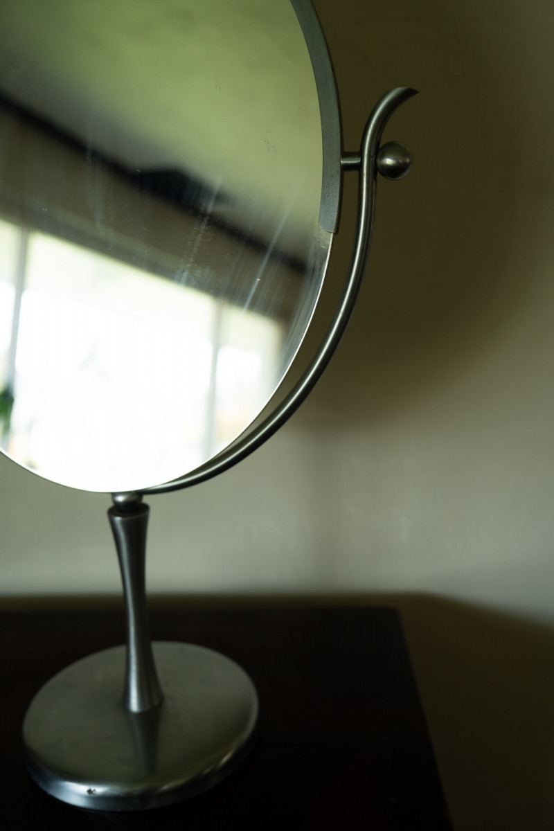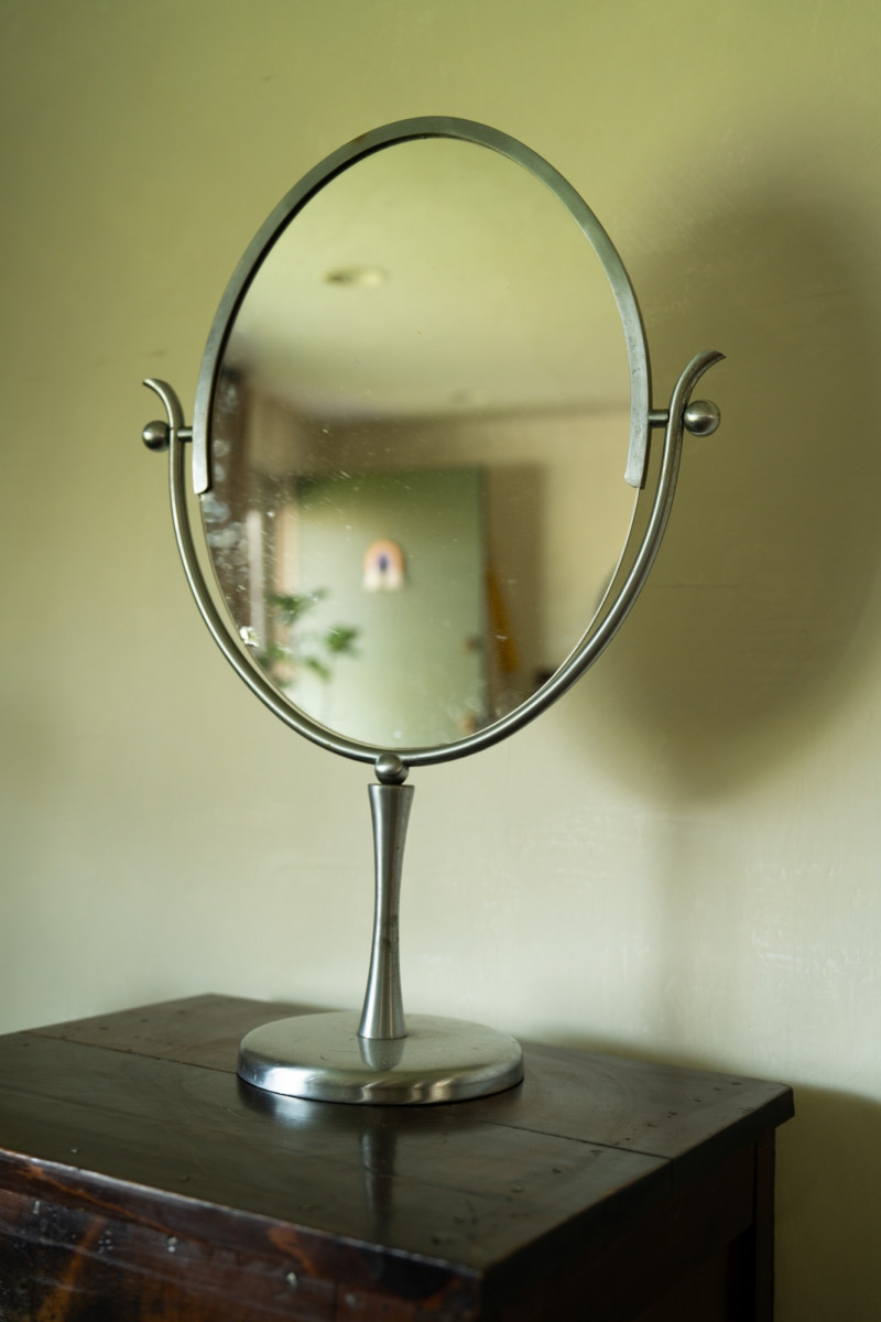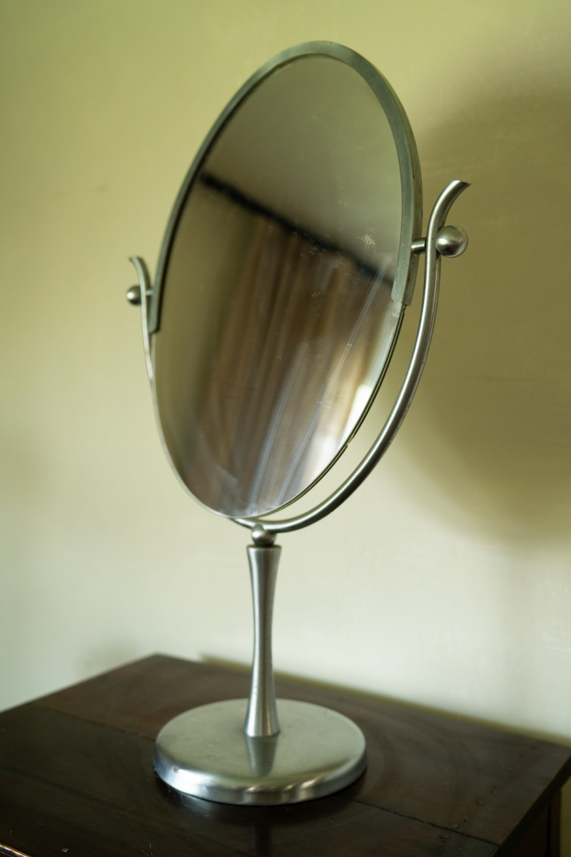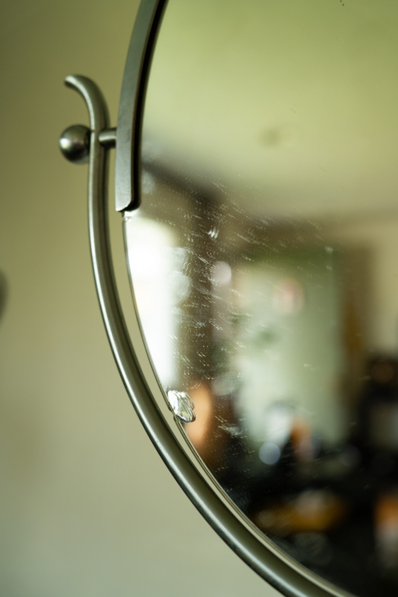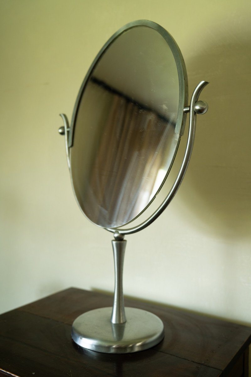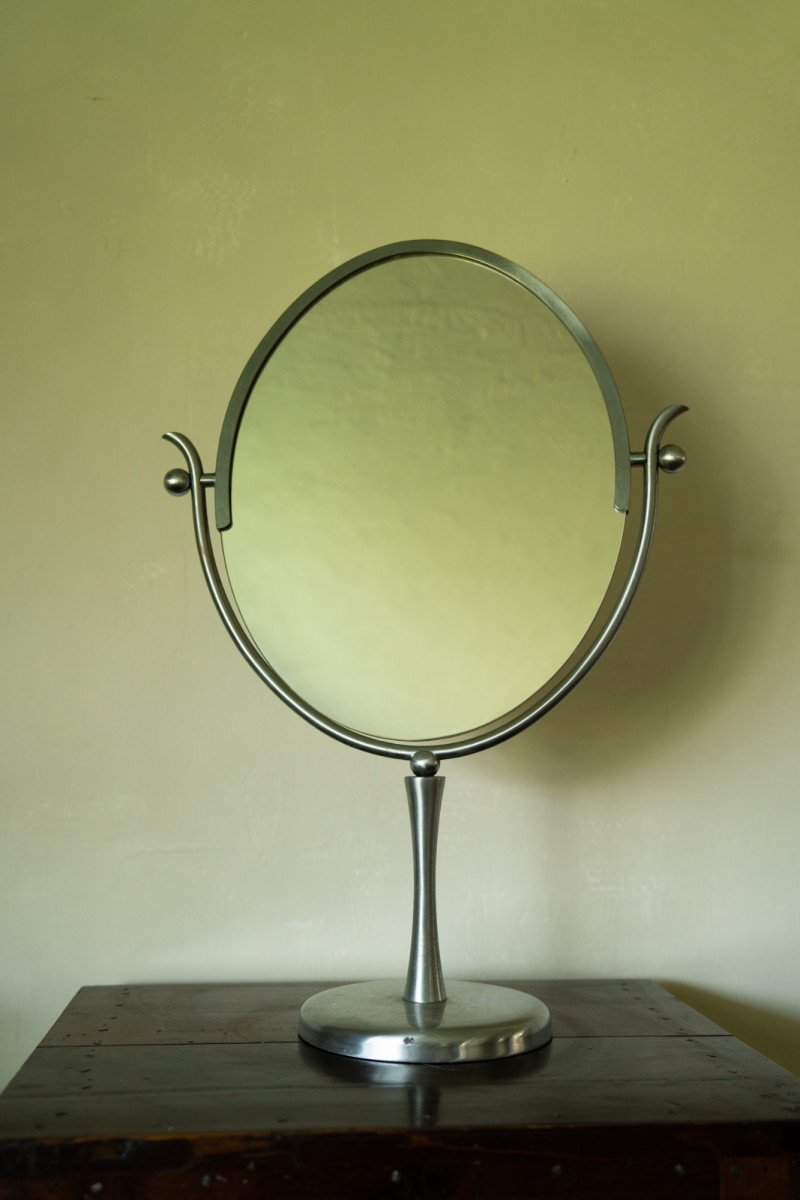 Charles Hollis Jones Style “Wishbone” Vanity Mirror – Satin Chrome, Mid-Century Modern A striking mid-century modern vanity mirror in the style of Charles Hollis Jones’ iconic “Wishbone” design. This piece features a satin chrome finish, sculptural wishbone-shaped arms, and a circular swivel mirror mounted on a weighted base. The clean lines and space-age silhouette embody Jones’ celebrated blend of Hollywood Regency glamour and modernist form. Designer/Style: In the style of Charles Hollis Jones, “Wishbone” mirror Era: Mid-Century Modern, c. 1960s–70s Material: Satin chrome-plated metal with glass mirror Measurements: Approx. 18–20" tall × 10" wide (mirror diameter approx. 8–9") Condition: Very good vintage condition with light surface wear consistent with age-one small chip on one side on bottom side see photos Why It’s Special: Mirrors in this style are highly collectible — original Charles Hollis Jones designs are sought after by decorators and collectors worldwide, with comparable examples listed on 1stDibs for $1,800+. Value Note: While not confirmed as an authenticated Jones piece, this mirror is stylistically identical and presents beautifully as a sculptural mid-century accent.