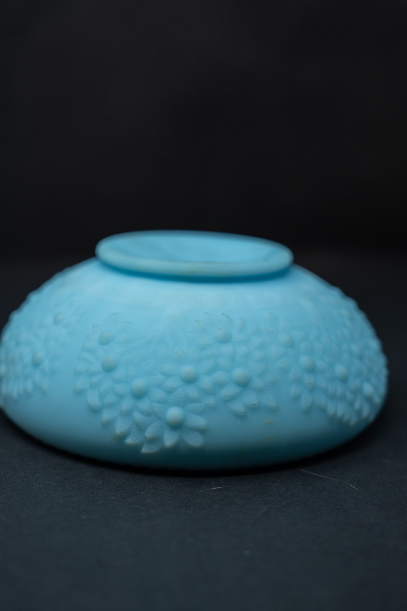 Vintage Fenton Satin Blue Glass Bowl – Grape & Cable Pattern – Mid-Century A beautiful satin blue pressed glass bowl by Fenton Art Glass, featuring the beloved Grape & Cable pattern with raised grape clusters and vines. The frosted satin finish gives it a soft, ethereal look, while the rounded form and gently crimped edge add classic mid-century elegance. Maker: Fenton Art Glass Pattern: Grape & Cable Color/Finish: Satin Blue Era: Mid-20th Century (circa 1950s–60s) Measurements: Approx. 5–6" diameter × 2–3" tall Condition: Very good vintage condition with light wear consistent with age (no cracks or major chips noted).