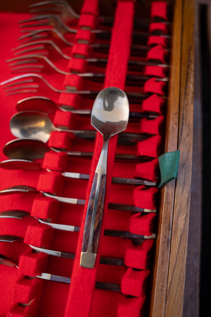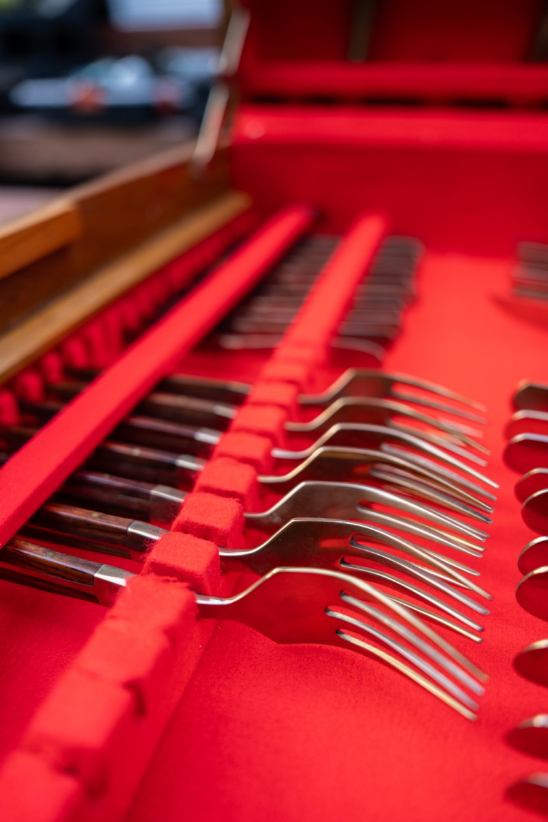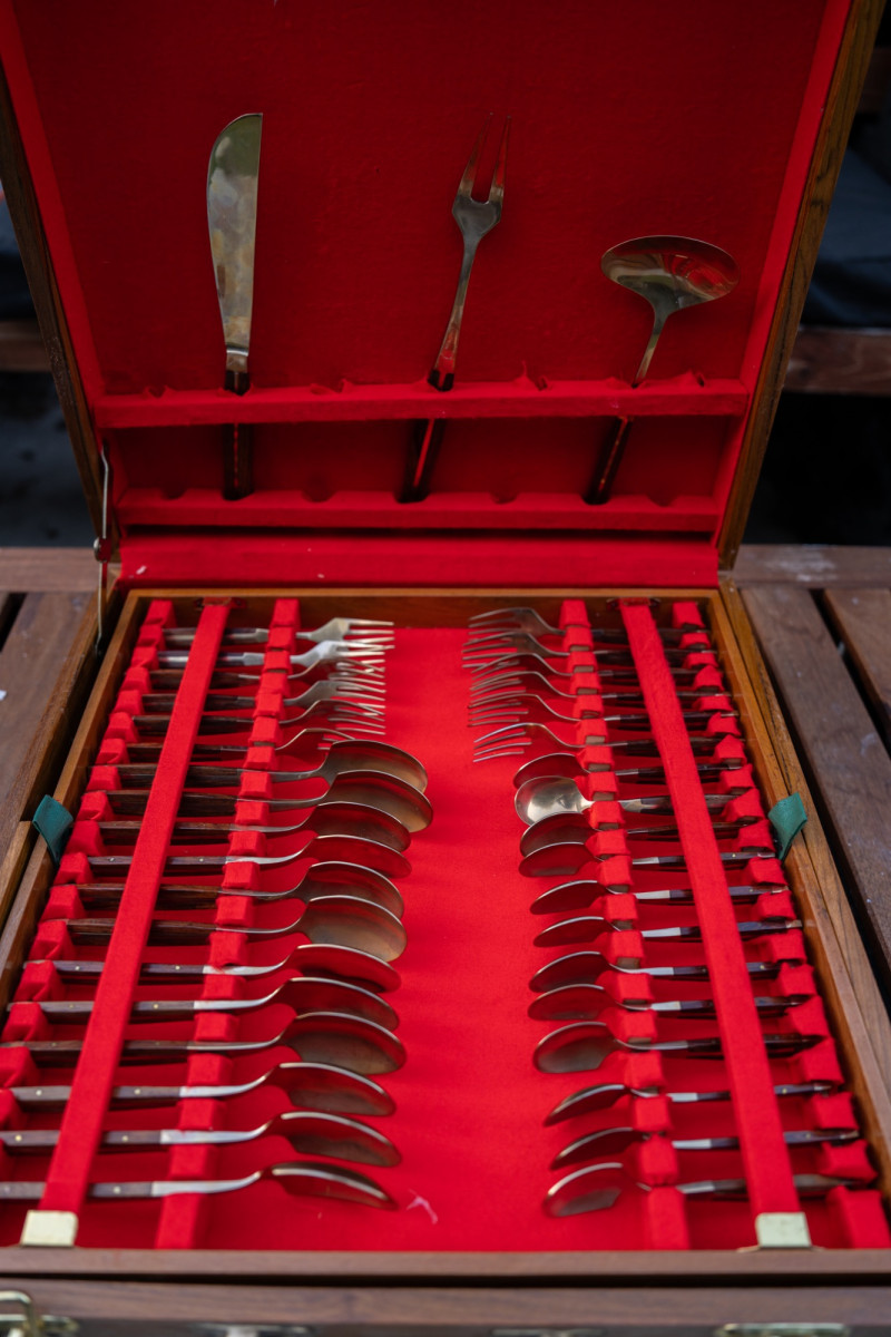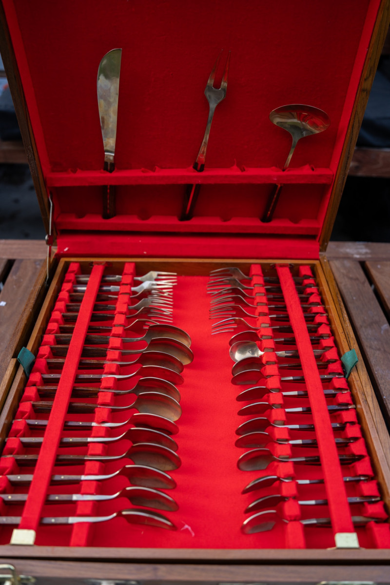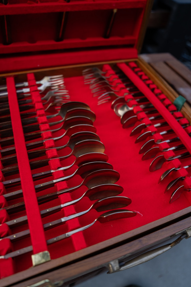 1950s Modernist Rosewood & Brass Inlay Flatware Set – 76 Pieces with Original Box This striking flatware set embodies the clean lines and warm contrasts of 1950s modernist design. Each piece features rosewood handles inlaid with brass, giving it a sleek, mid-century look that has become highly collectible today. Maker/Style: Attributed to 1950s modernist flatware makers in the style of Rosewood & Brass Inlay sets, similar to examples sold on 1stDibs. Material: Brass with rosewood inlay handles Count: 76 pieces total 7 large forks 12 small forks 11 small spoons 12 large spoons 12 small butter knives 12 large butter knives 7 steak knives 3 serving pieces (knife, fork, ladle) Box: Original wooden flatware chest with ornate brass handle and red felt interior (shows some wear consistent with age). Measurements (range): Forks & knives approx. 7"–9" long; serving utensils up to 11". Condition: Good vintage condition with some surface wear/tarnish on brass and minor handling wear on rosewood consistent with age. Box has scuffs and scratches but remains structurally sound. Value Note: A nearly identical 1950s rosewood & brass inlay flatware set of 87 pieces recently sold retail for $1,000. Given this set includes 76 pieces with its original box, it represents strong collector value and mid-century design appeal.