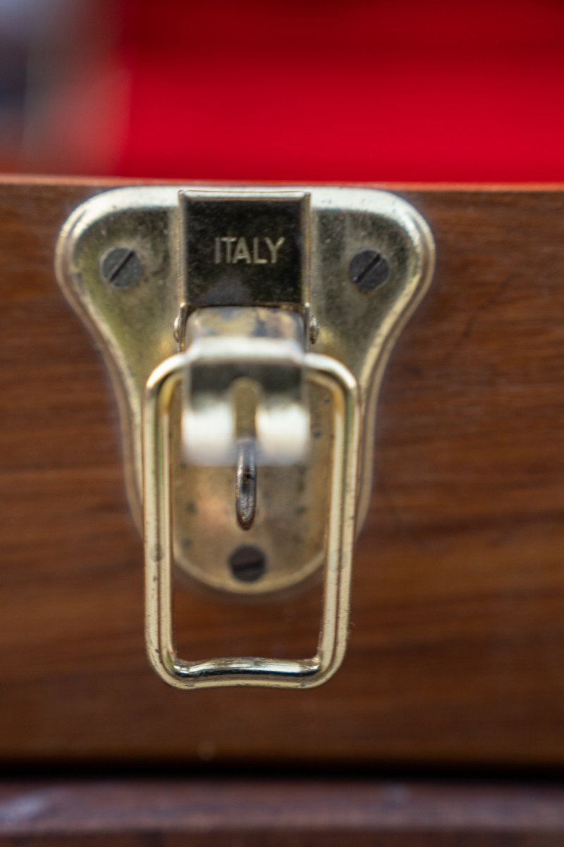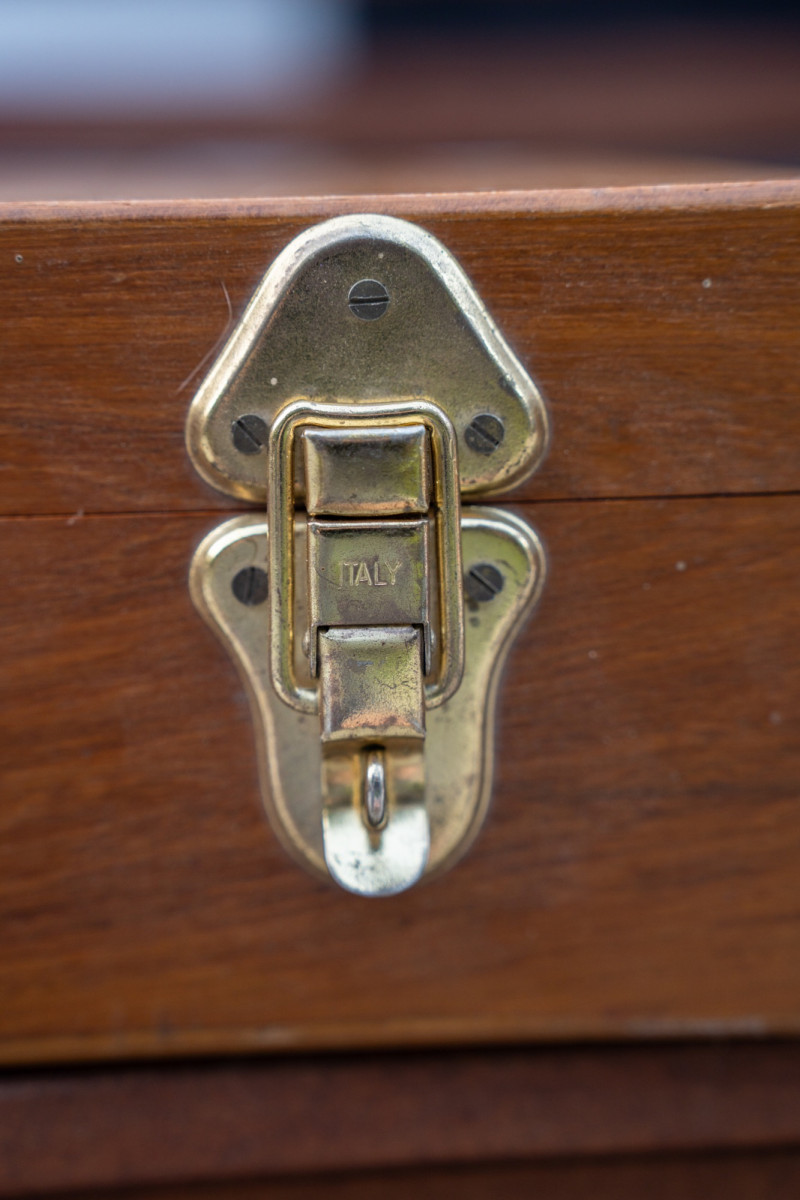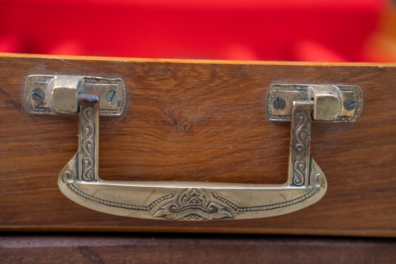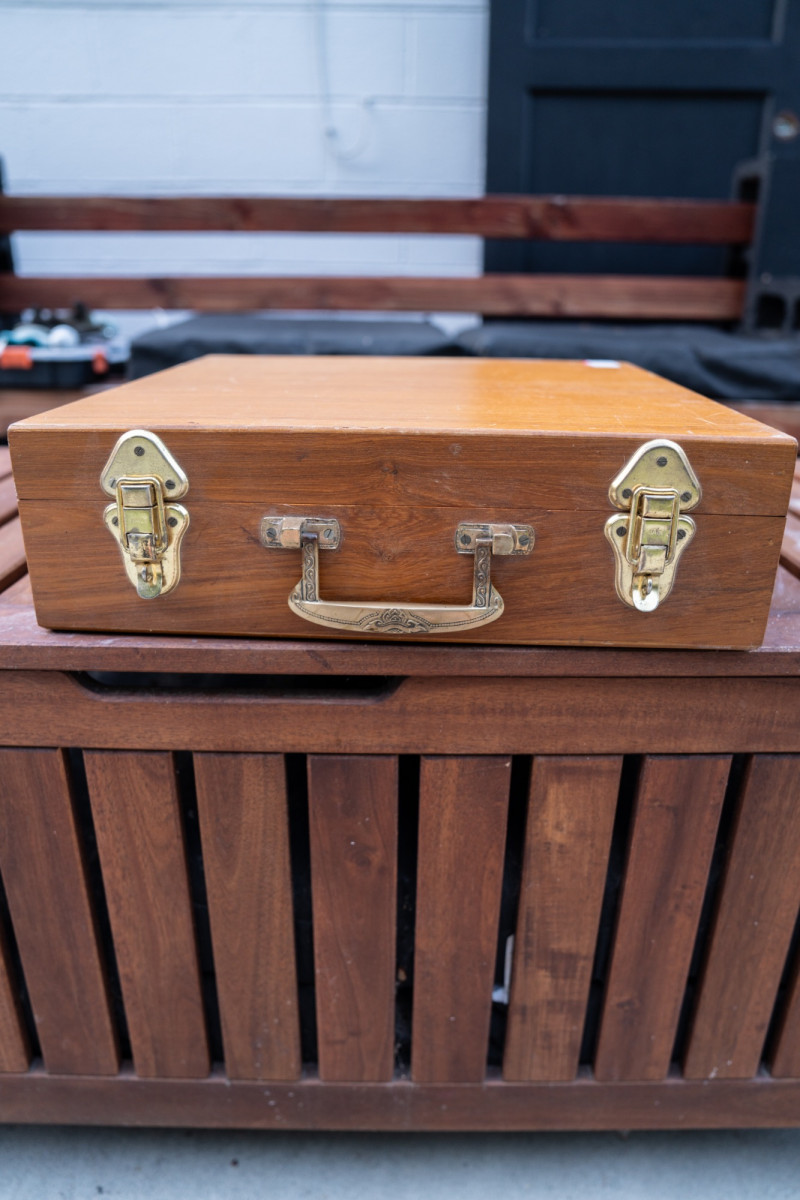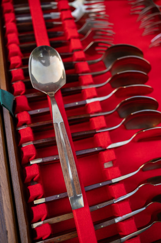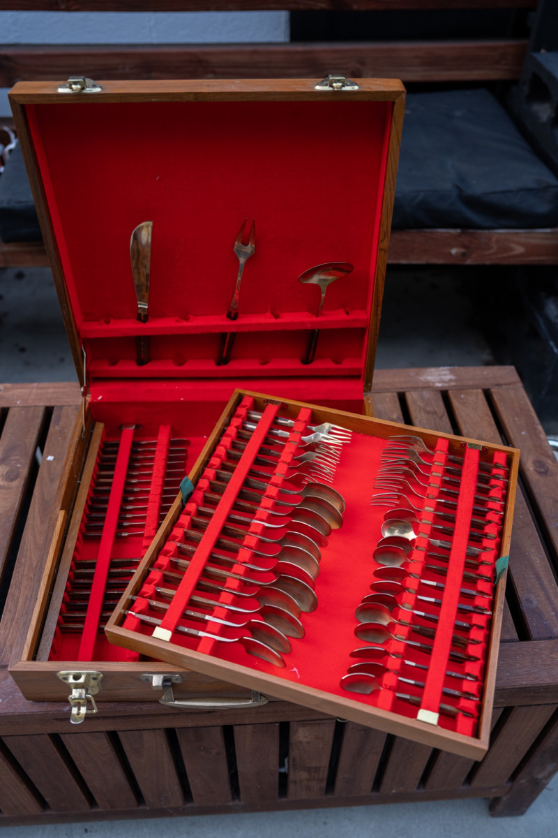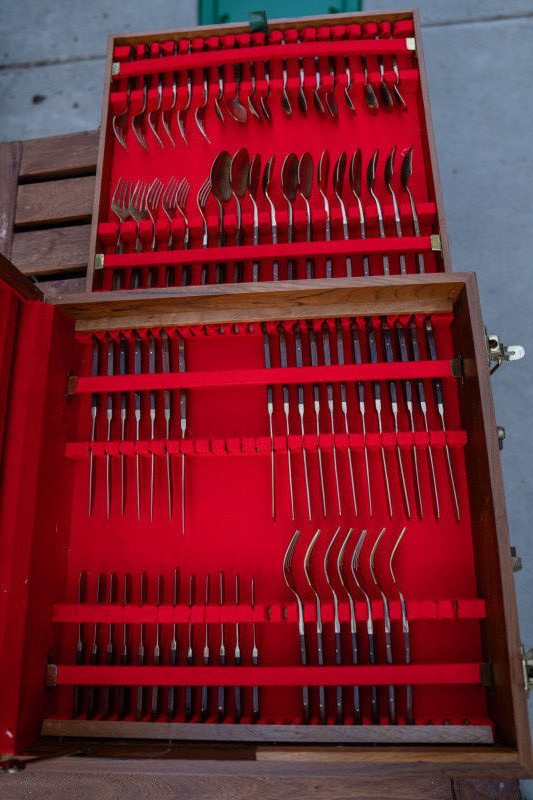 1950s Modernist Rosewood & Brass Inlay Flatware Set – 76 Pieces with Original Box This striking flatware set embodies the clean lines and warm contrasts of 1950s modernist design. Each piece features rosewood handles inlaid with brass, giving it a sleek, mid-century look that has become highly collectible today. Maker/Style: Attributed to 1950s modernist flatware makers in the style of Rosewood & Brass Inlay sets, similar to examples sold on 1stDibs. Material: Brass with rosewood inlay handles Count: 76 pieces total 7 large forks 12 small forks 11 small spoons 12 large spoons 12 small butter knives 12 large butter knives 7 steak knives 3 serving pieces (knife, fork, ladle) Box: Original wooden flatware chest with ornate brass handle and red felt interior (shows some wear consistent with age). Measurements (range): Forks & knives approx. 7"–9" long; serving utensils up to 11". Condition: Good vintage condition with some surface wear/tarnish on brass and minor handling wear on rosewood consistent with age. Box has scuffs and scratches but remains structurally sound. Value Note: A nearly identical 1950s rosewood & brass inlay flatware set of 87 pieces recently sold retail for $1,000. Given this set includes 76 pieces with its original box, it represents strong collector value and mid-century design appeal.