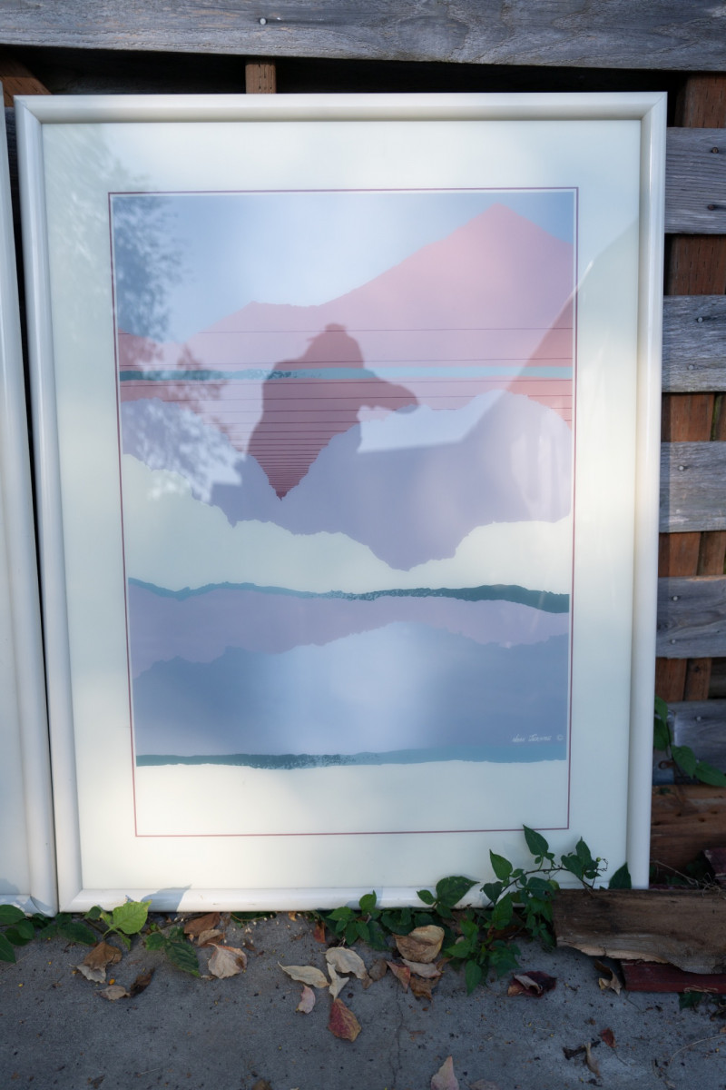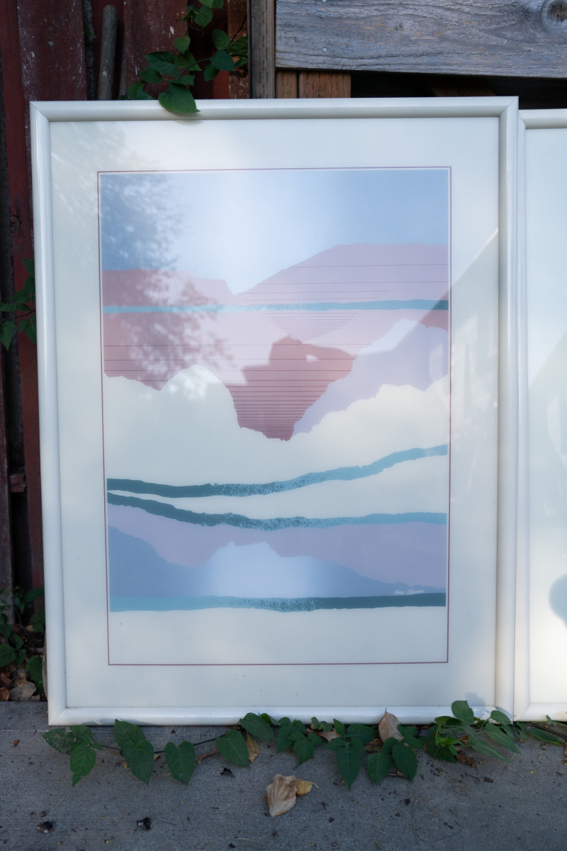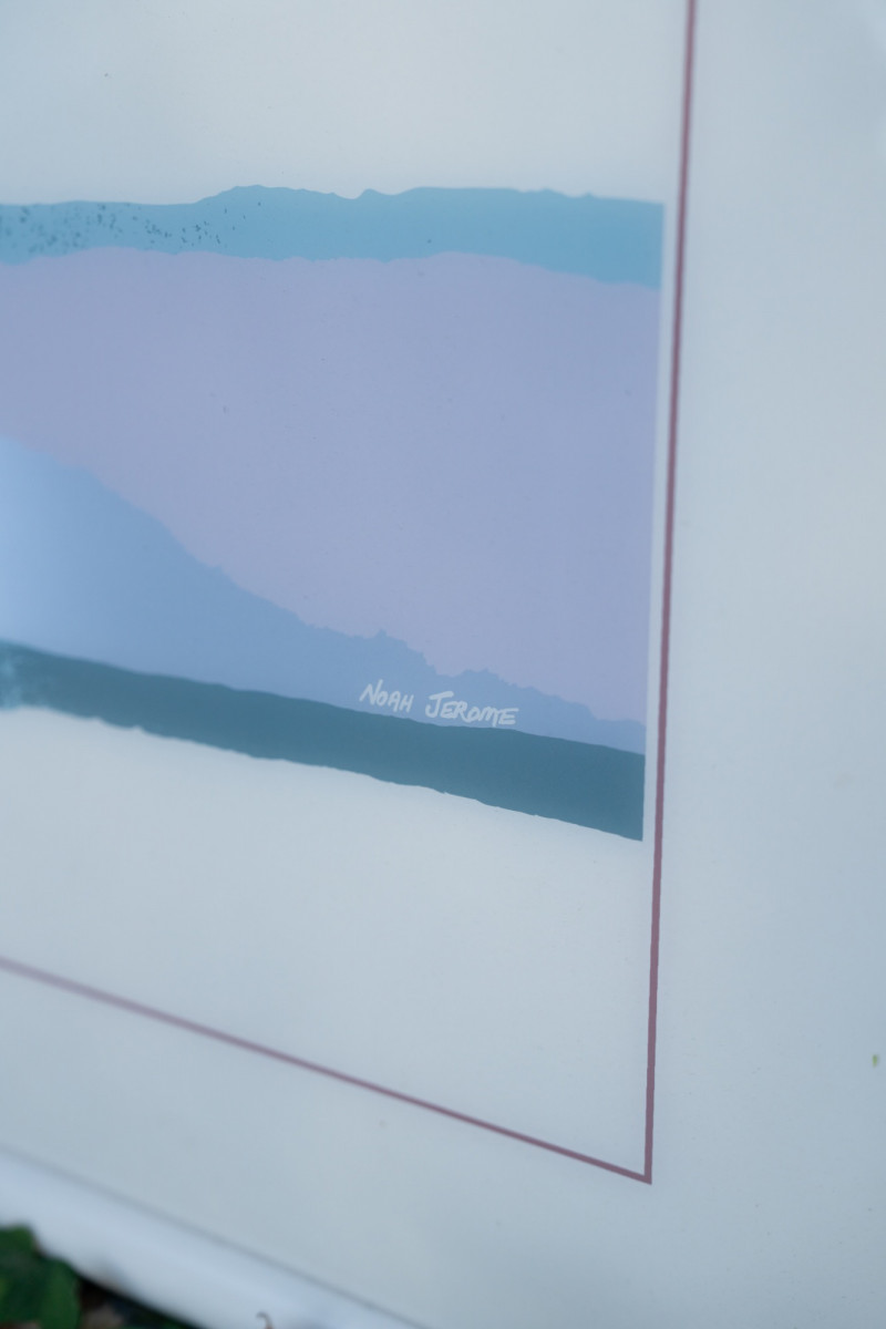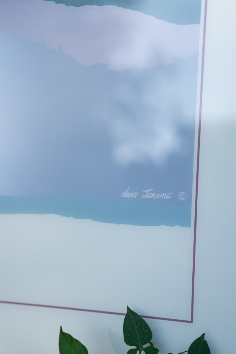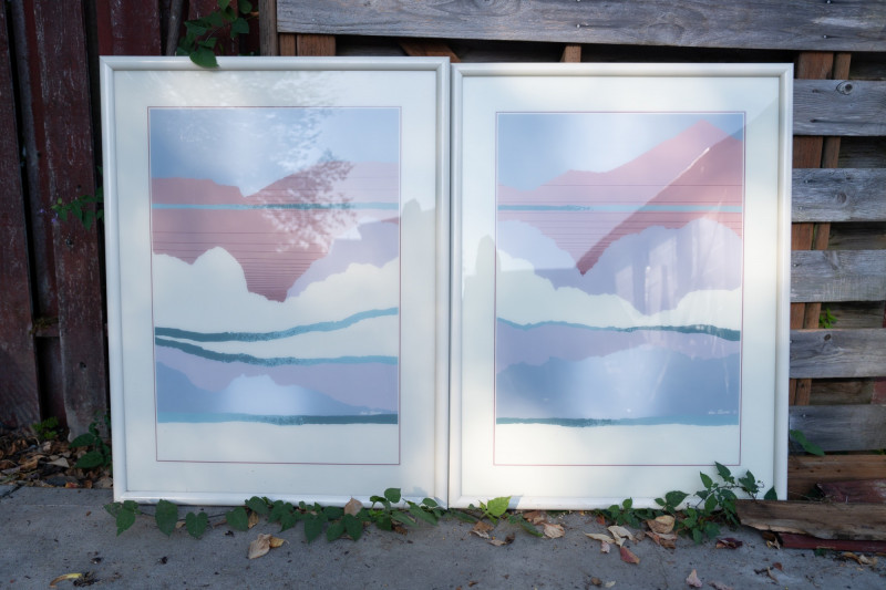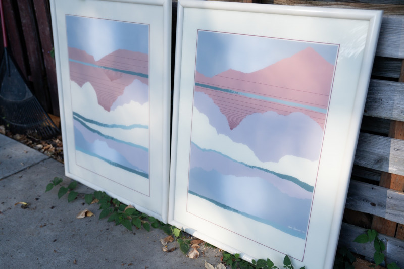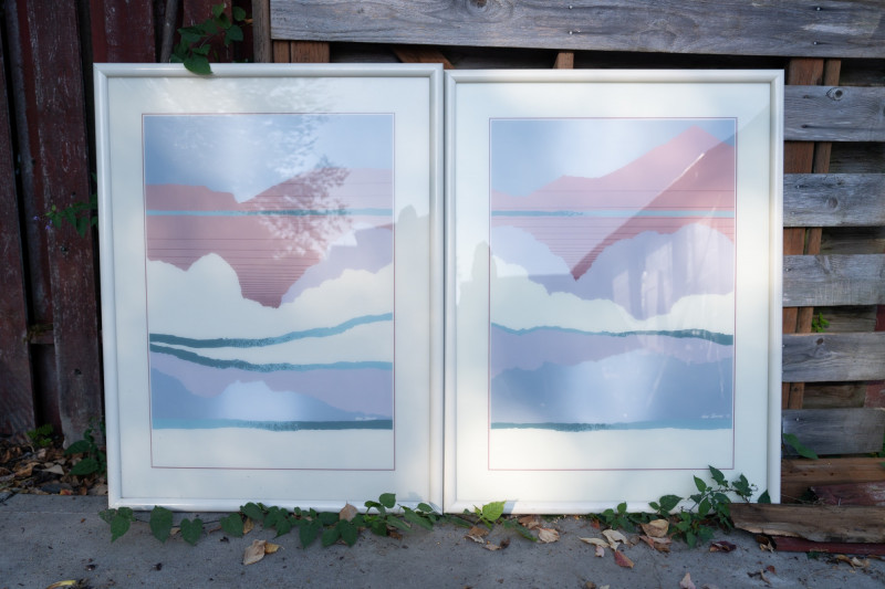 Pair of Vintage 1980s Postmodern Lithographs & Embossed Serigraphs by Noah Jerome – Limited Edition A striking pair of large-scale Postmodern prints by Noah Jerome, created in the 1980s and blending lithograph with embossed serigraph techniques. These signed limited editions capture a serene, layered landscape in soft pastel tones of mauve, lavender, teal, and cream — a quintessential reflection of late 20th-century Postmodern abstraction. Artist: Noah Jerome Era: 1980s Medium: Lithograph with embossed serigraph details, under glass Edition: Signed limited edition Style: Postmodern / Abstract Landscape Frames: Original white frames with mats Measurements: Each approx. 34" H × 26" W (framed) Condition: Excellent vintage condition; prints remain vivid, with light age-appropriate frame wear. Value: Similar pairs have been valued between $790–$950, highlighting their strong desirability among collectors of Postmodern art.