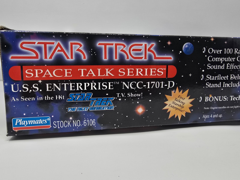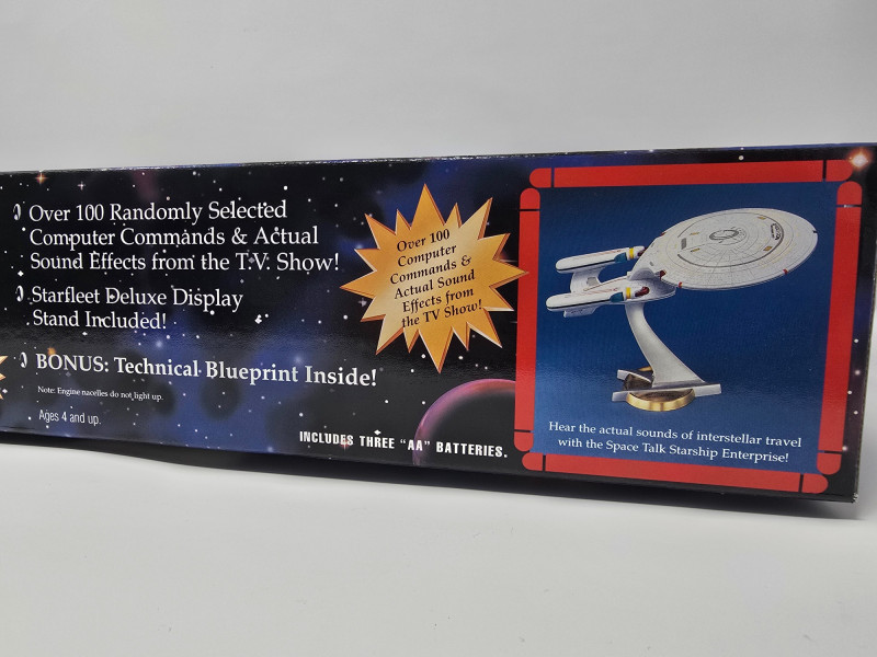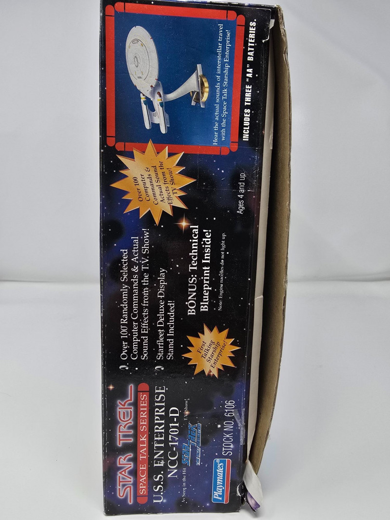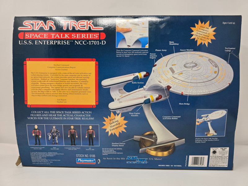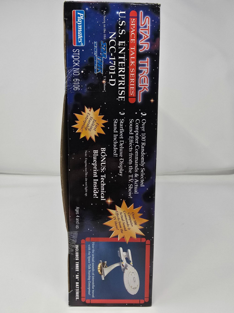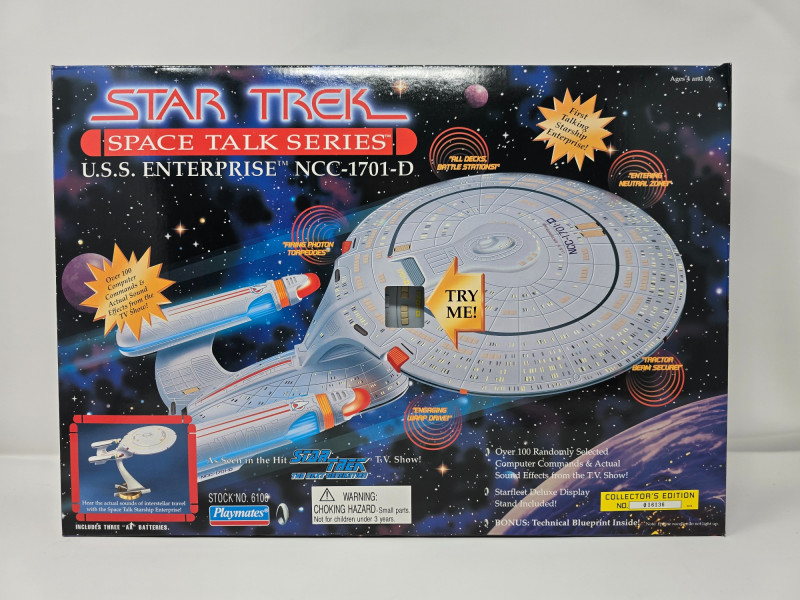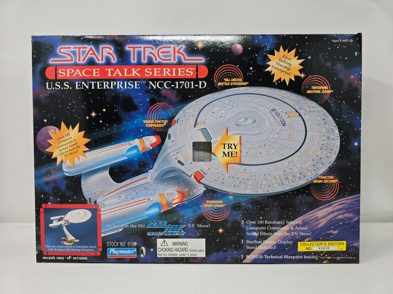Star Trek Space Talk Series U.S.S. Enterprise NCC-1701-D toy manufactured by Playmates. It is a collector's edition item. The toy features over 100 randomly selected computer commands and actual sound effects from the TV show. It includes a Starfleet Deluxe Display Stand. A bonus technical blueprint is included inside the box. The toy requires three "AA" batteries.