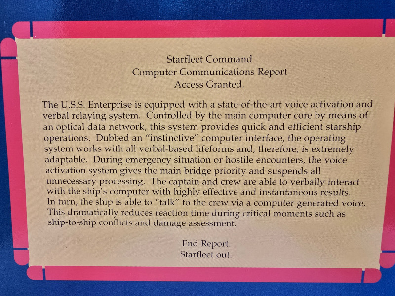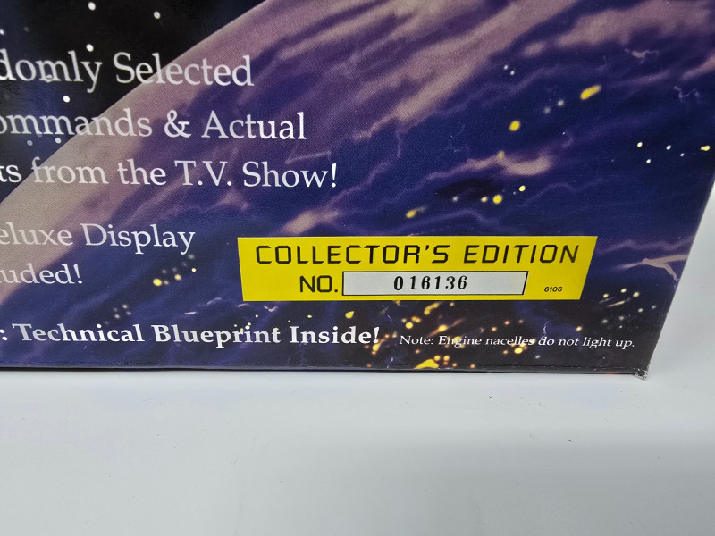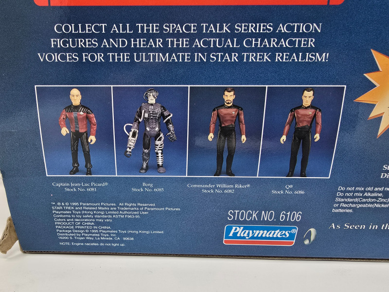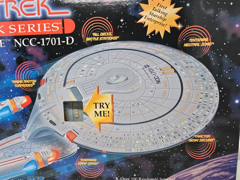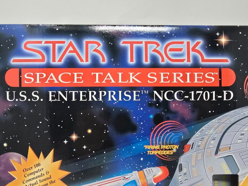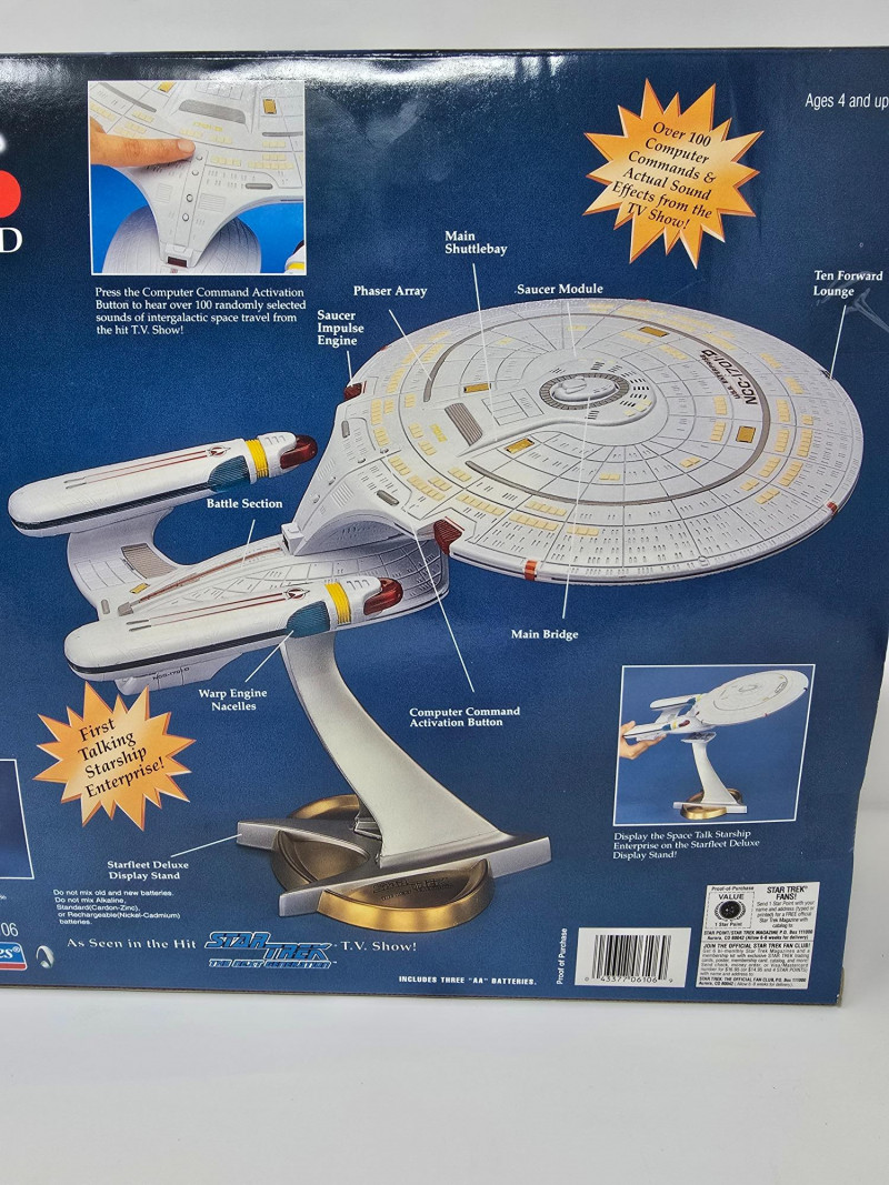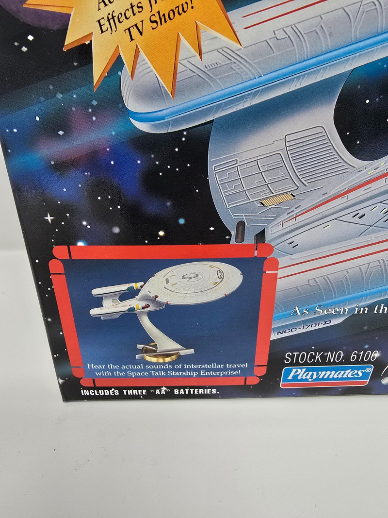 Star Trek Space Talk Series U.S.S. Enterprise NCC-1701-D toy manufactured by Playmates. It is a collector's edition item. The toy features over 100 randomly selected computer commands and actual sound effects from the TV show. It includes a Starfleet Deluxe Display Stand. A bonus technical blueprint is included inside the box. The toy requires three "AA" batteries.