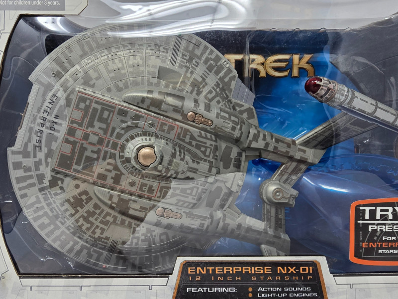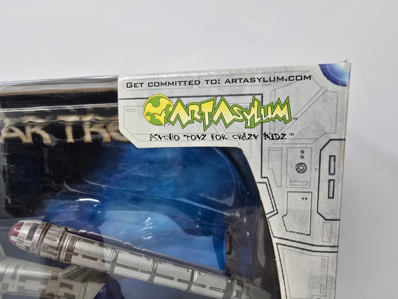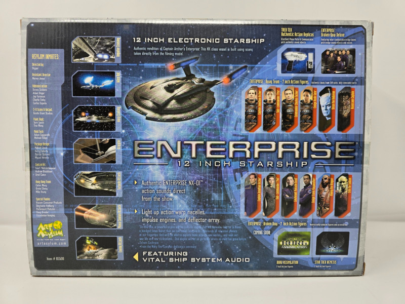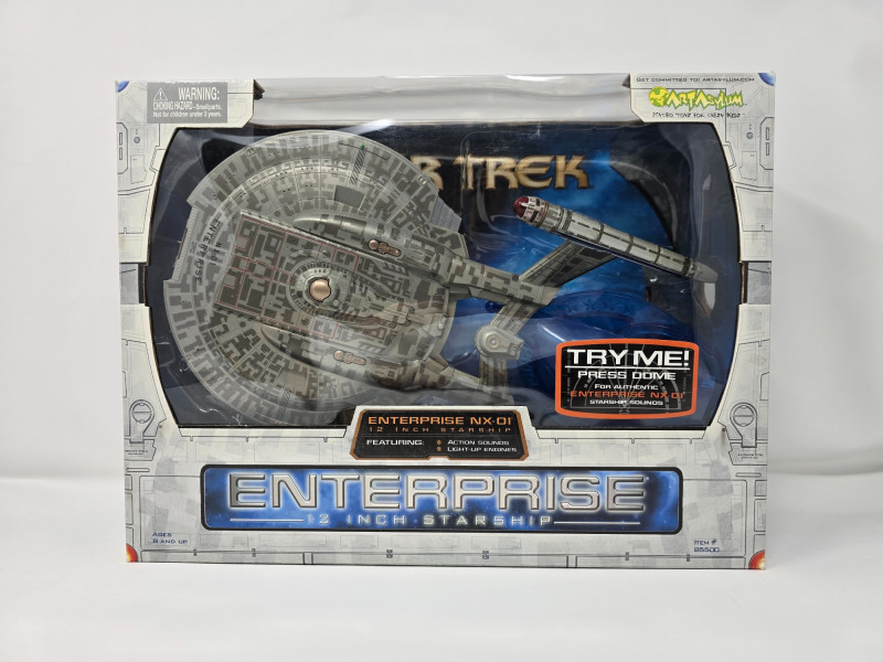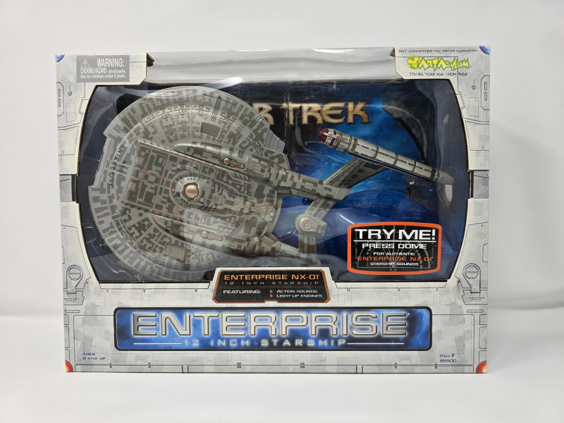 A boldly detailed tribute to the Star Trek: Enterprise series, this 12-inch electronic replica of the NX-01 starship features battle-damaged detailing and light-up nacelles. Produced by Art Asylum, known for its high-fidelity Trek models, this version captures the grit and grandeur of Captain Archer’s pioneering vessel. Factory sealed in original packaging — never opened, ideal for display or preservation Electronic features include authentic sound effects and lighting (untested, as box remains sealed) Released circa early 2000s, part of Art Asylum’s premium collector line A must-have for fans of the prequel series and collectors seeking screen-accurate starship models