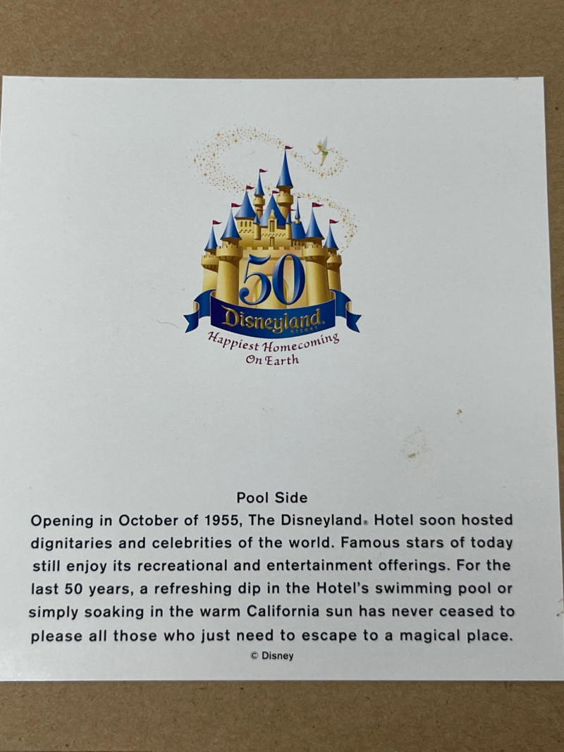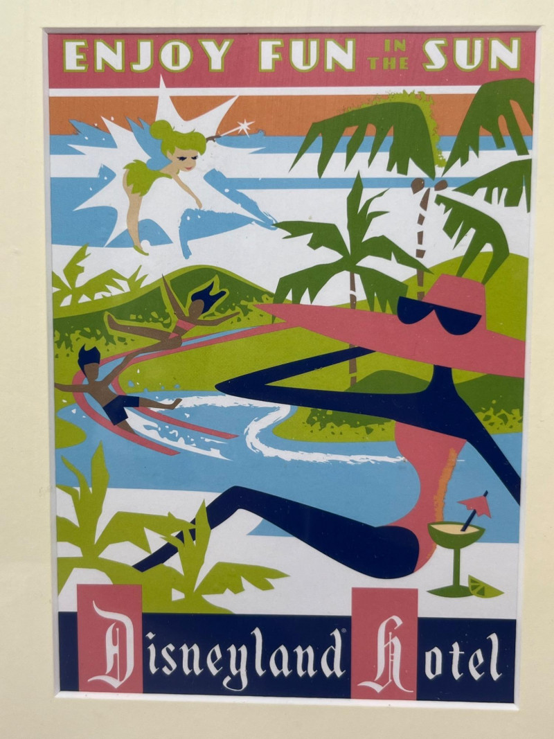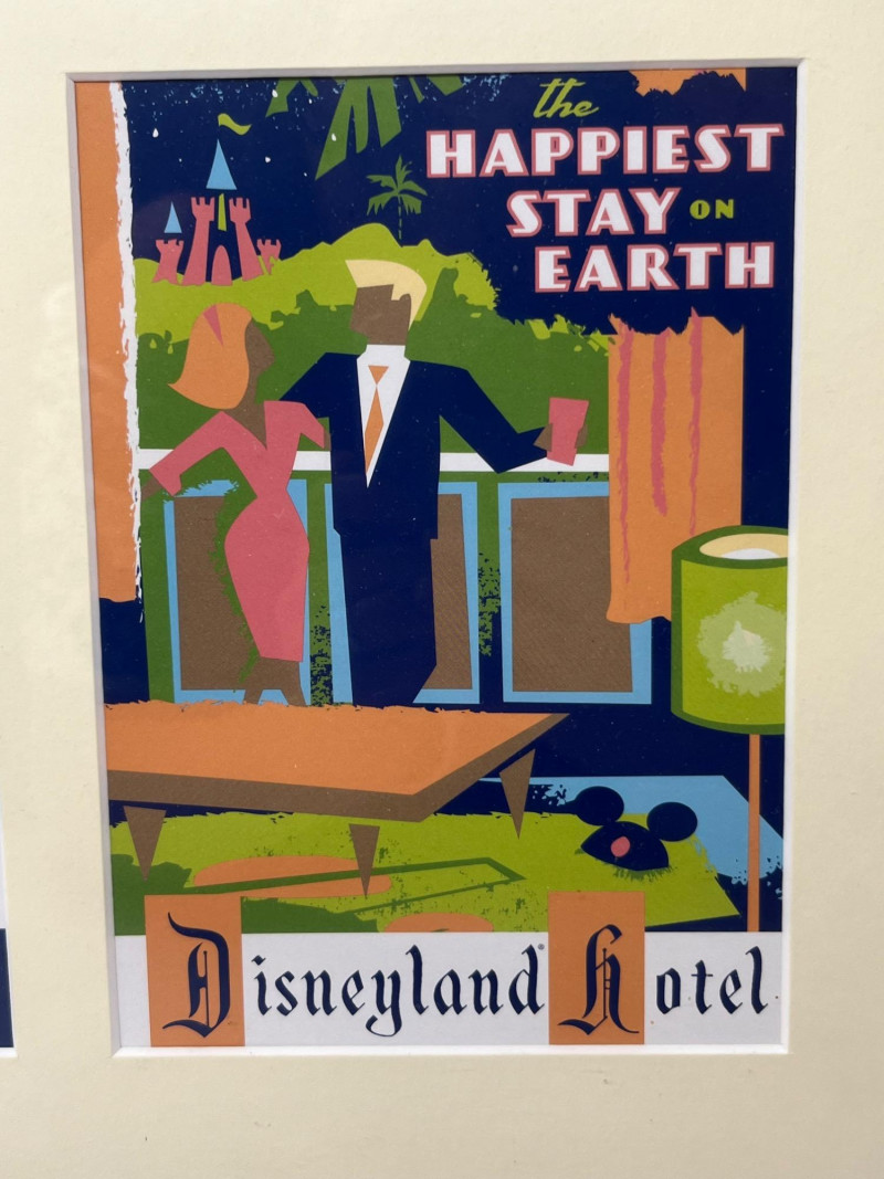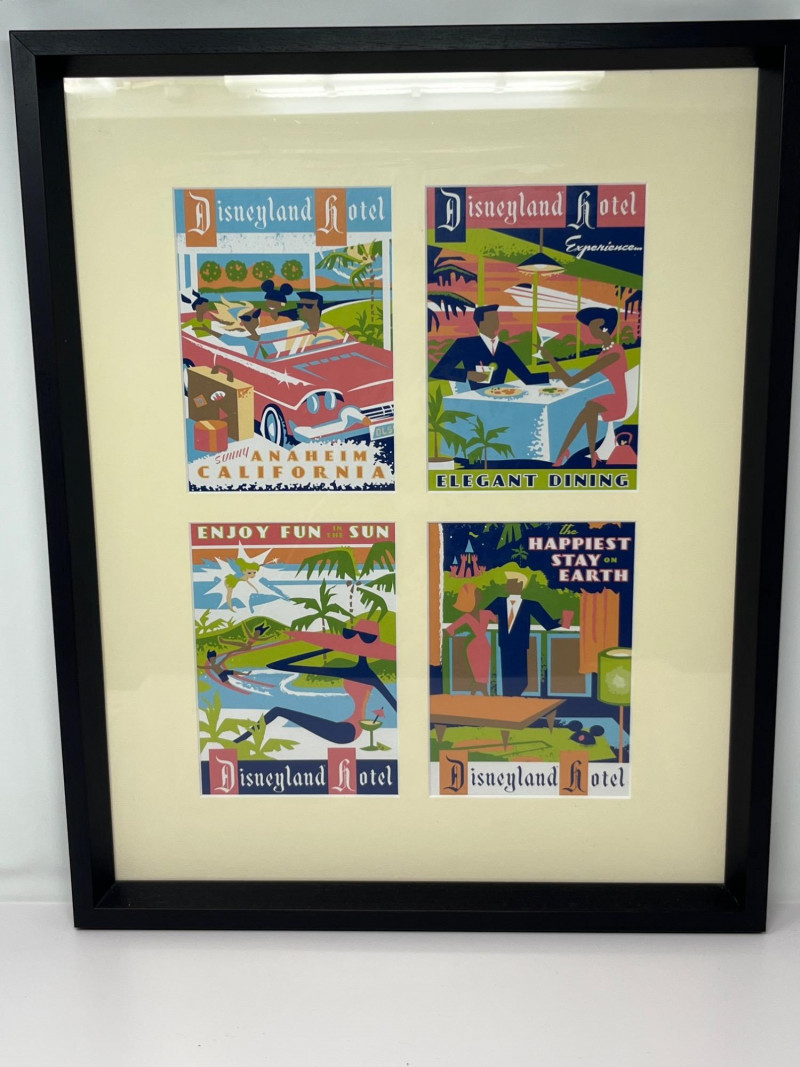 A framed collection of four vintage-style Disneyland Hotel prints, each celebrating a different facet of the iconic Anaheim resort experience. Rendered in bold mid-century modern illustration, the set captures the spirit of leisure, elegance, and family fun that defined the golden age of Disney hospitality. Top Left: Poolside relaxation with manicured grounds and retro architecture Top Right: Elegant outdoor dining with water views and palm-lined serenity Bottom Left: “Fun in the Sun” with flamingos, slides, and family joy Bottom Right: Nighttime comfort with fireworks and cozy hotel interiors Each Print: 5" x 7" Overall Frame Size: Approx. 17" x 21" Item Overview