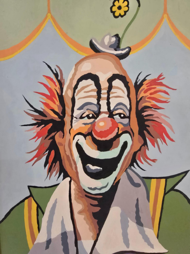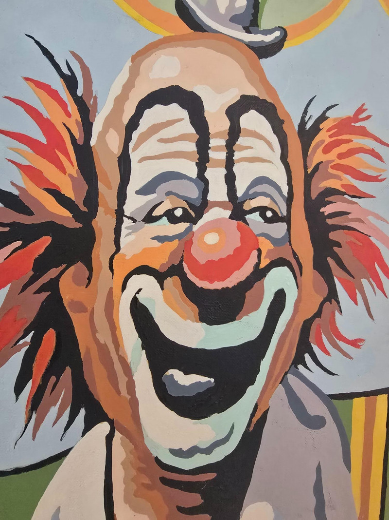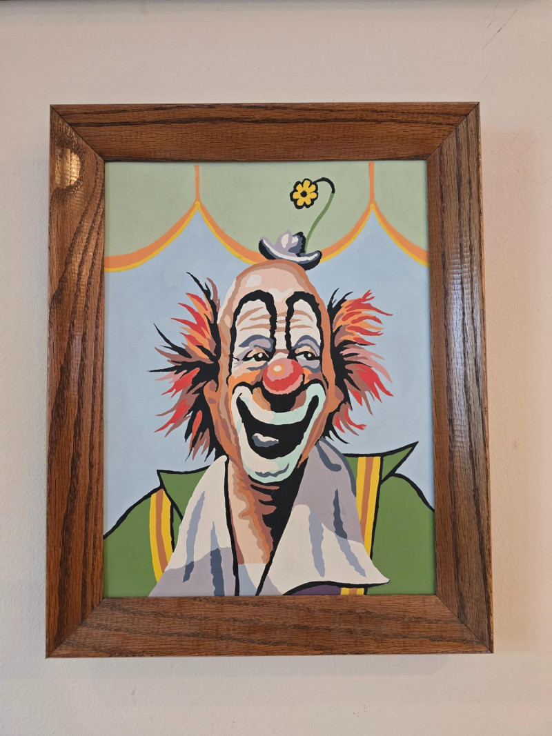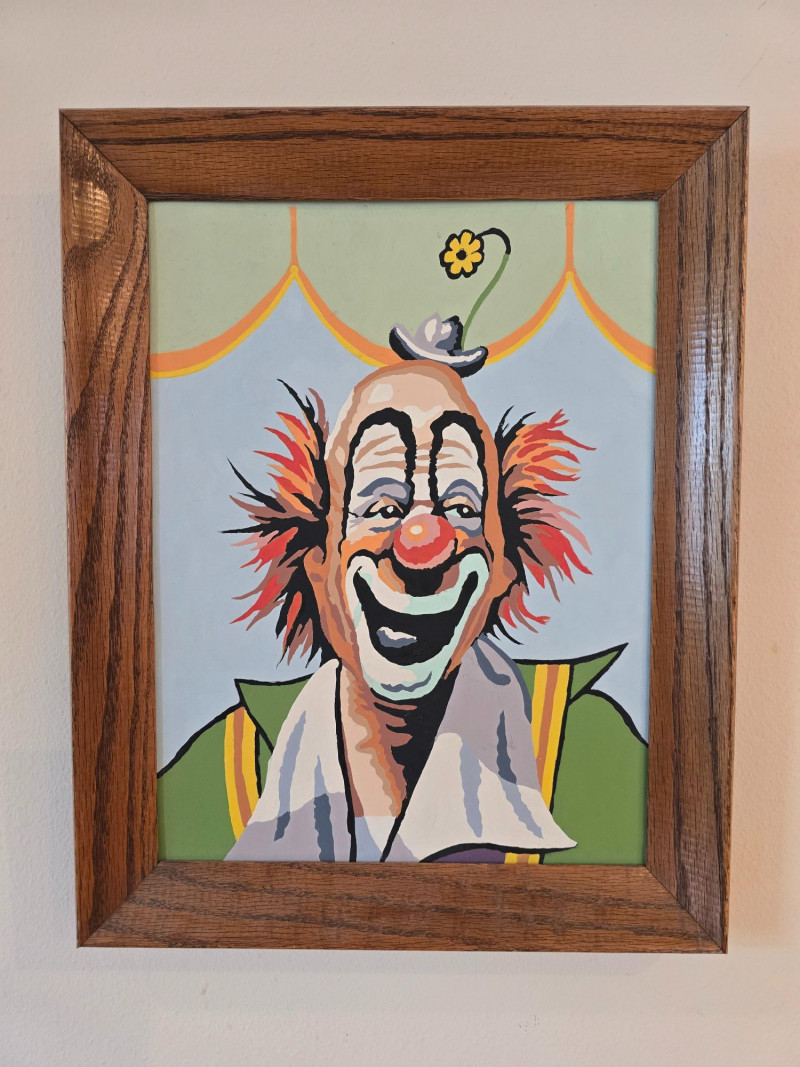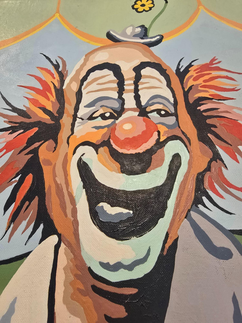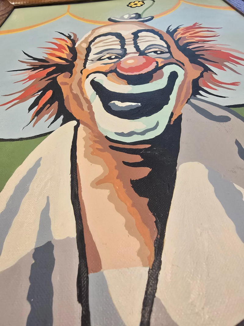 A vibrant and theatrical oil painting depicting Bozo the Clown, the beloved mid-century television character known for his exaggerated features and playful charm. This unsigned piece captures Bozo’s iconic look: wild orange-red hair, a bulbous red nose, expressive black-lined eyes, and a tiny gray hat adorned with a single yellow flower. He’s dressed in a green suit with yellow suspenders and a ruffled white collar, set against a circus-inspired backdrop of pale blue with a scalloped yellow-green border. Style: Folk art with pop culture resonance Frame: Dark wood with visible grain, adding rustic contrast to the saturated palette Mood: Whimsical with a theatrical edge—equal parts nostalgia and spectacleItem Overview