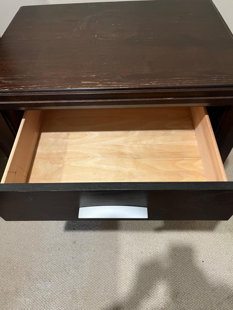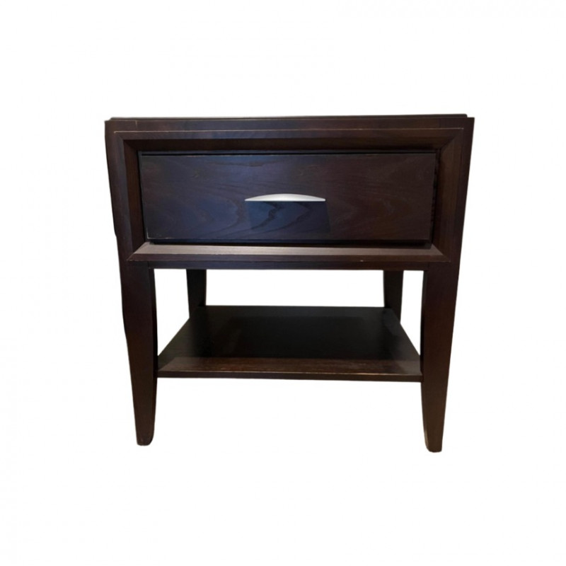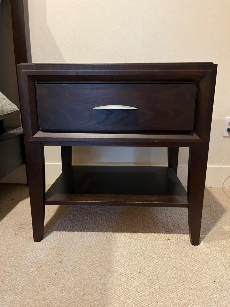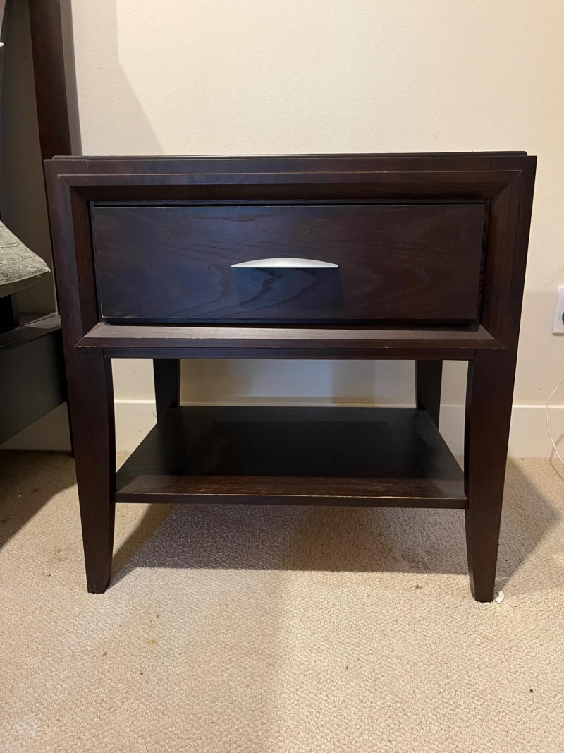 A gorgeous and sleek bedside or couch side table with a storage drawer. Made in Canada underside stamp. There is also a matching Queen Bedframe available in this auction in another lot. Design Features: Rich dark brown finish with clean lines and minimal hardware Flat top surface suitable for use as a lamp stand, accent table, or entryway perch Functionality: Ideal for storing linens, books, tech accessories, or seasonal décor Compact footprint makes it perfect for small-space living, dorms, or multipurpose rooms Condition: Appears structurally sound with light wear consistent with use