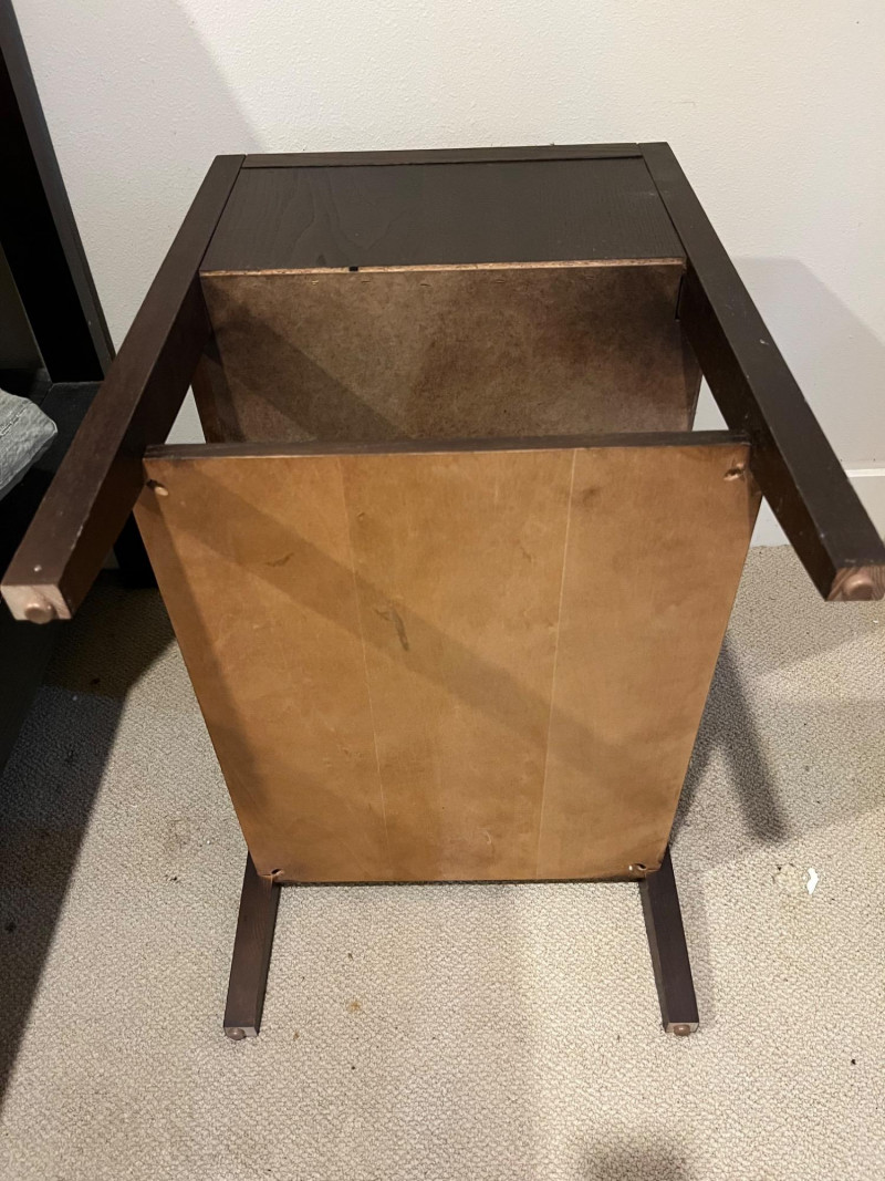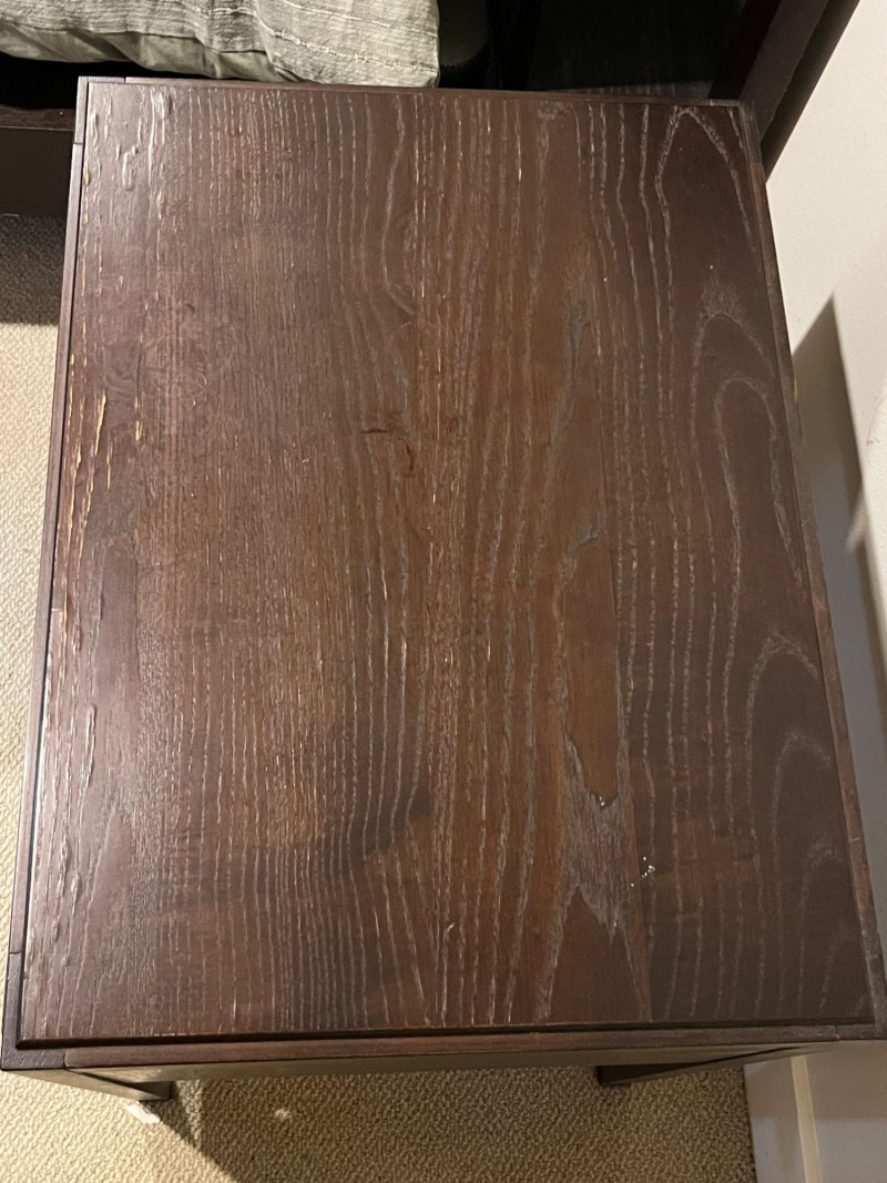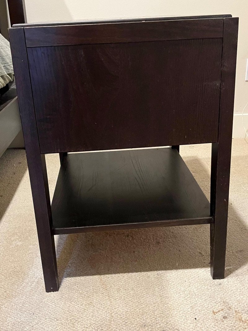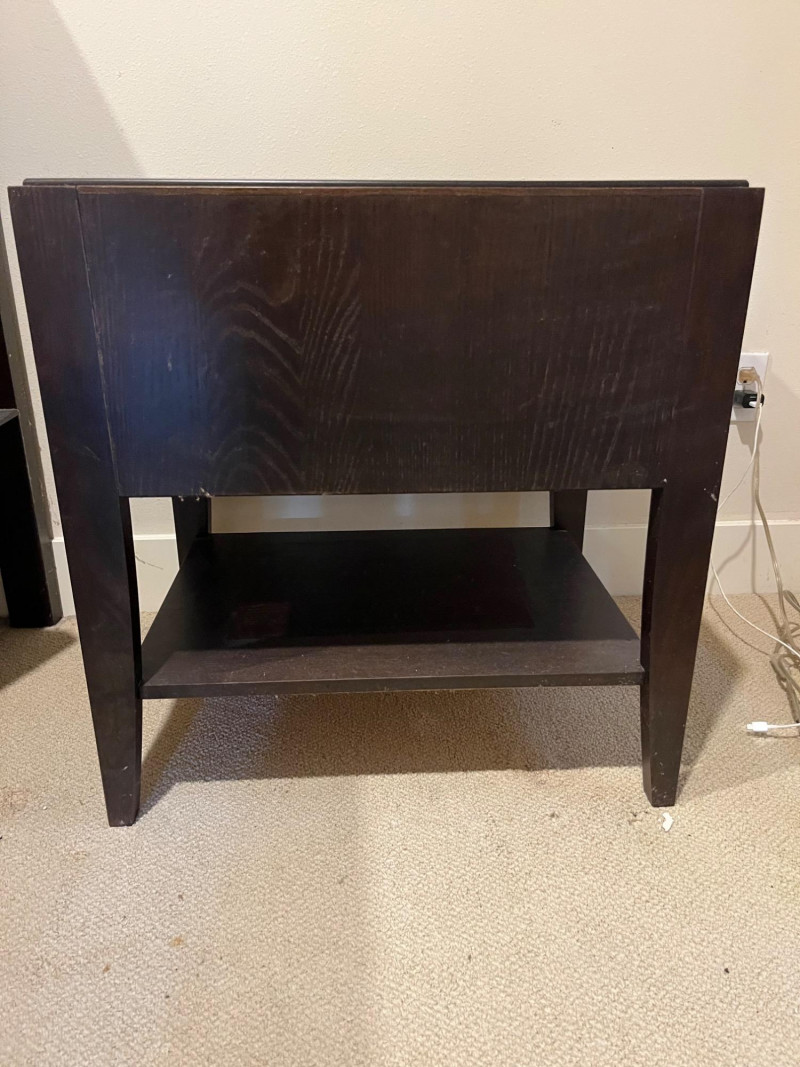 A gorgeous and sleek bedside or couch side table with a storage drawer. Made in Canada underside stamp. There is also a matching Queen Bedframe available in this auction in another lot. Design Features: Rich dark brown finish with clean lines and minimal hardware Flat top surface suitable for use as a lamp stand, accent table, or entryway perch Functionality: Ideal for storing linens, books, tech accessories, or seasonal décor Compact footprint makes it perfect for small-space living, dorms, or multipurpose rooms Condition: Appears structurally sound with light wear consistent with use