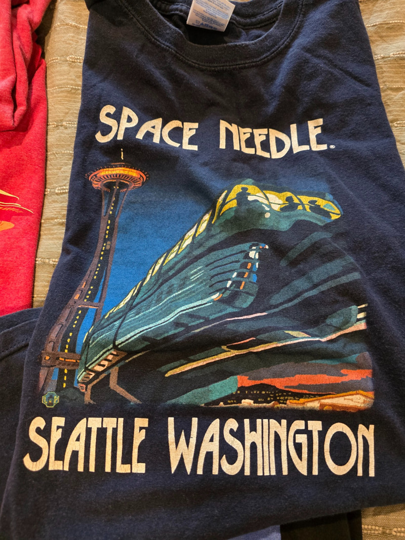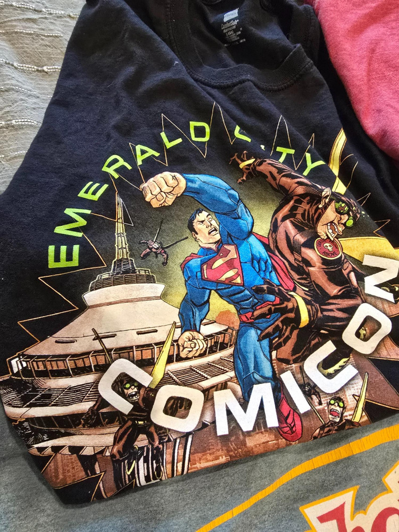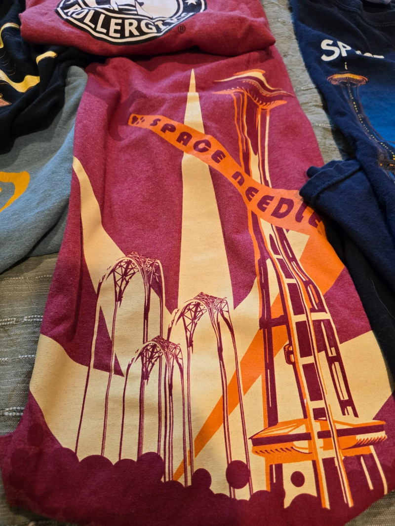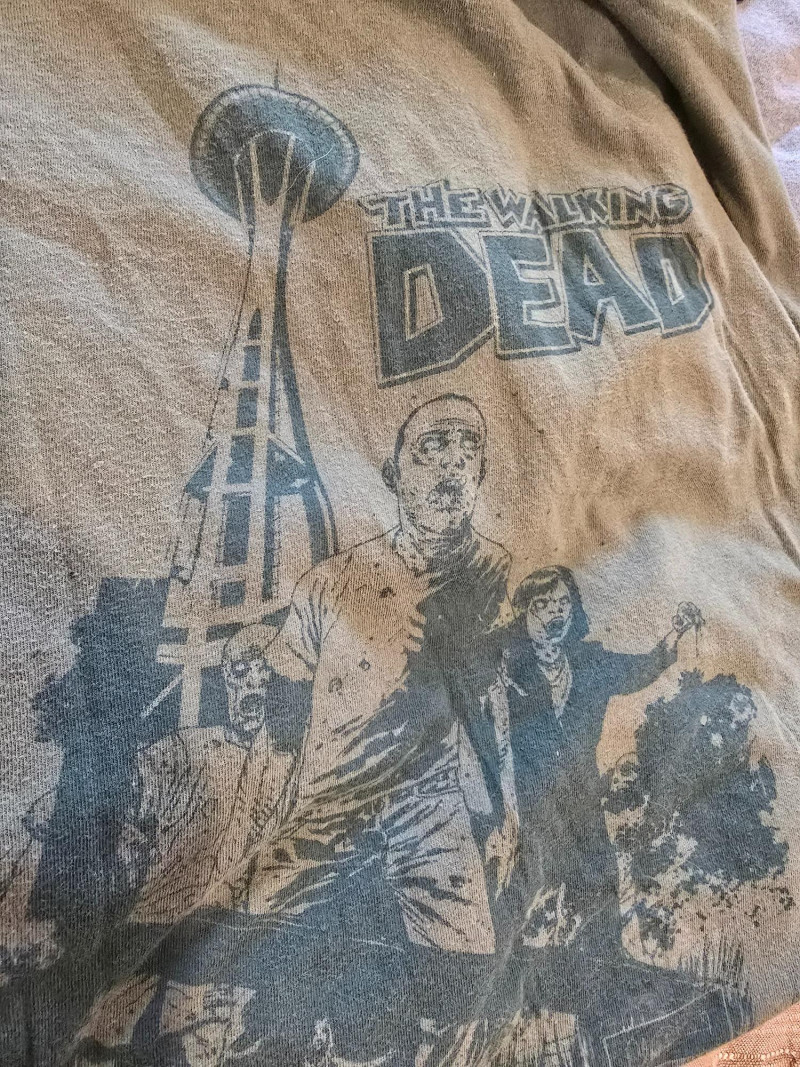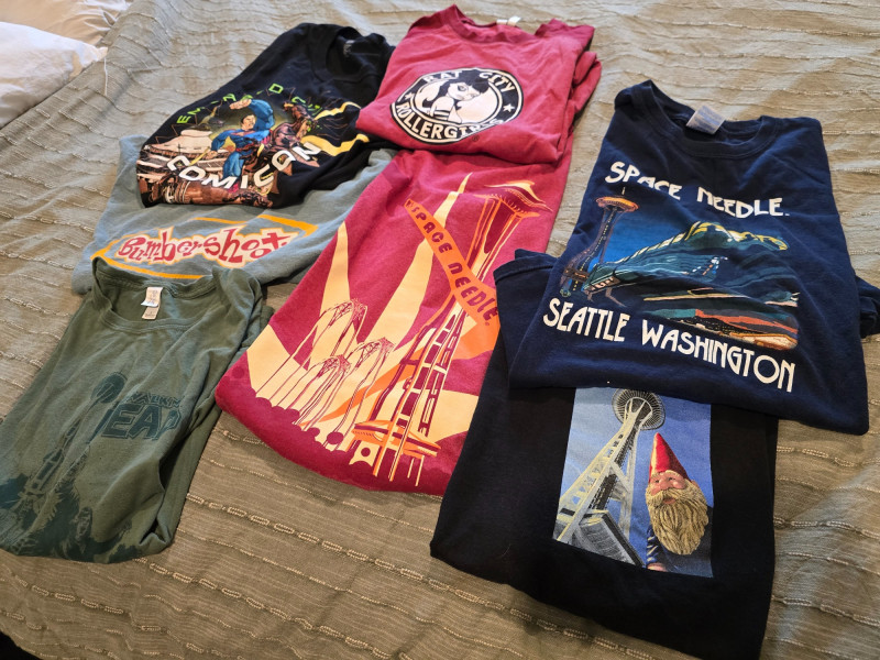 A wearable tribute to Seattle’s pop culture pulse, this lot includes five men’s size large graphic tees, each celebrating a different facet of the Emerald City—from roller derby grit to sci-fi fandom and retro festival flair. Included Shirts: Rat City Roller Girl Tee – Red shirt featuring bold derby graphics; local sports meets punk attitude The Walking Dead Seattle Edition – Zombies descend on the Space Needle in this apocalyptic crossover Emerald City Comic Con Superman Tee – Superman soars above the Needle; comic book hero meets skyline icon Retro Space Needle & Science Center Tee – Vintage-style print with mid-century vibes Classic Bumbershoot Festival Tee – Throwback design from Seattle’s beloved arts and music fest Size: Men’s Large (all shirts) Condition: Gently worn; no major flaws noted